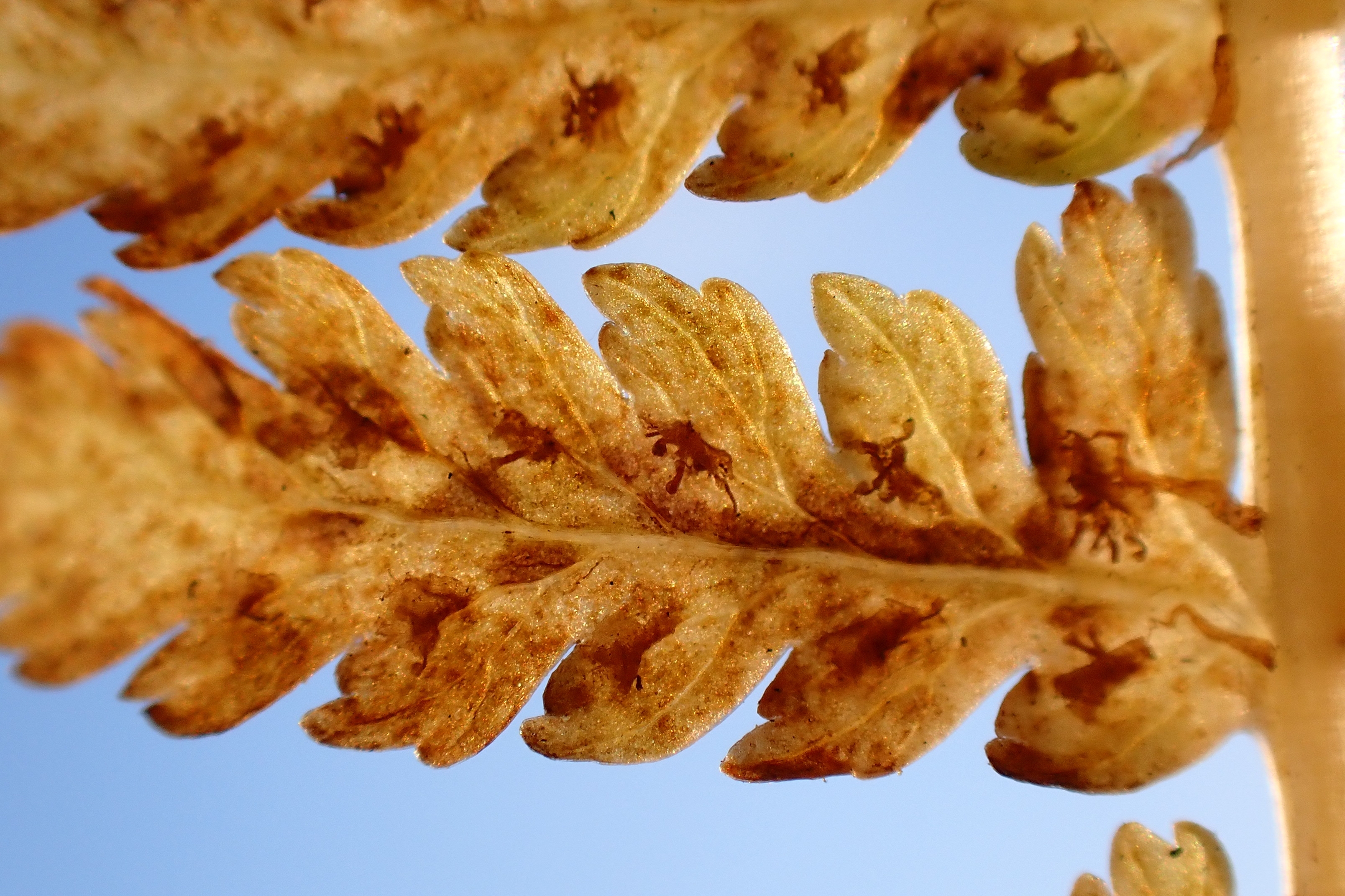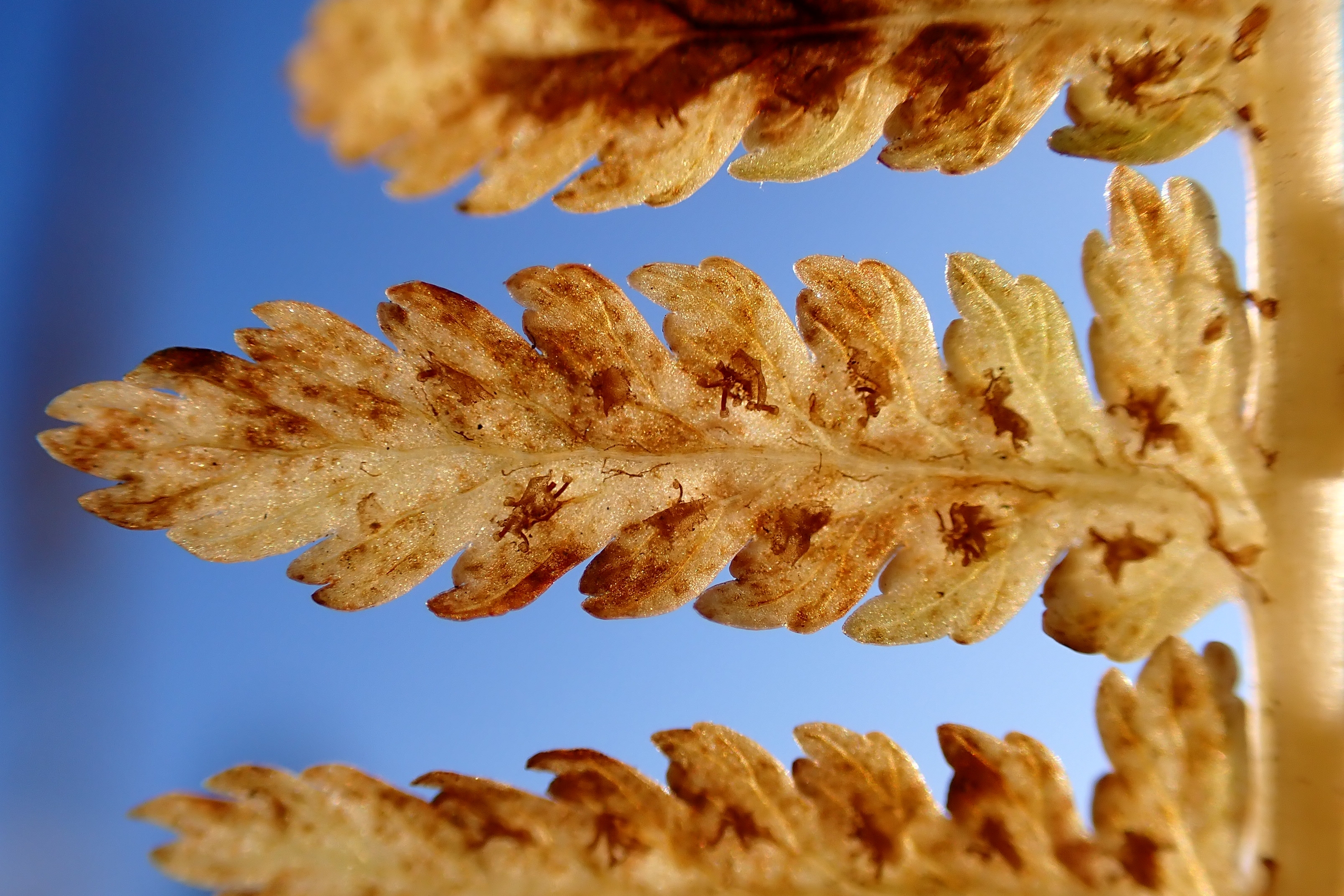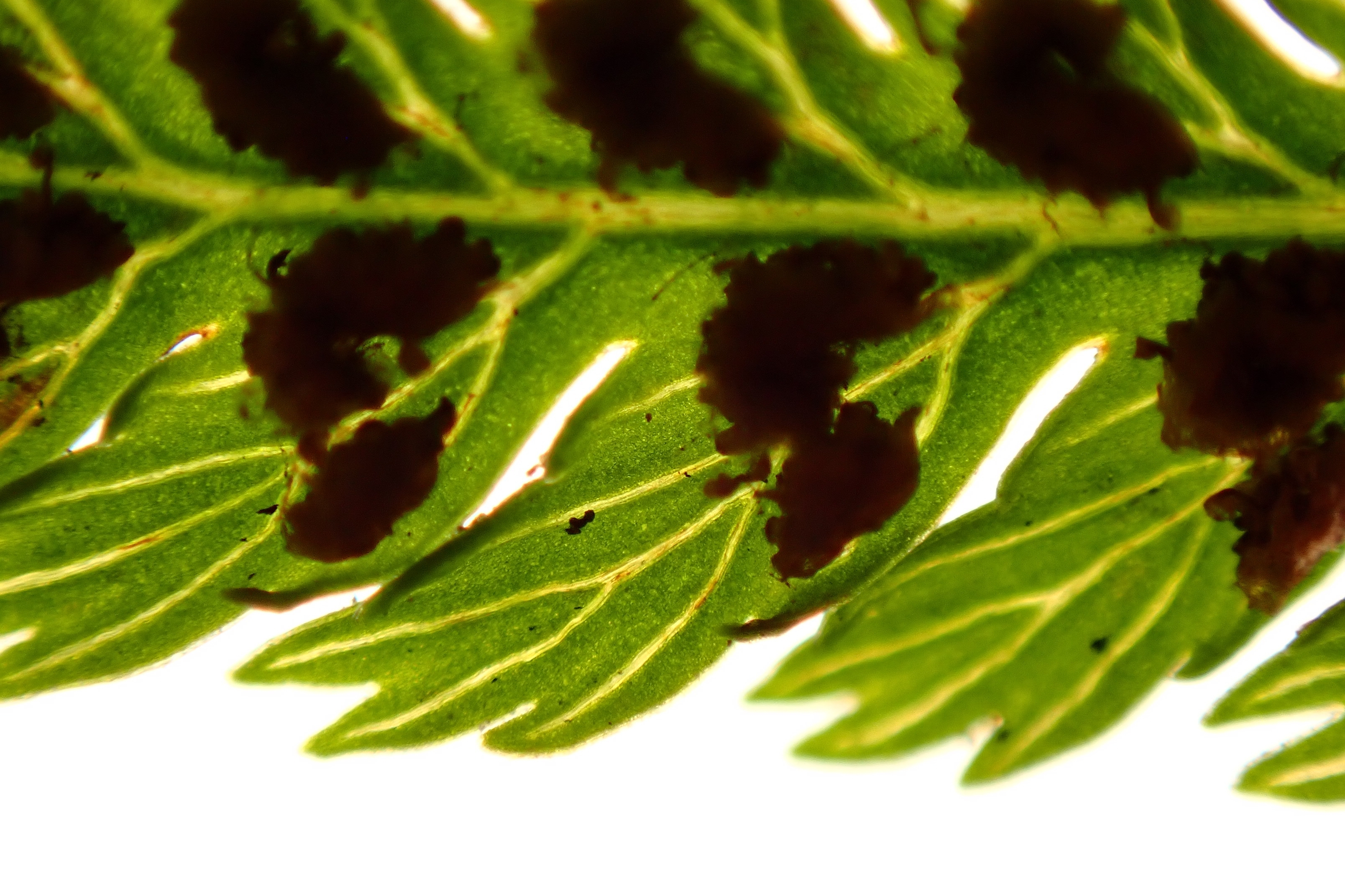 Deshalb: Bei älteren und/oder bereits etwas welken Wedeln mit leicht gekrümmten Fiederrändern kann das Nerven-Merkmal ein Murks und deshalb nicht sehr verlässlich sein. Bei den anderen Wedeln sollte es klappen, sofern die Nerven mit einer guten Lupe (10x war tipptopp) kontrolliert werden können. Die besten Erfahrungen hab ich bei Gegenlicht oder gegen eine weisse, besonnte Wand gemacht.