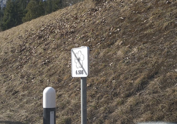 Diese Signalisation ist das Zeichen für den Strassenunterhalt, dass die Zone, welche aufgrund der speziellen Vegetation speziell gepflegt werden muss, aufhört. Zu Beginn der Zone ist ein Enzian-Blüten-Symbol. Sieht man aktuell v.a. in der Romandie, soll aber (wenn ich das richtig aufgeschnappt habe) auch in der restlichen CH umgesetzt werden.
