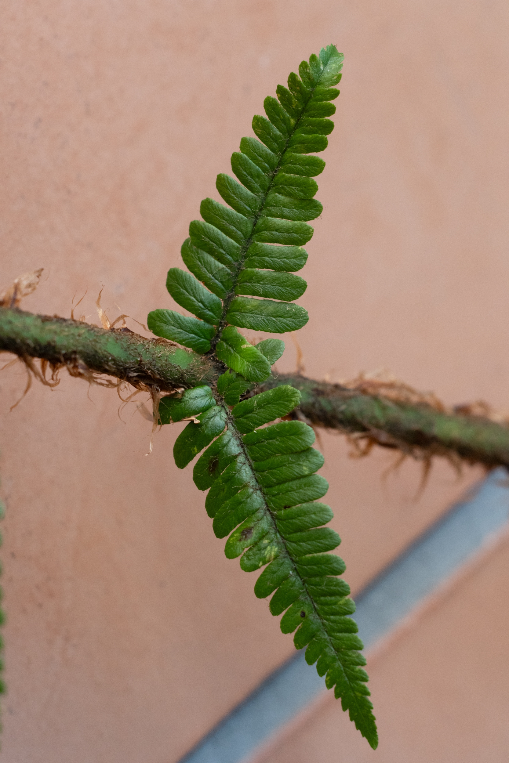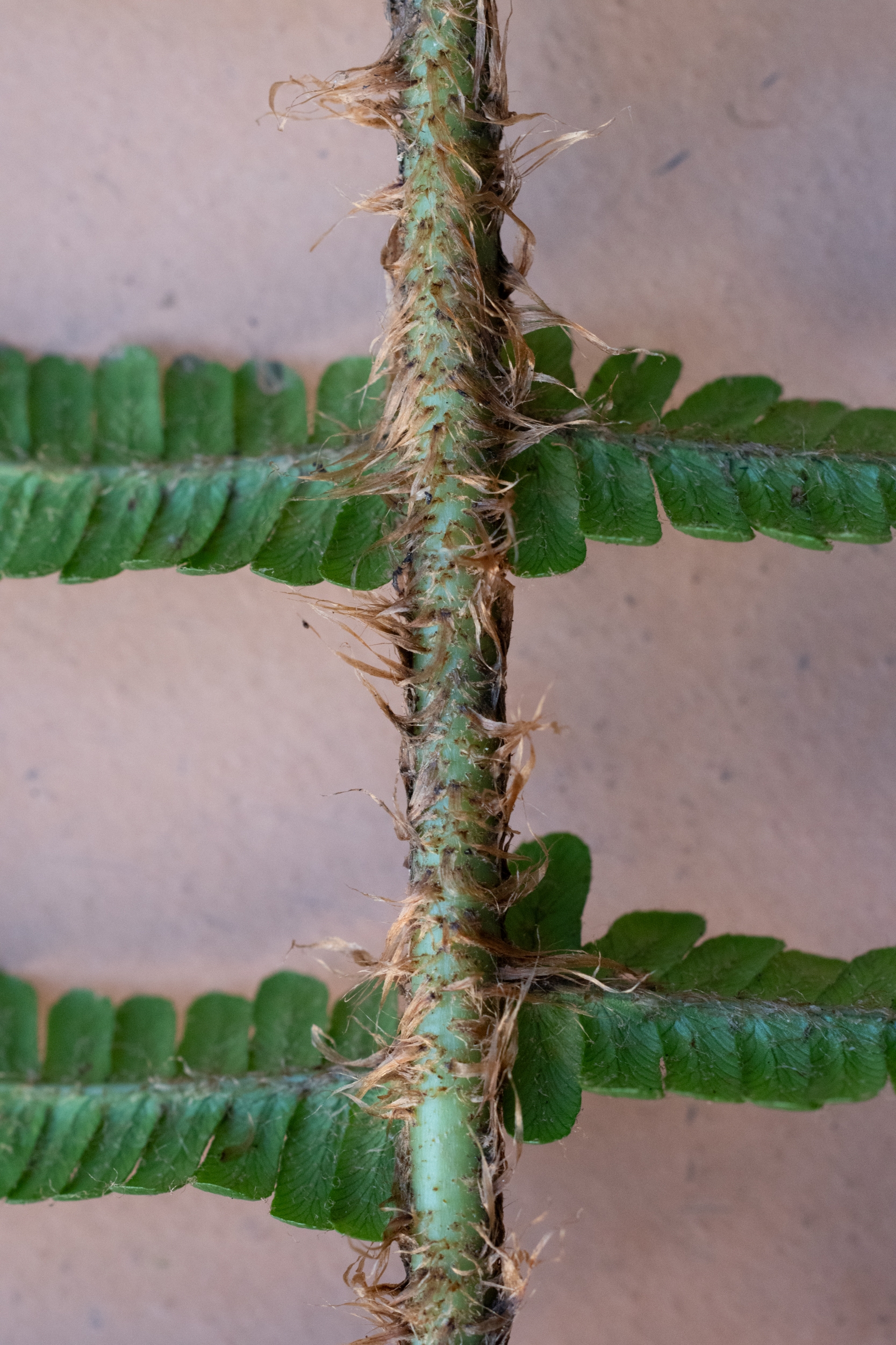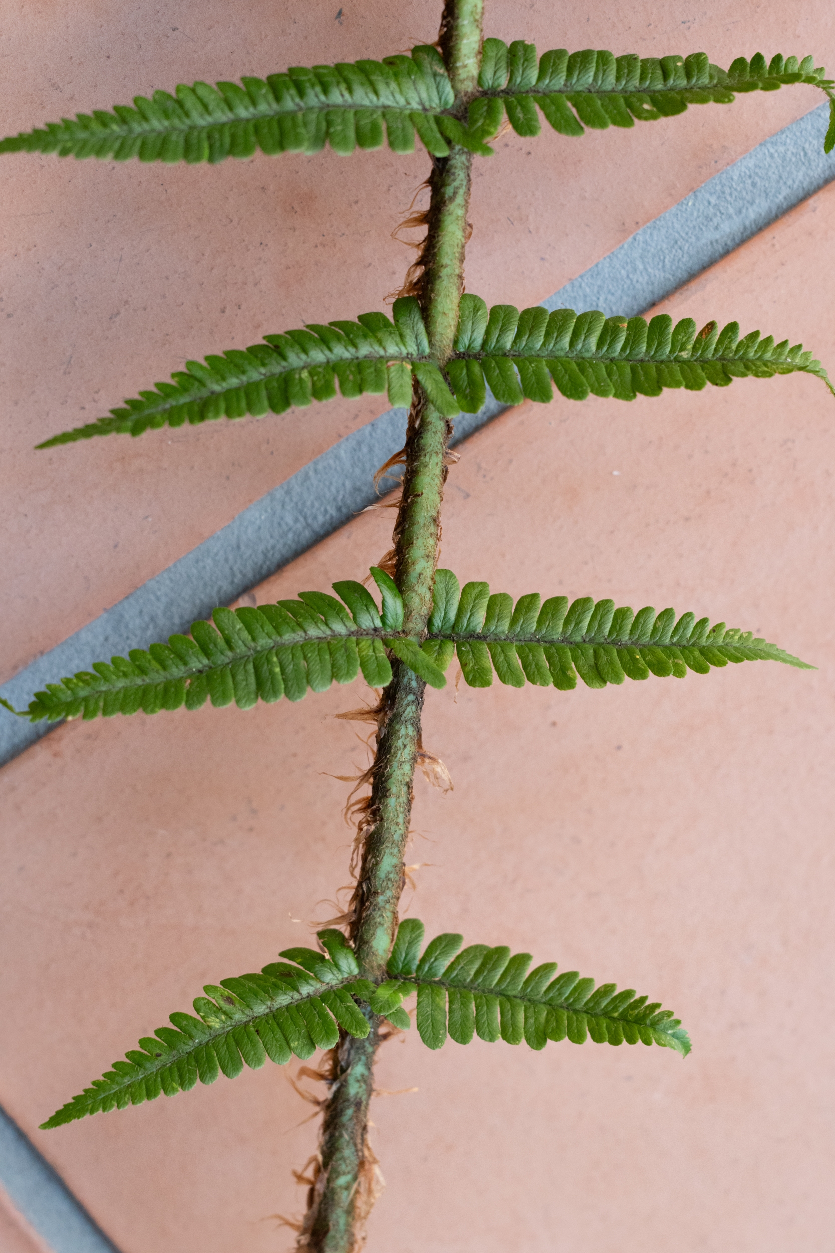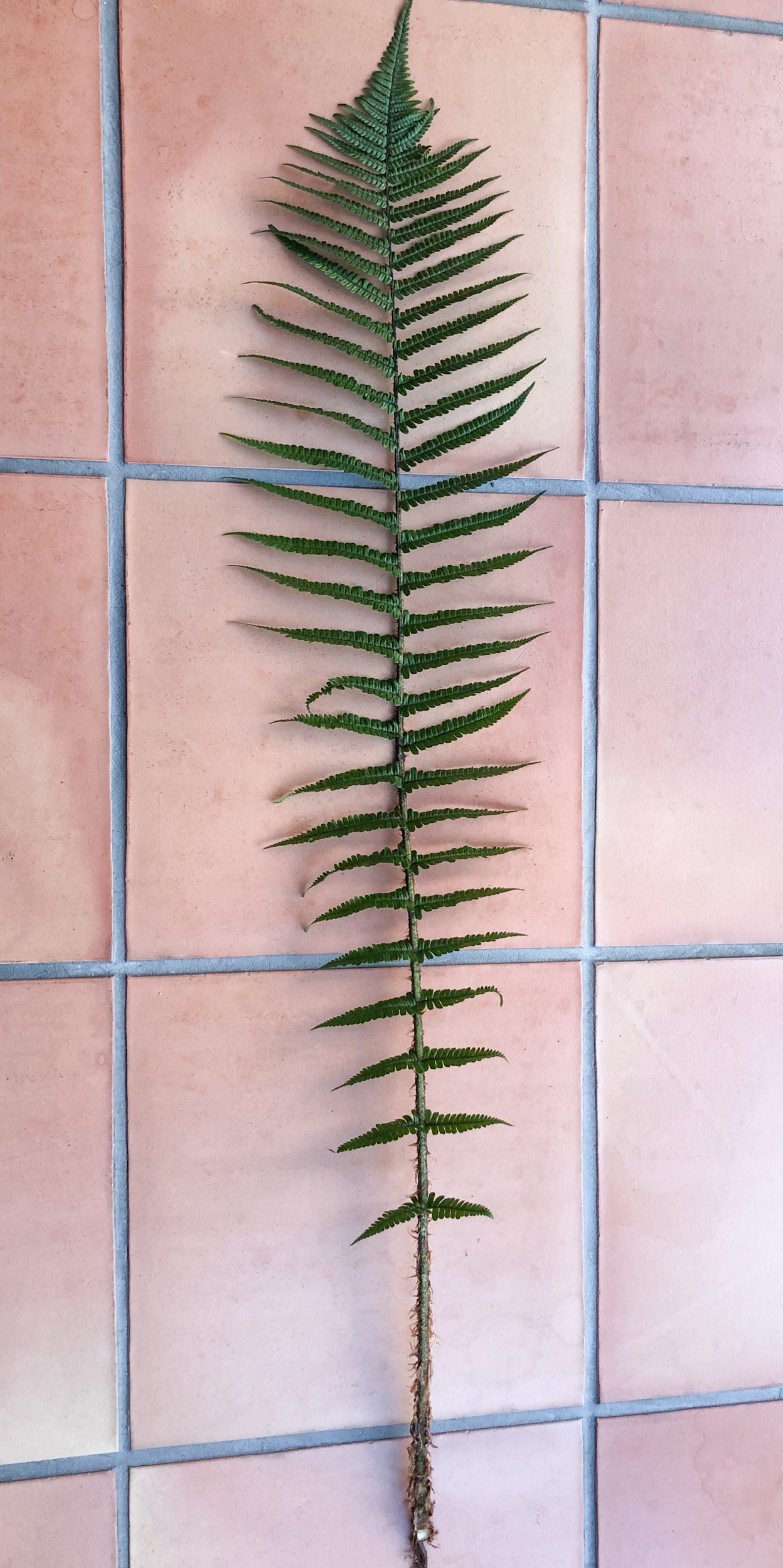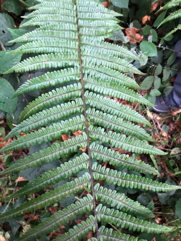 Da wir ihn wegen des schlechten Lichts und des Regens nicht fotografieren konnten, habe ich ein Blatt (105 cm) mitgenommen, von dem ich die folgenden Fotos poste: steife, schmale, glänzende, dunkle Wedel mit wenig gezähnten Fiederblätter und langen, rotbraunen Schuppen.