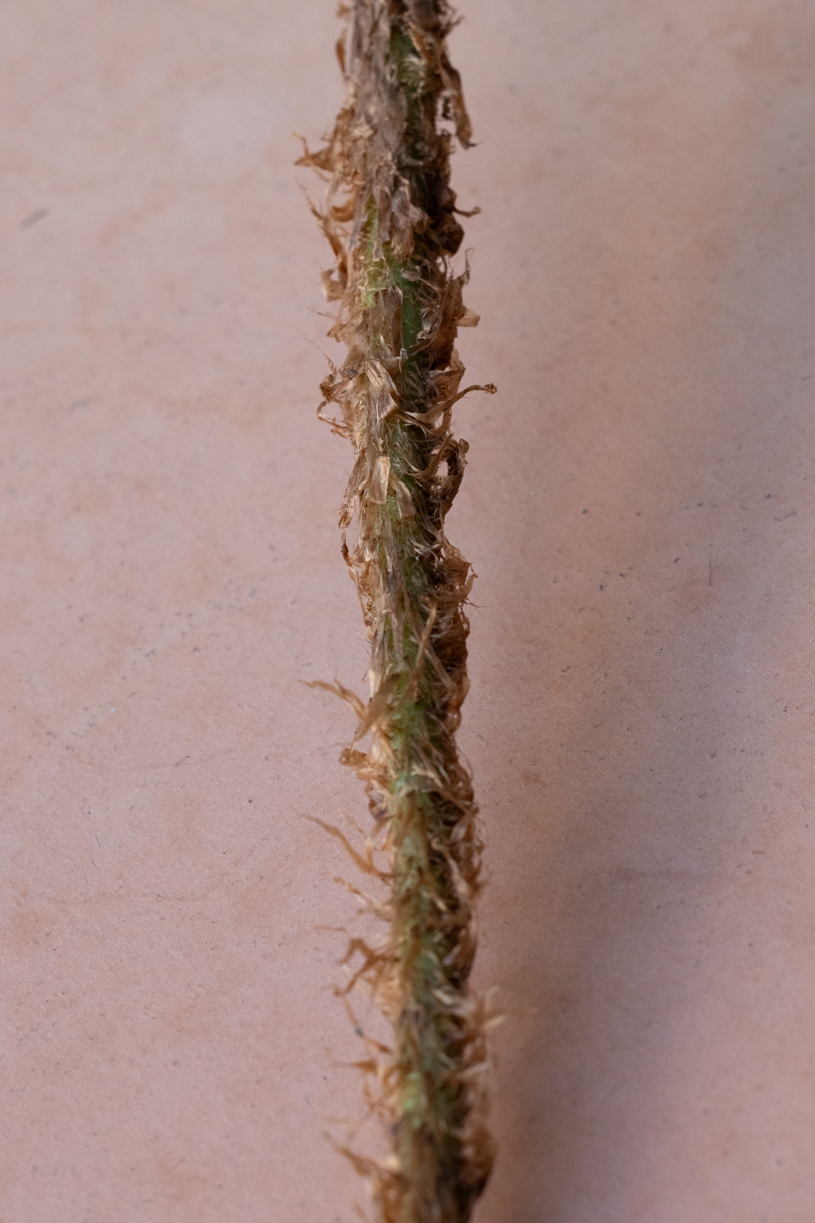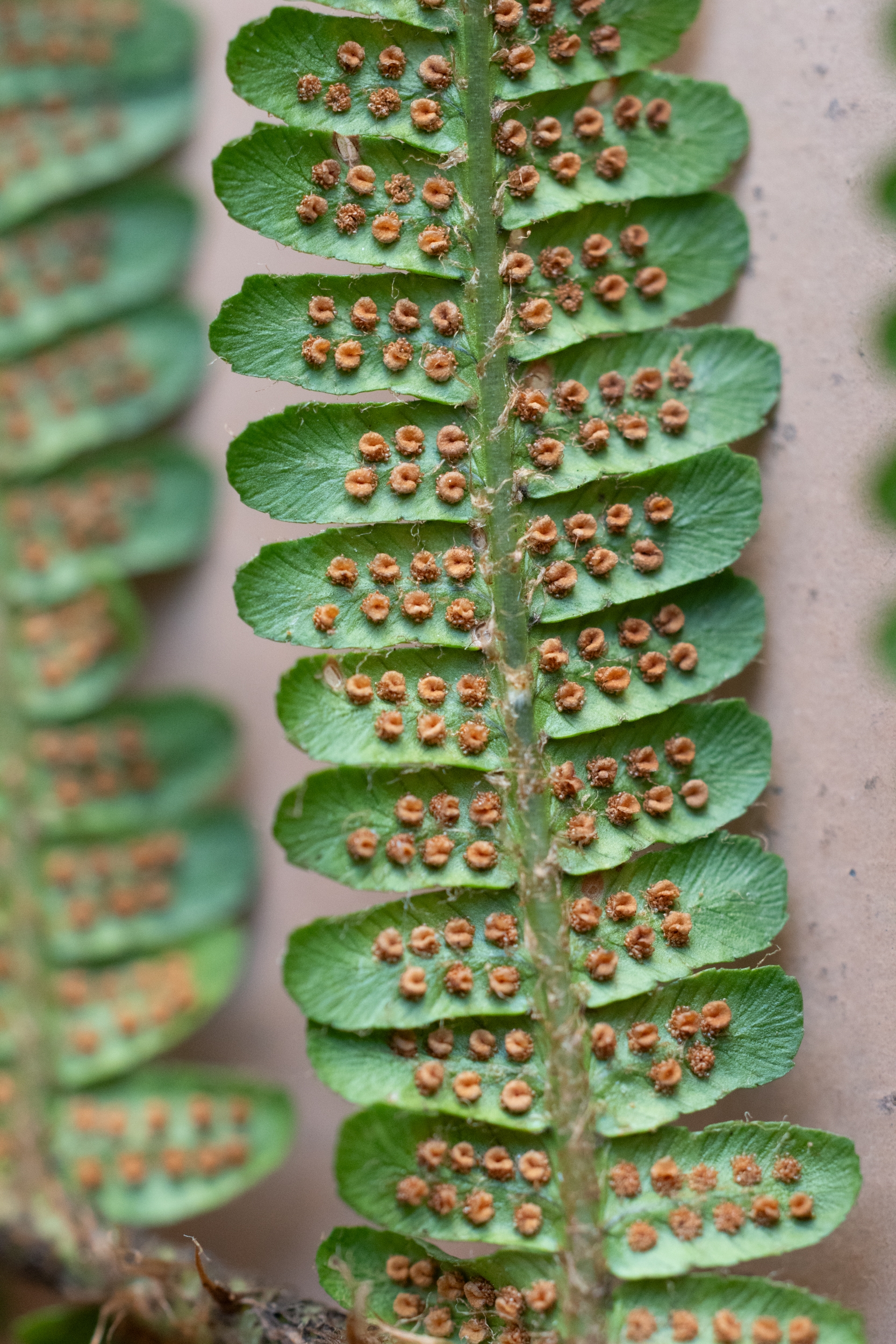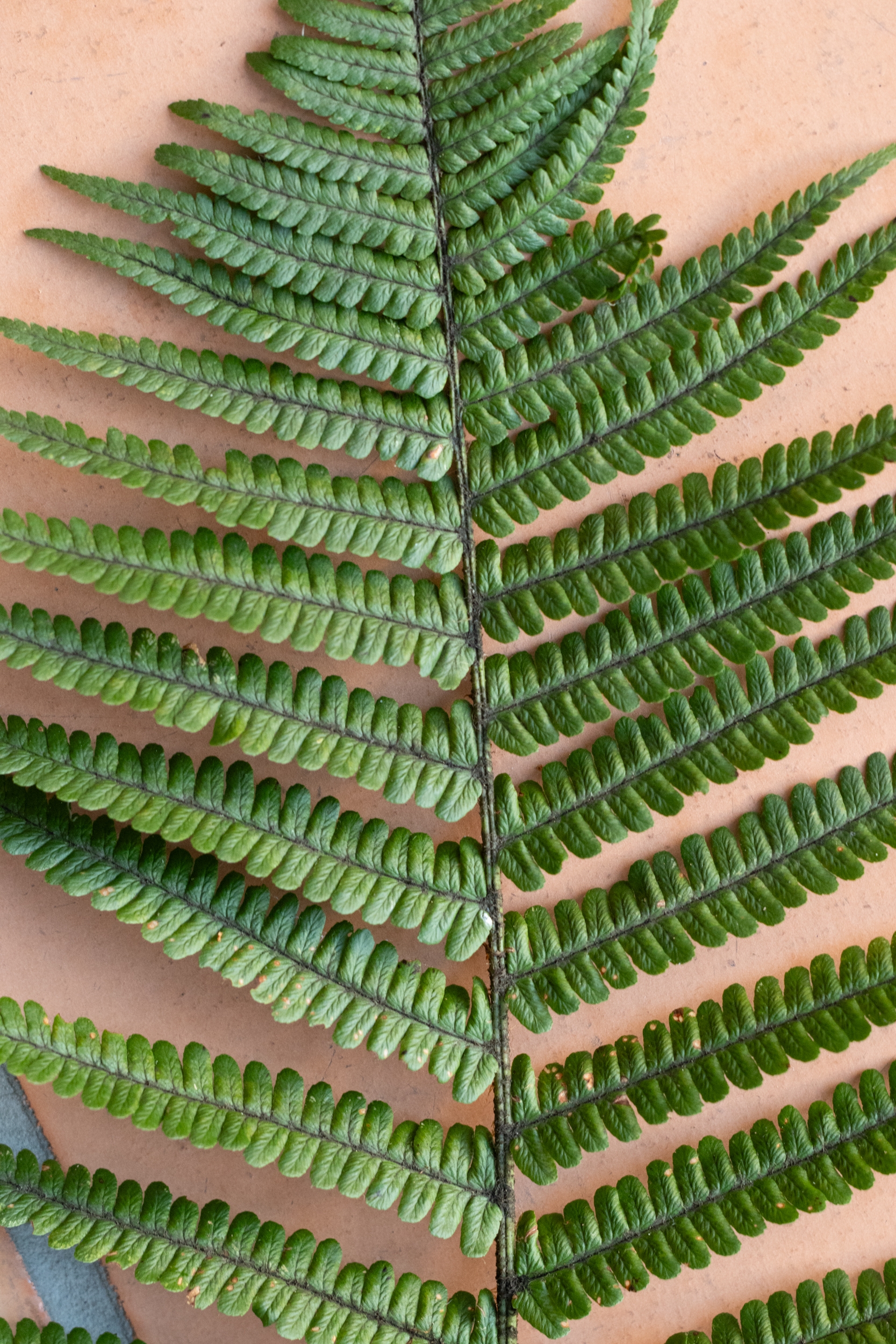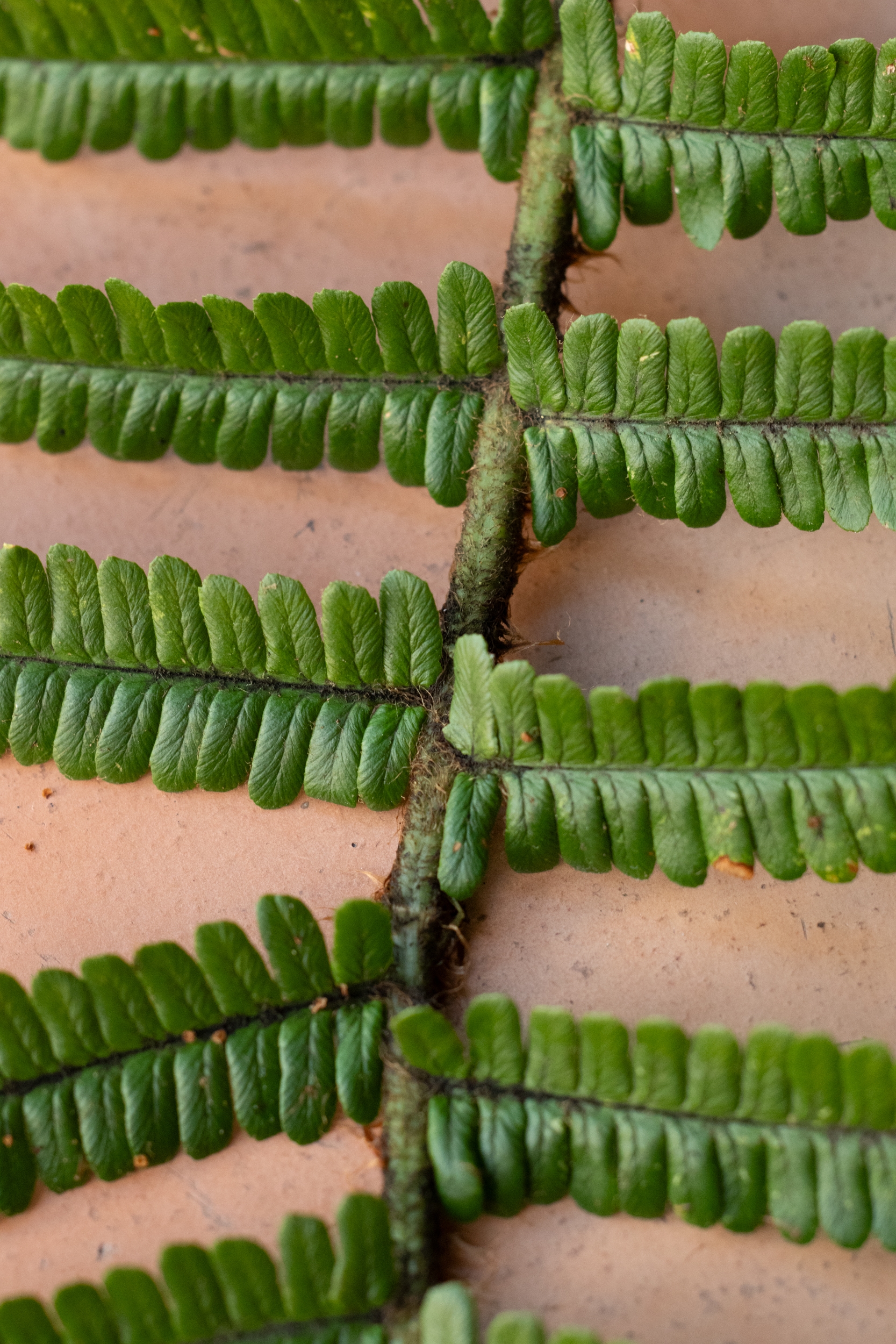 Da wir ihn wegen des schlechten Lichts und des Regens nicht fotografieren konnten, habe ich ein Blatt (105 cm) mitgenommen, von dem ich die folgenden Fotos poste: steife, schmale, glänzende, dunkle Wedel mit wenig gezähnten Fiederblätter und langen, rotbraunen Schuppen.