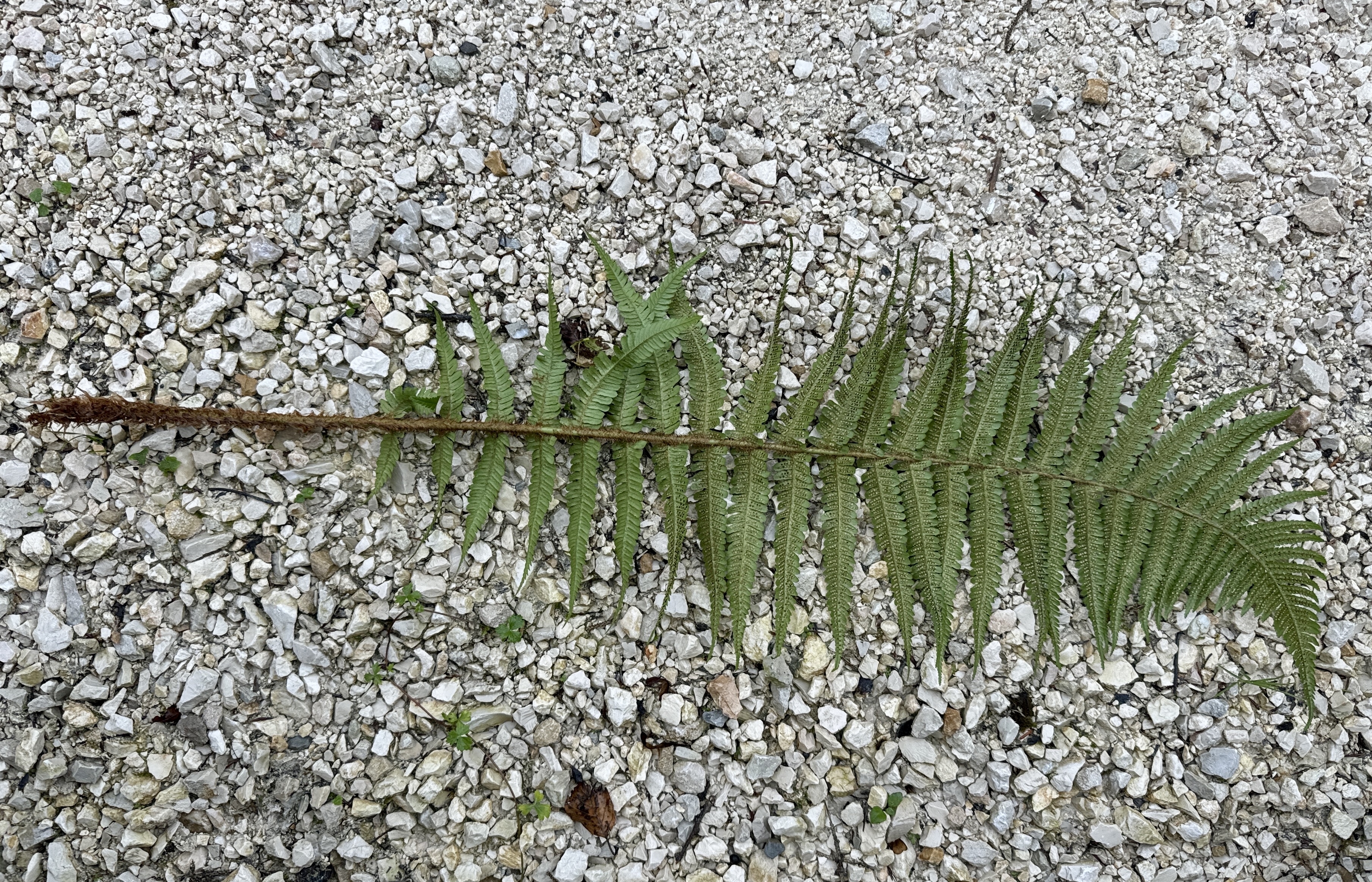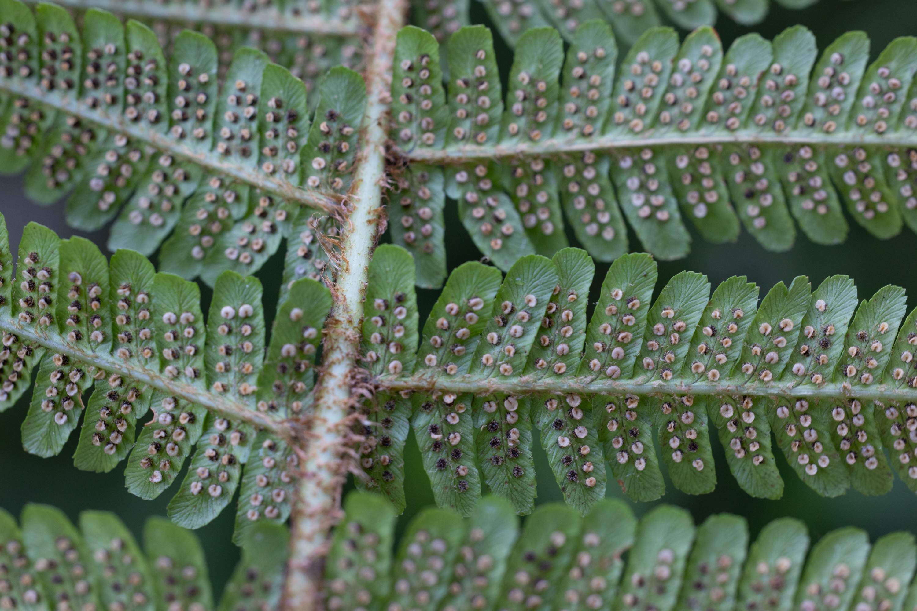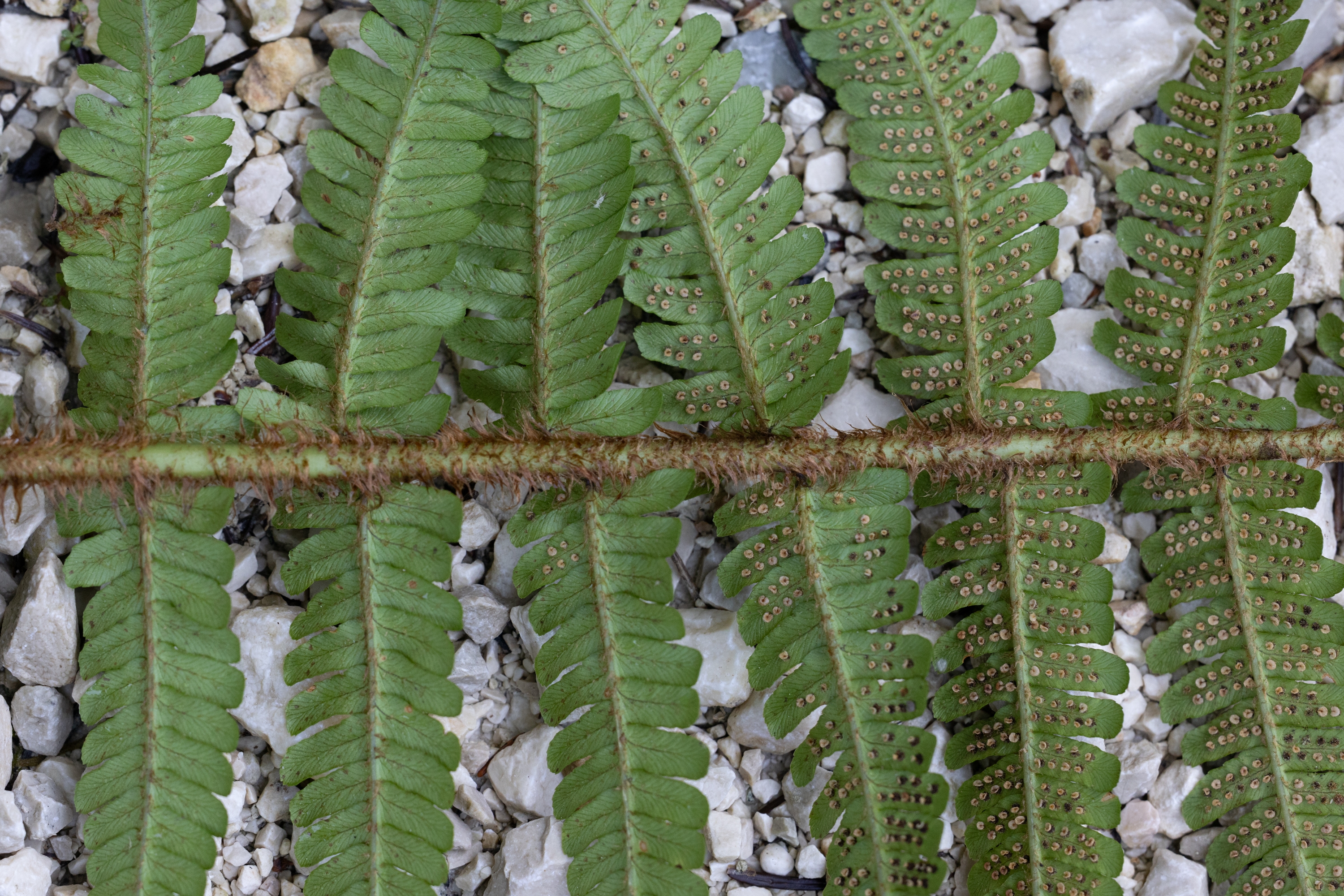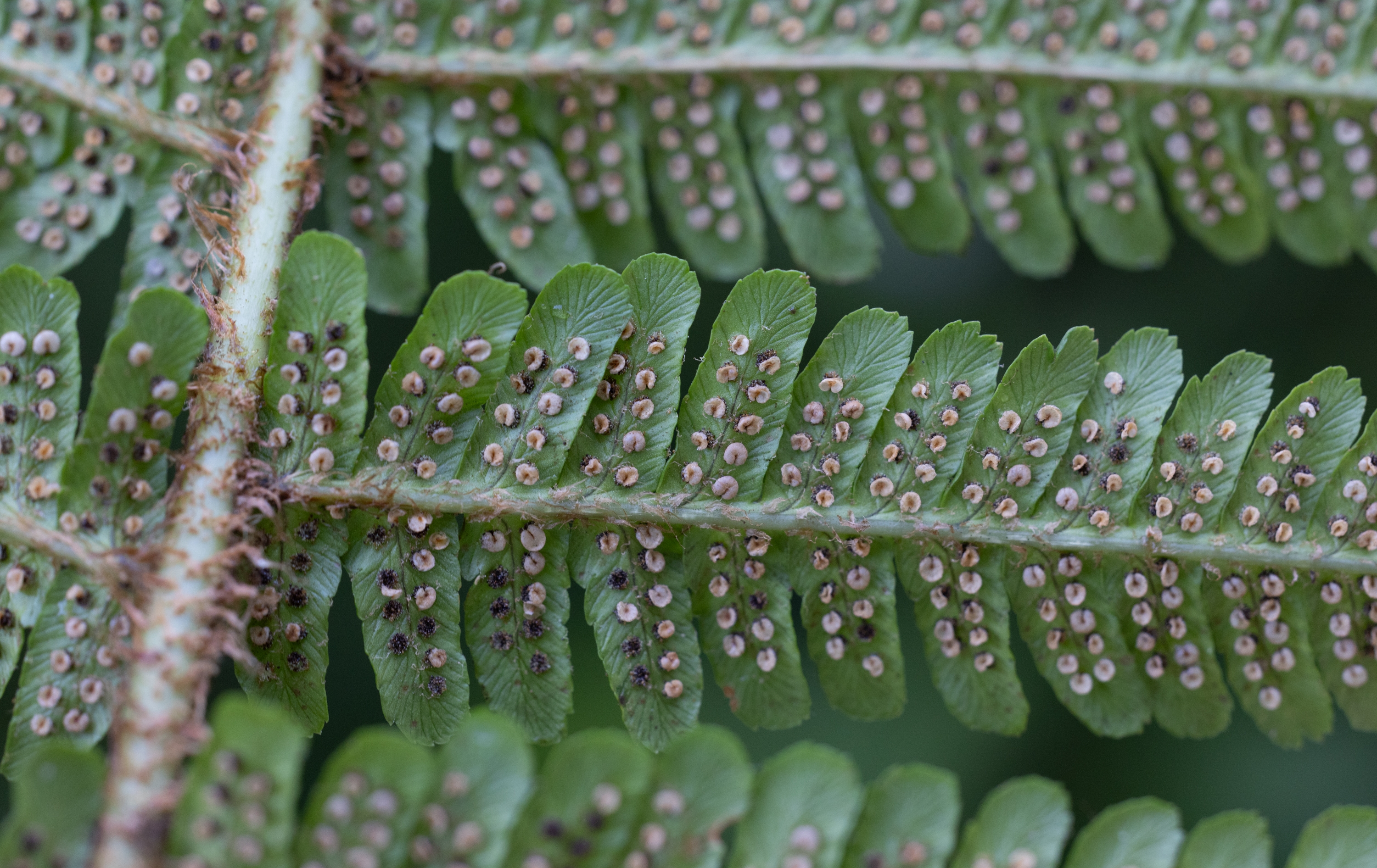 Ich stimme dir zu, dass diese Pflanze nicht ganz eindeutig zu bestimmen ist, also ob sie den Diploiden oder den Triploiden zuzurechnen ist. Ein paar Merkmale (Schuppendichte, Schleierform und Dicke) könnten zu diploiden Arten von Dryopteris affinis passen (und dennoch wüsste ich nicht, wohin ich sie stellen soll), während andere Merkmale auf D. borreri s.l. passen: Einige Schleier schrumpfen eben doch recht stark, in den unteren Fiedern sind die Enden der Fiederchen schräg geschnitten, die feinen Schuppen auf der Fiederspindel zeigen kaum mehr eine Färbung, die Blattnerven sind zwar sichtbar, jedoch nicht so ausgeprägt durchscheinend wie bei diploiden. Und sehr stark spricht für D. borreri, dass benachbarte Fiederchen oft ungleiche Längen haben und (wenn auch nur schwach ausgeprägt) in unterschiedlicher Weise verdreht sind. Das Blatt zeigt keinen besonderen Glanz und insgesamt zeigt die Pflanze keinen besonderen Charakter, so wie dies für D. borreri “charakteristisch” ist :o)