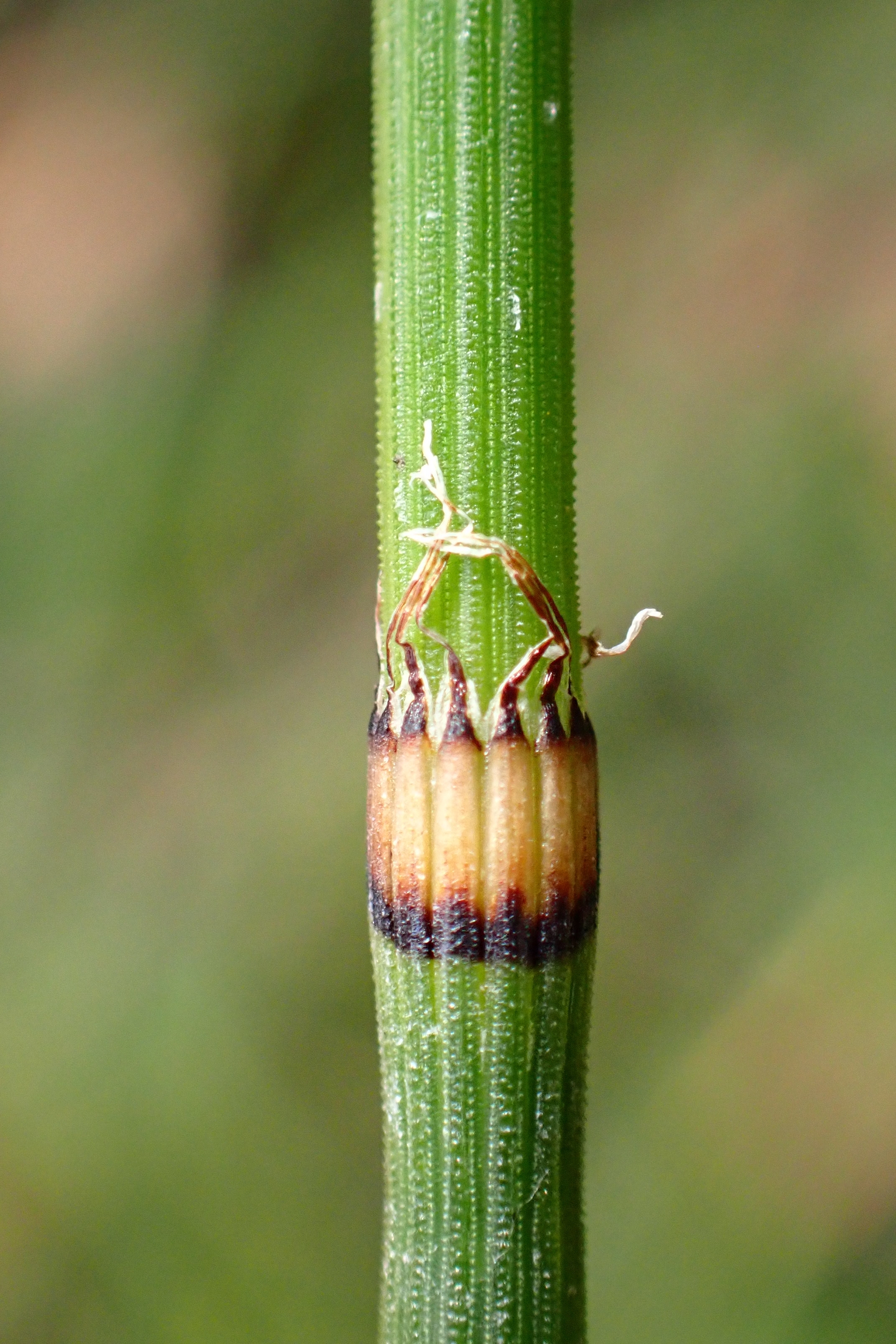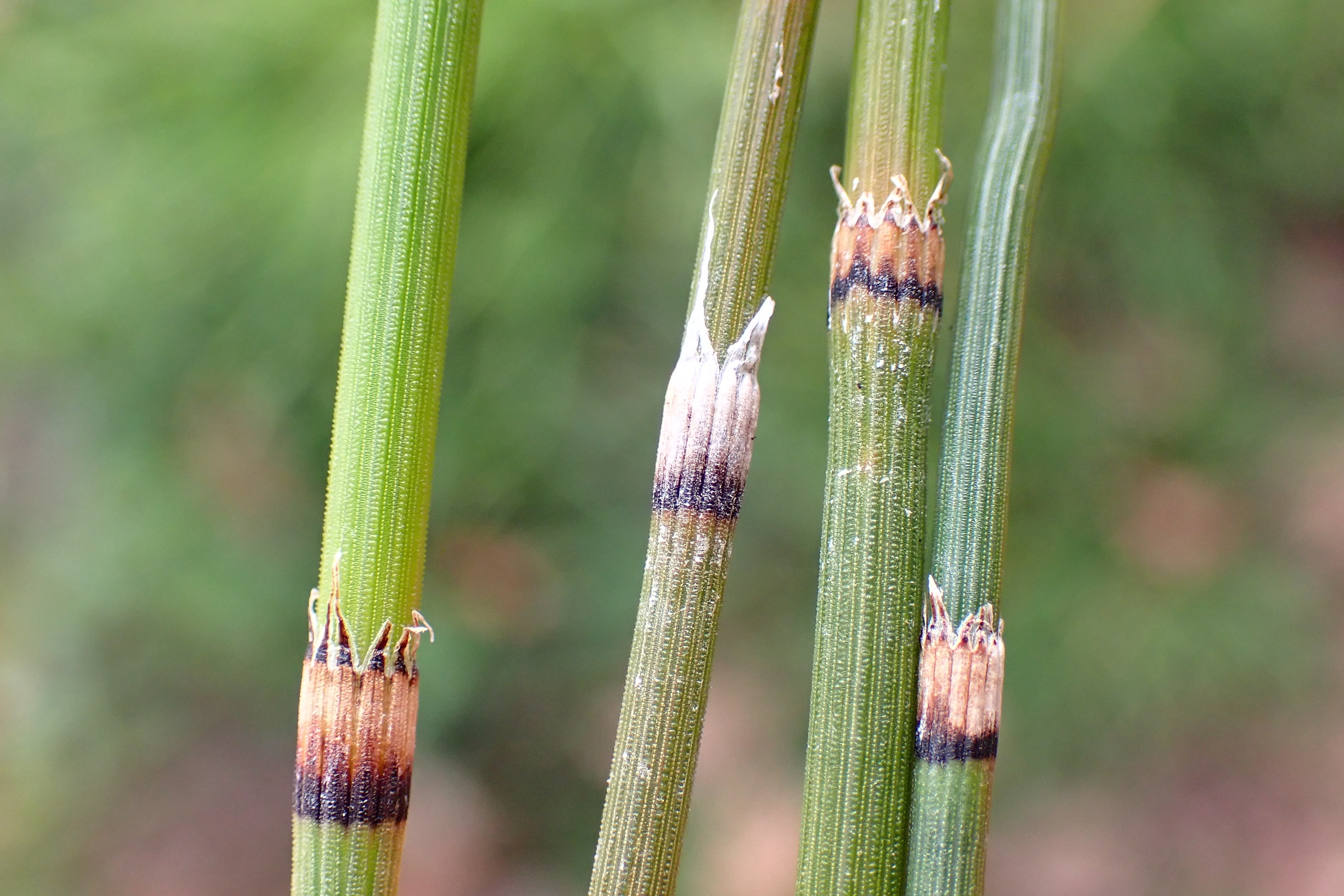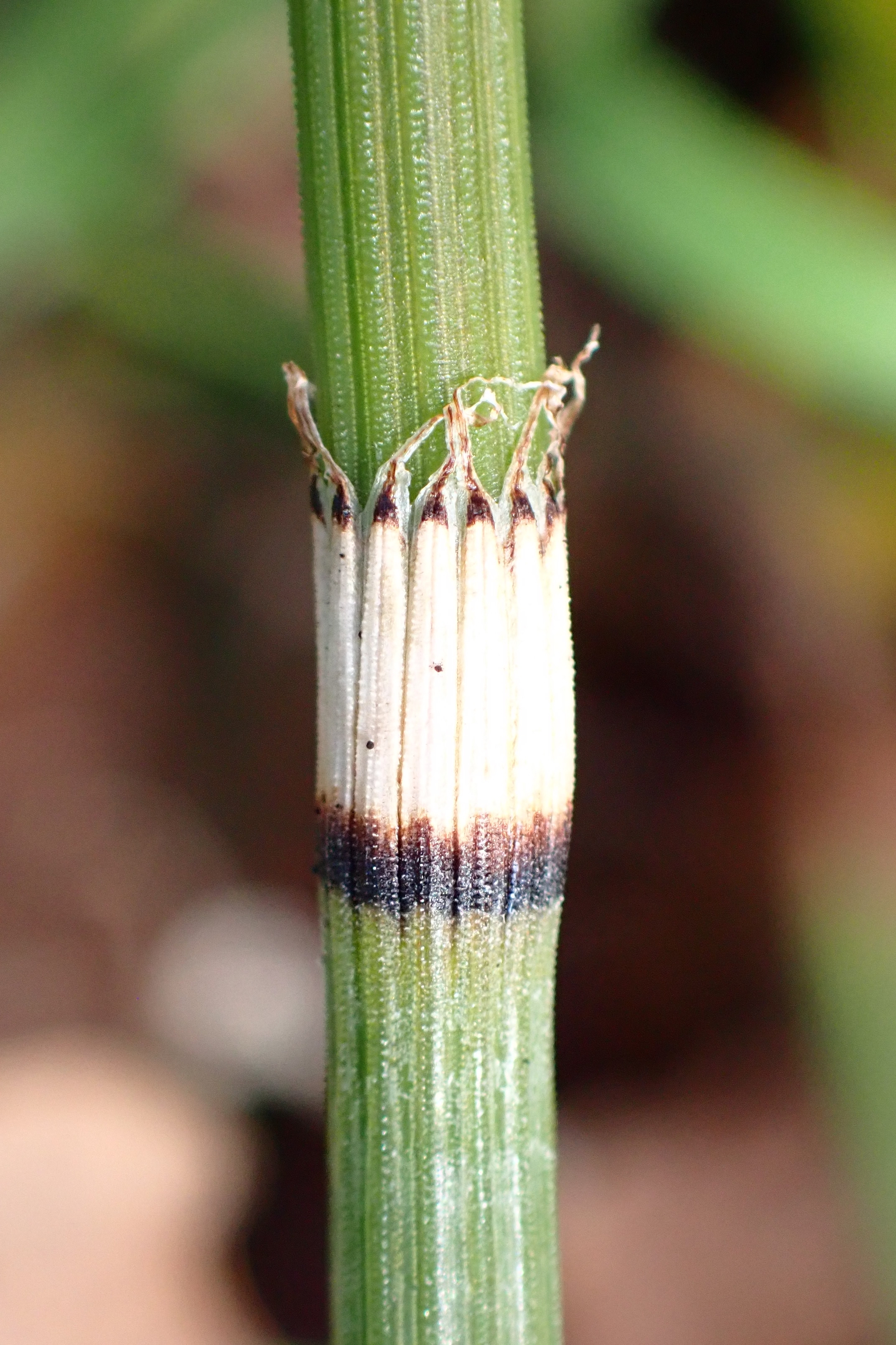 Mein erster (kurzer) Gedanke von weitem war der Winter-Schachtelhalm (Equisetum hyemale), dies v.a. aufgrund der hellen Blattscheiden: Aber diese Art hat keine Blattscheidenzähne (resp. sie lösen sich während des Längenwachstums ab und werden nach oben zusammengeschoben) – also kommt sie nicht in Frage.
