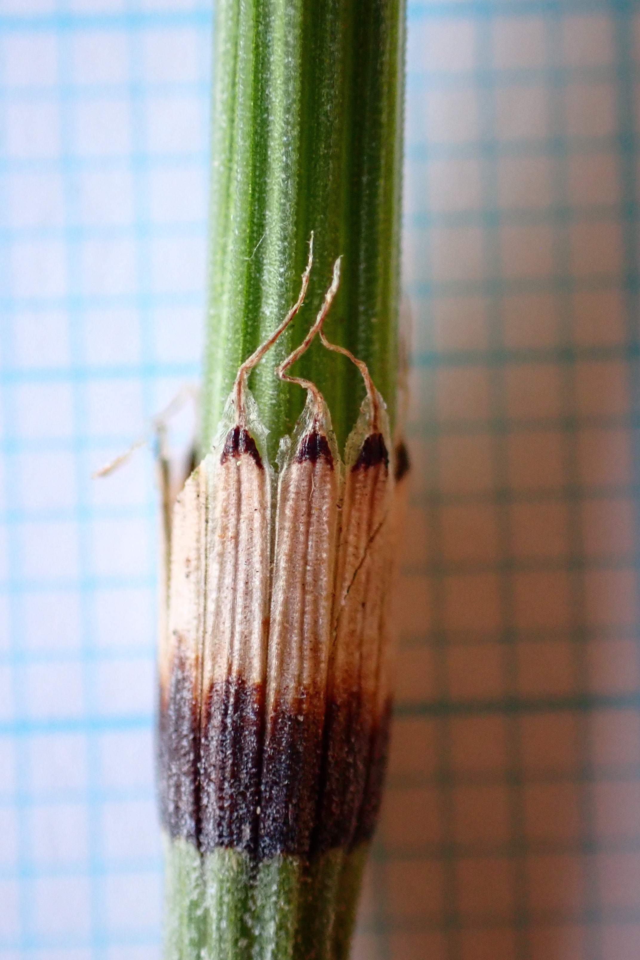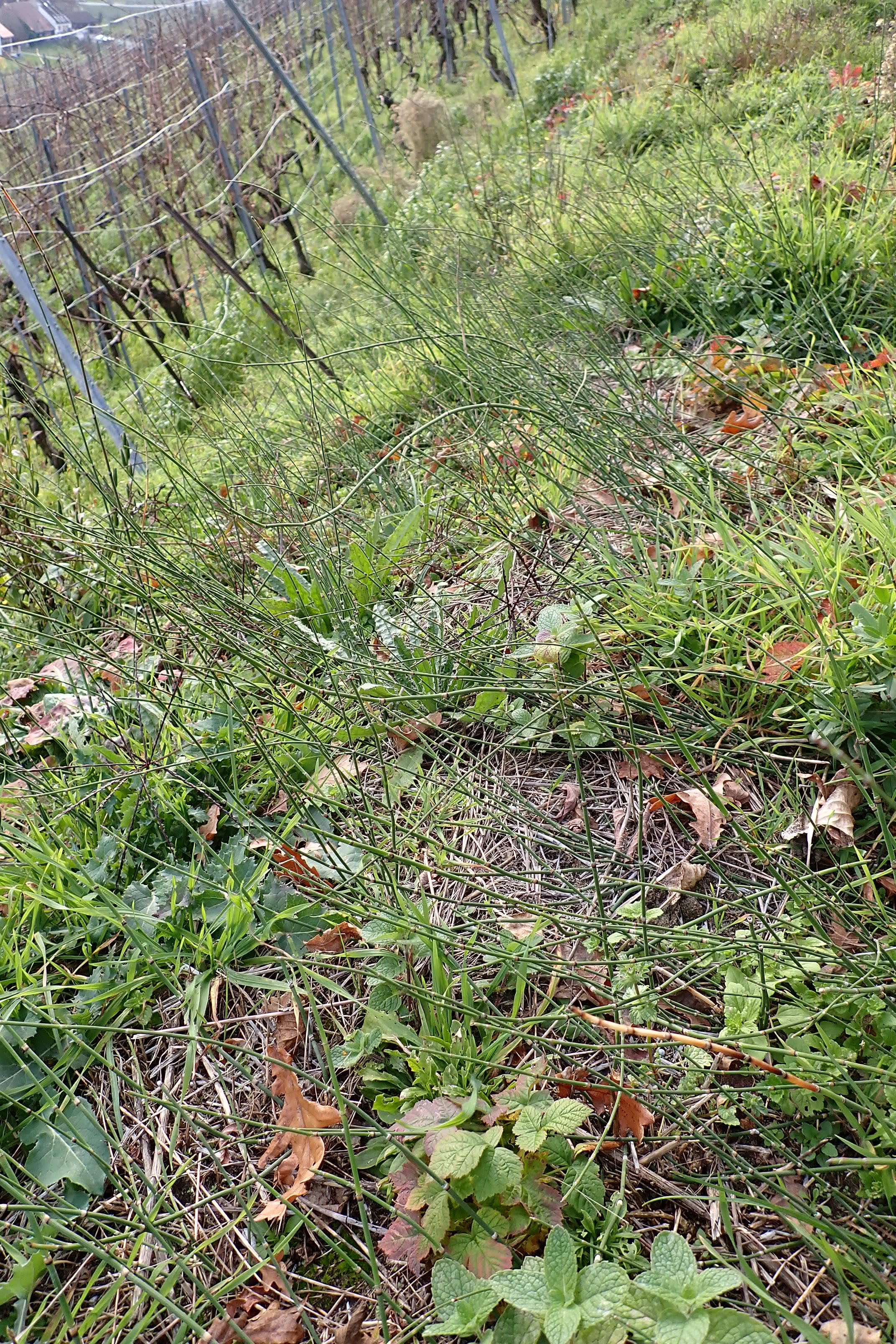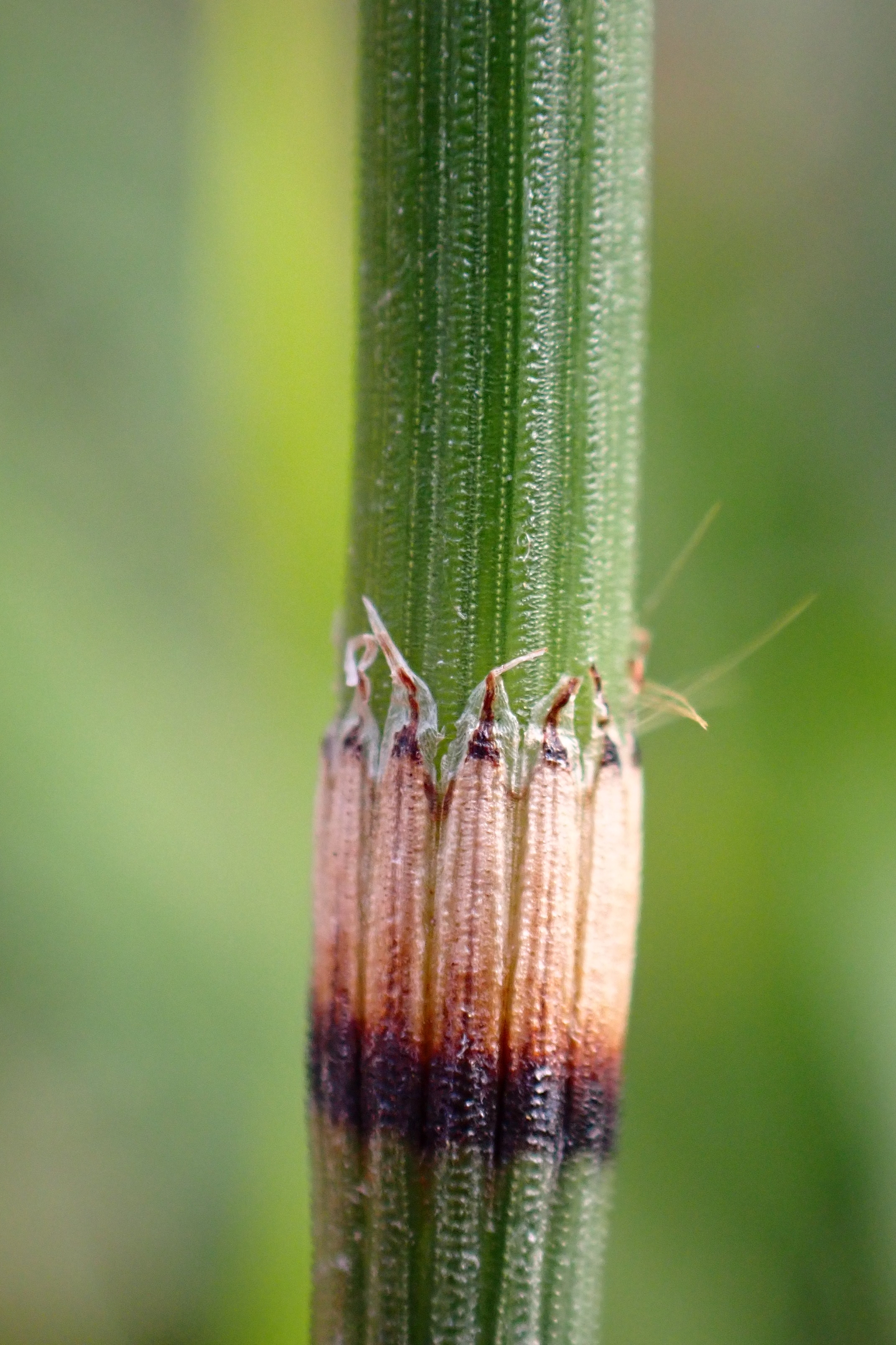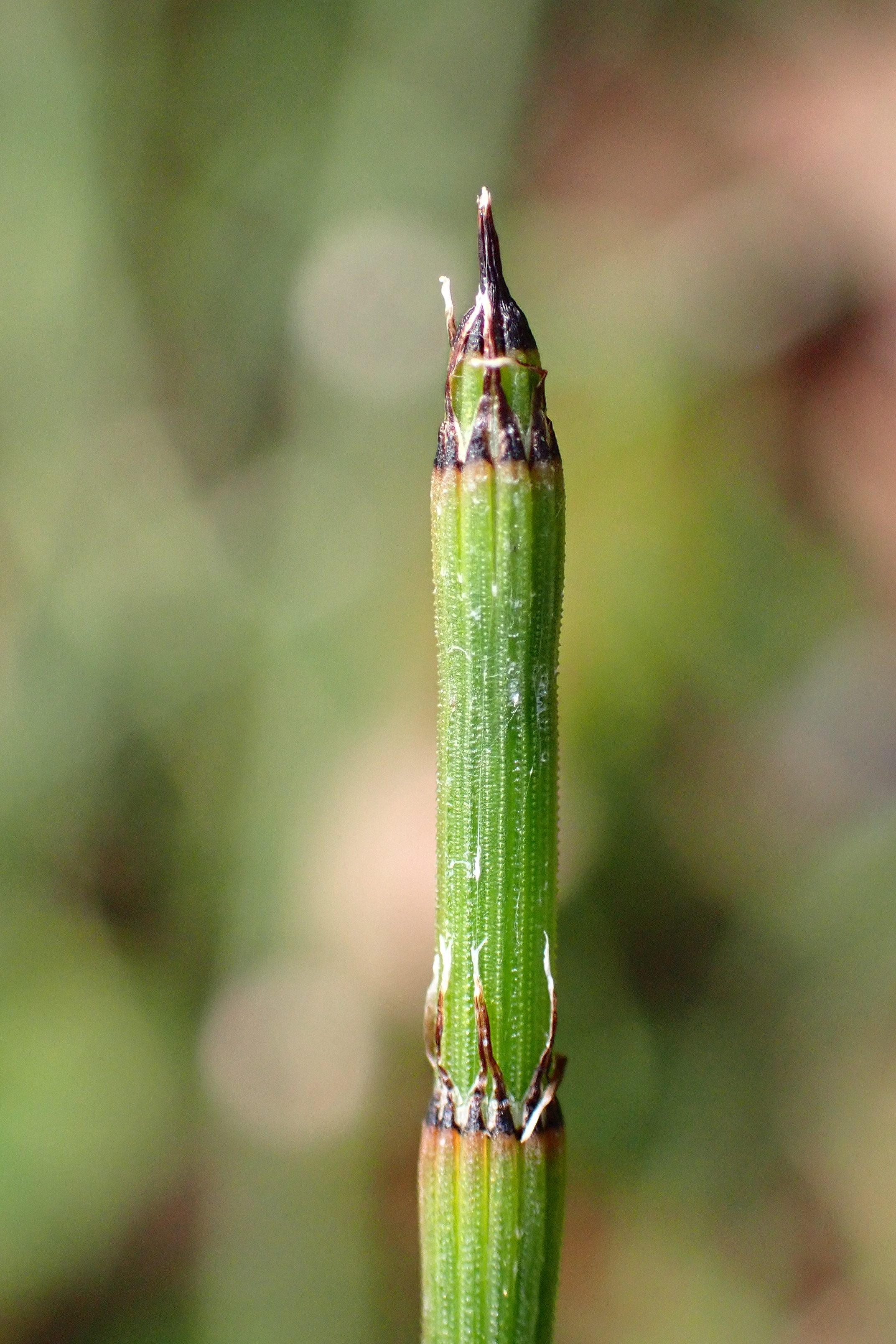 Mein erster (kurzer) Gedanke von weitem war der Winter-Schachtelhalm (Equisetum hyemale), dies v.a. aufgrund der hellen Blattscheiden: Aber diese Art hat keine Blattscheidenzähne (resp. sie lösen sich während des Längenwachstums ab und werden nach oben zusammengeschoben) – also kommt sie nicht in Frage.