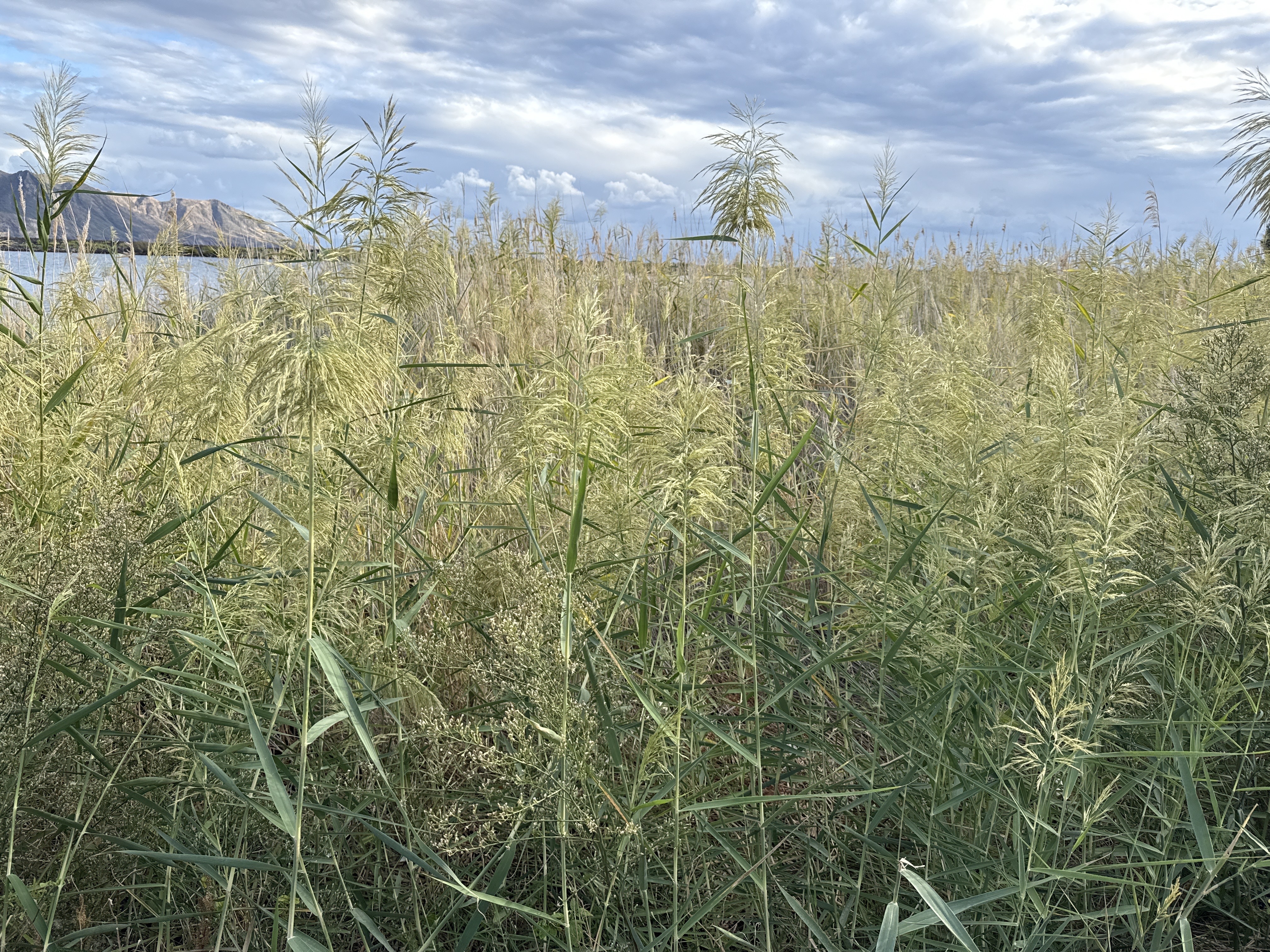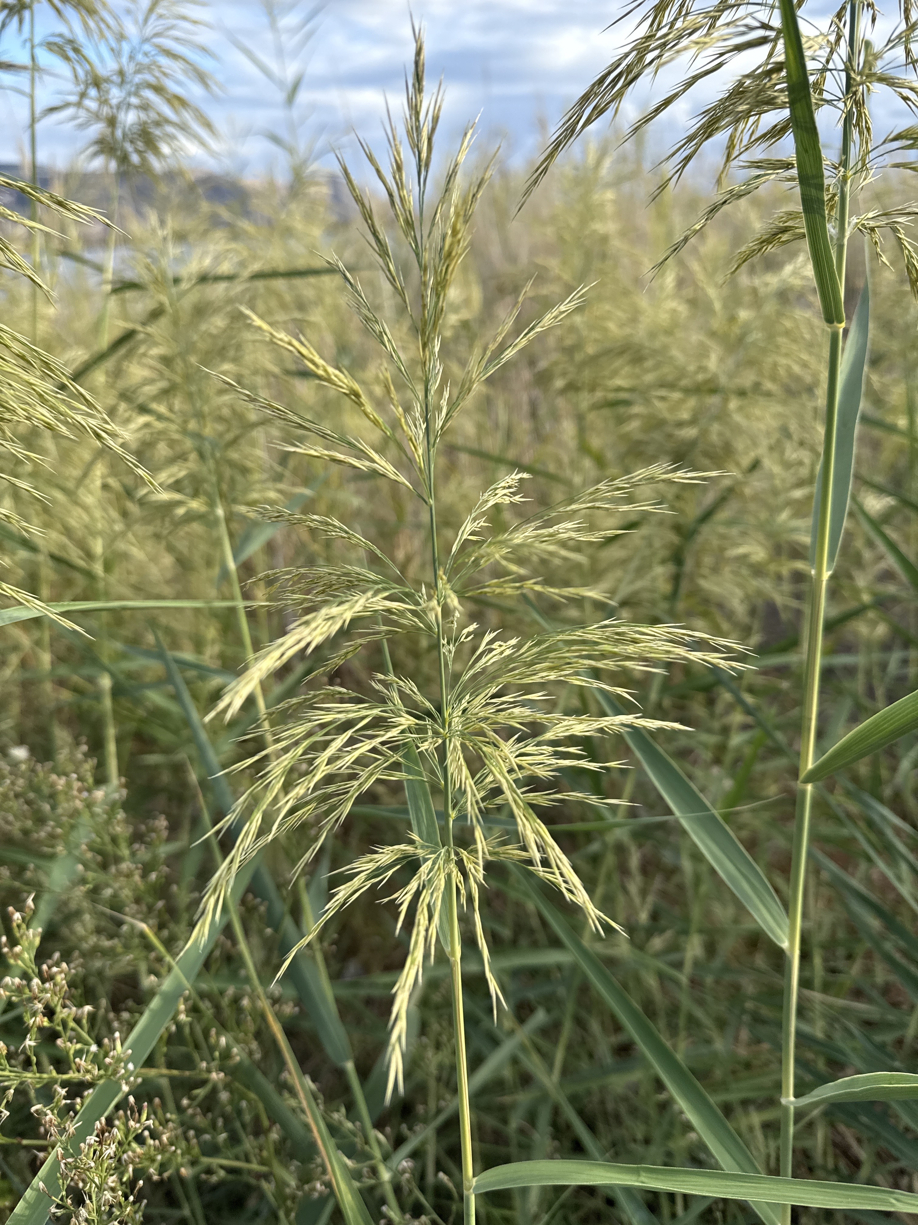 Bereits auf Sizilien kam mir Phragmites etwas andersartig vor. Bei dieser hellspelzigen (statt violett überlaufen) und allseitswendigen (statt einseitswendig) Form hab ich etwas recherchiert und in Wikipedia erfahren: „Gattung Phragmites ist taxonomisch schwierig und die Anzahl und Abgrenzung der Arten zum Teil umstritten.“, da wage ich keine weiteren Mutmassungen…