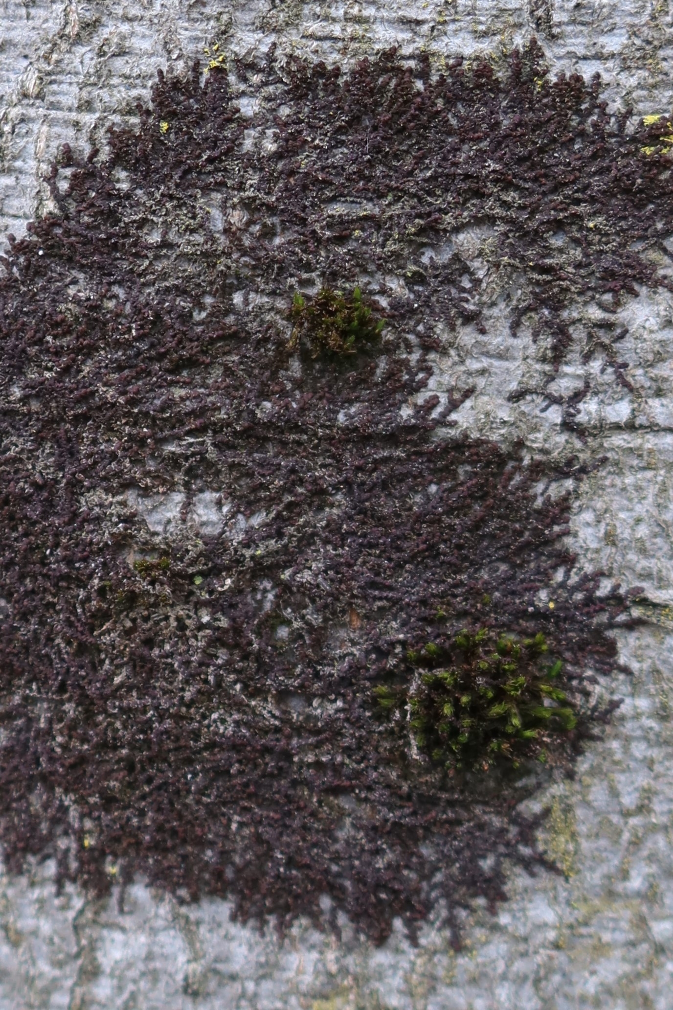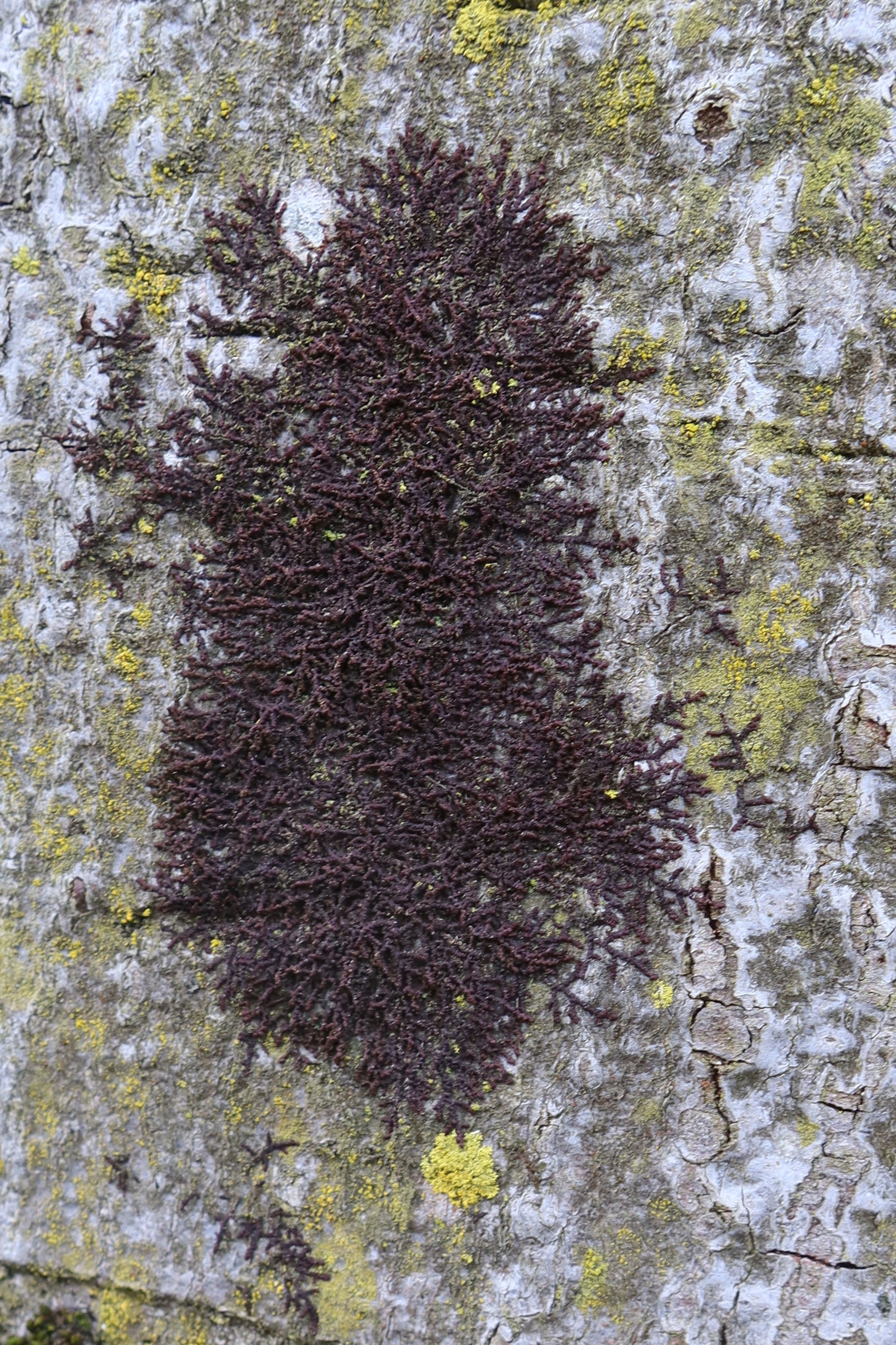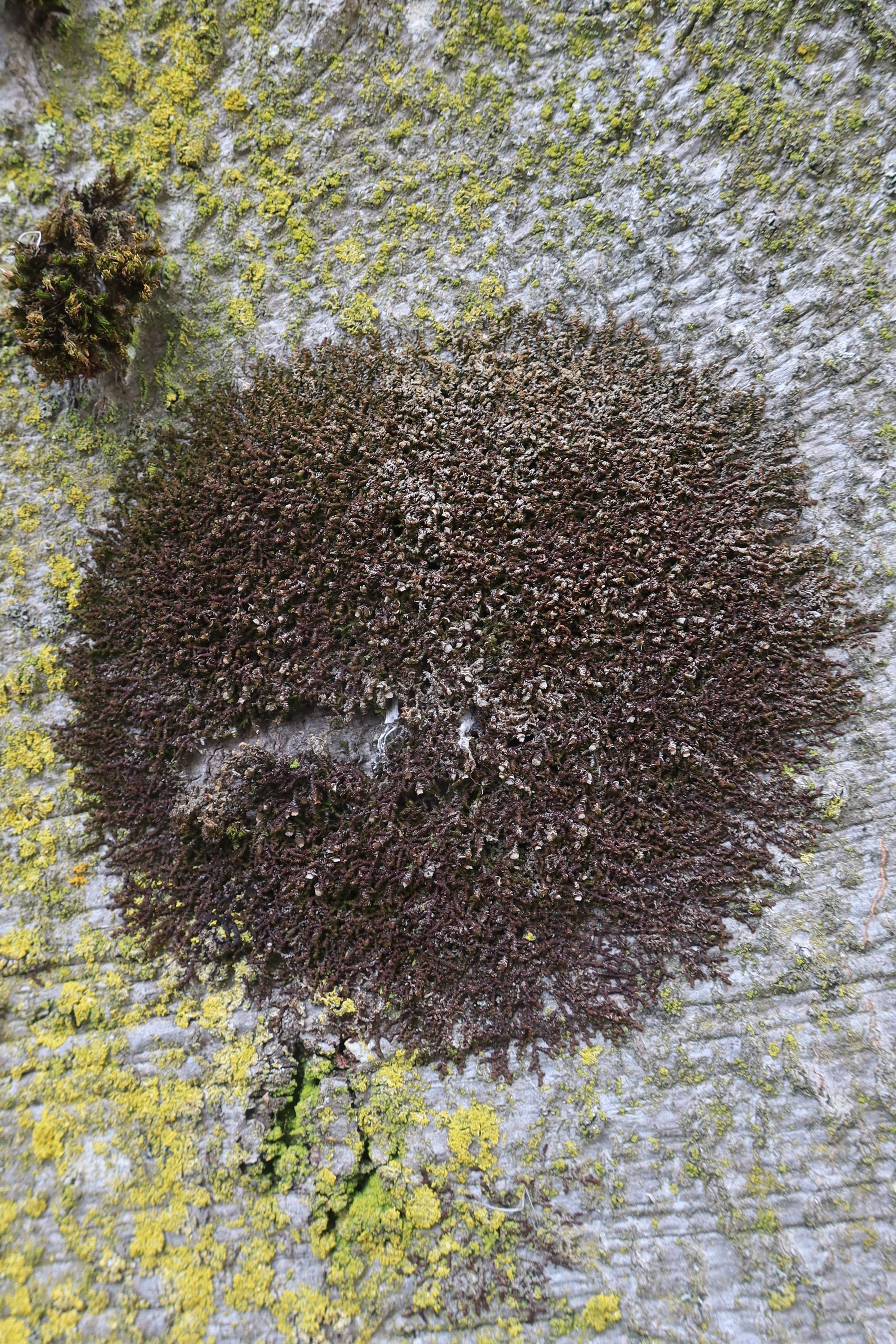 Dem pflichte ich bei. Ein beblättertes Lebermoos. Mit grösster Wahrscheinlichkeit ist es die Art Frullania dilatata.