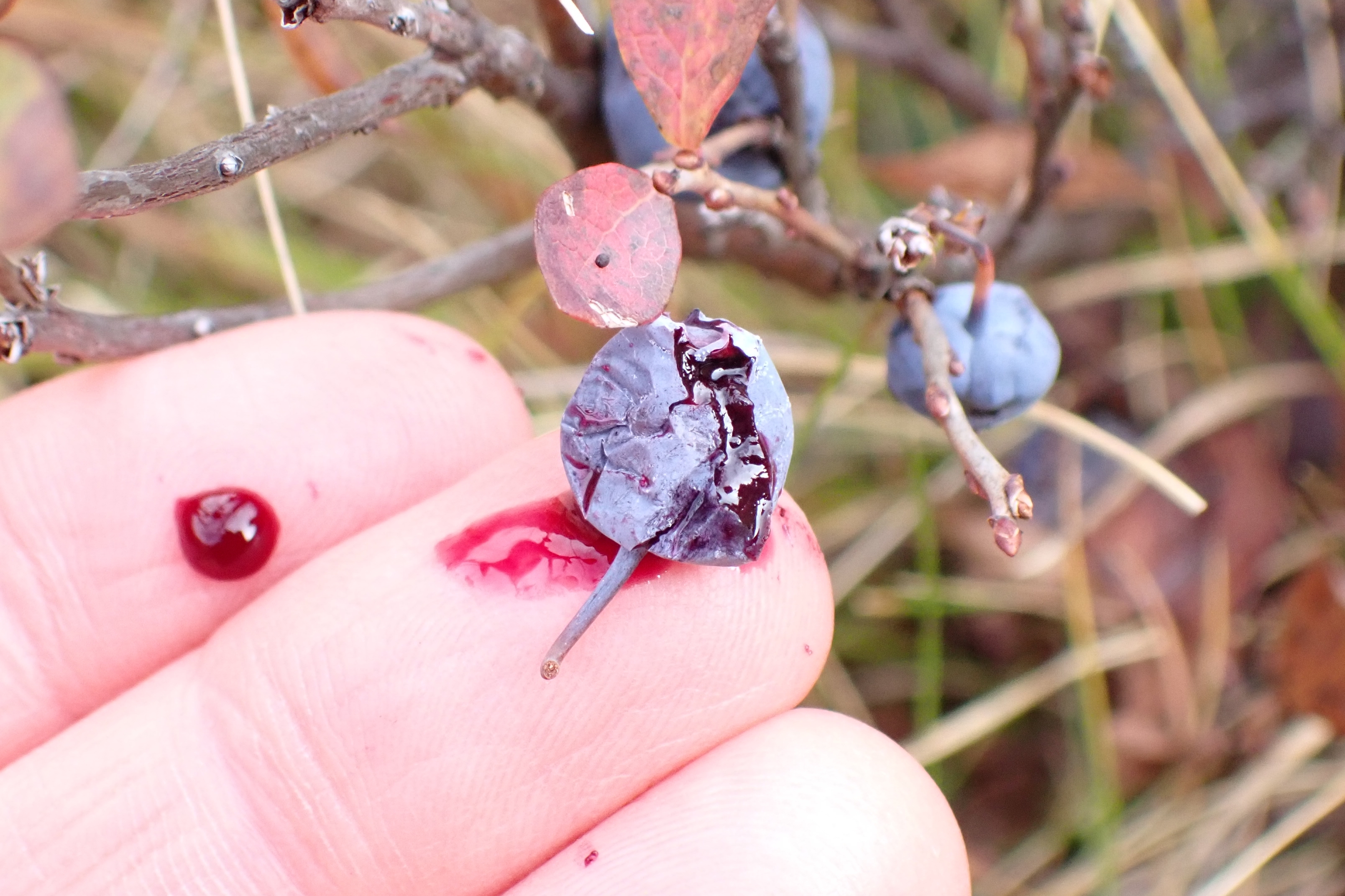 Das Fruchtfleisch der Rauschbeeren waren aber dunkelrot und hat die Finger (den Futter-Test haben wir sein lassen) schön verfärbt.
