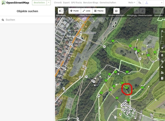 Das tolle daran ist: Das kann jeder machen. Alles was man braucht, ist ein Konto auf https://www.openstreetmap.org, was in ein paar Minuten angelegt ist. Mit dem auf der Seite eingebauter Editor "iD" kann man dann selbst die Daten ändern. Dazu wählt man den richtigen Kartenausschritt (die grünen Blasen sind meine Bearbeitungshinweise aus dem Feld):