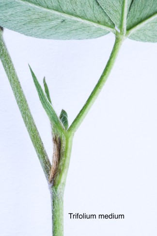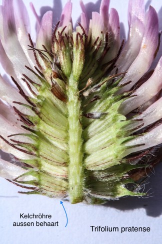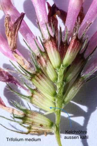 Bei der Kelchröhre des Mittleren Klees (Trifolium medium) muss man ab und zu ein Auge zudrücken und ein paar zerquetschte Haare stehen lassen; die Kelchröhre ist oft kahl, manchmal aber auch sehr sehr spärlich behaart. Das zählt auch. Beim Rot-Klee (Trifolium pratense) muss die Kelchröhre deutlich behaart sein.