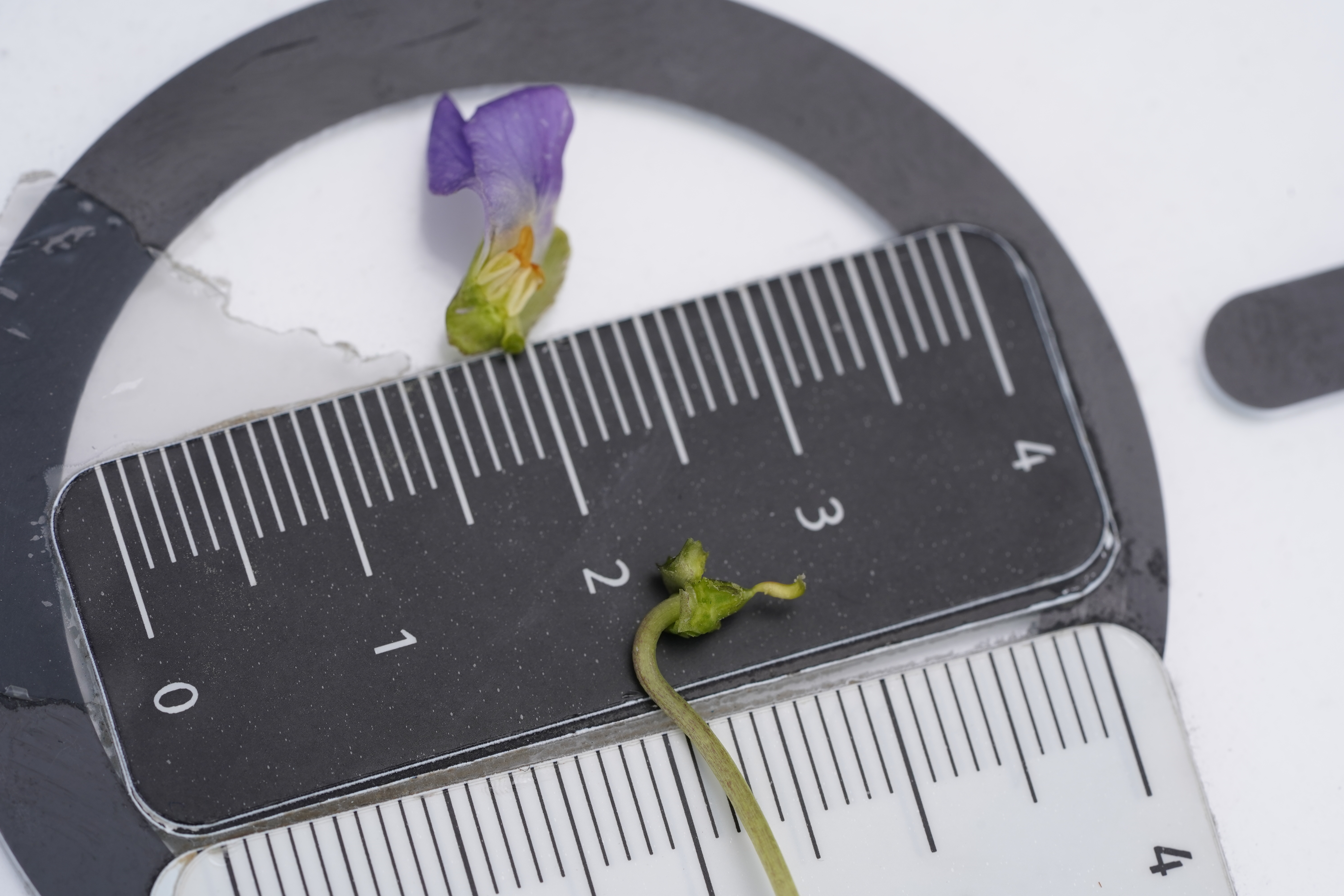 Die Blüten sind auffallend klein, hellblau und mit weissem Zentrum. Die gelbgrünen Blätter sind +/- kahl und besonders wichtig, sowohl Kelch als auch Frucht sind kahl.