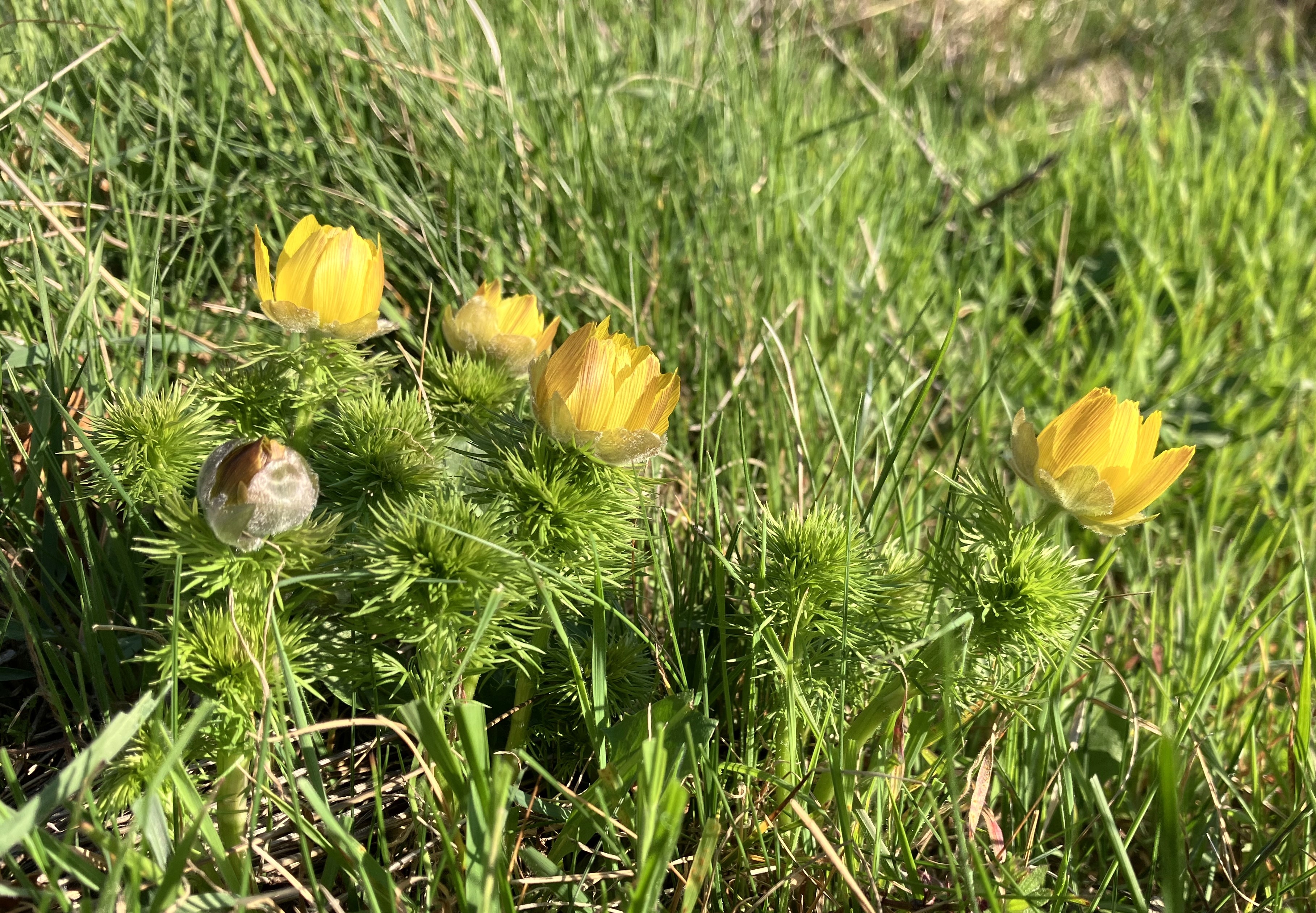 Ich staunte vor wenigen Tagen bei Saxon über ein Phänomen, das ich so noch nicht gesehen habe, nämlich darüber, dass ausgerechnet der Frühlings-Adonis (Adonis vernalis), der Inbegriff der satten Gelbheit, violette Knospen bzw. Kelchblätter hat (die Komplementärfarbe von Gelb!). Gewiss lässt sich über die Farbe diskutieren und man könnte die Knospen auch als rötlich-braun überlaufen bezeichnen, auf jeden Fall aber waren sie alles andere als goldgelb!