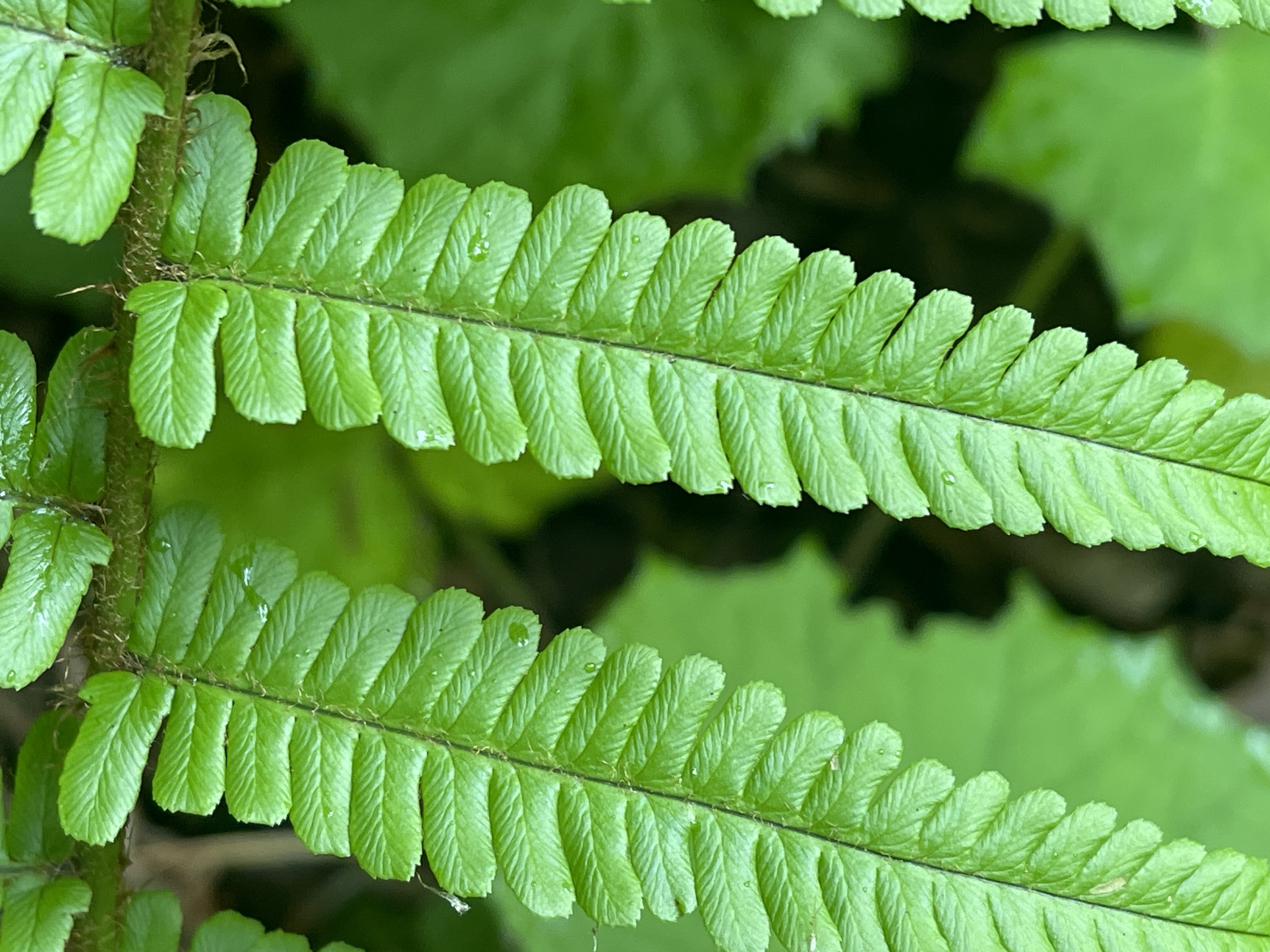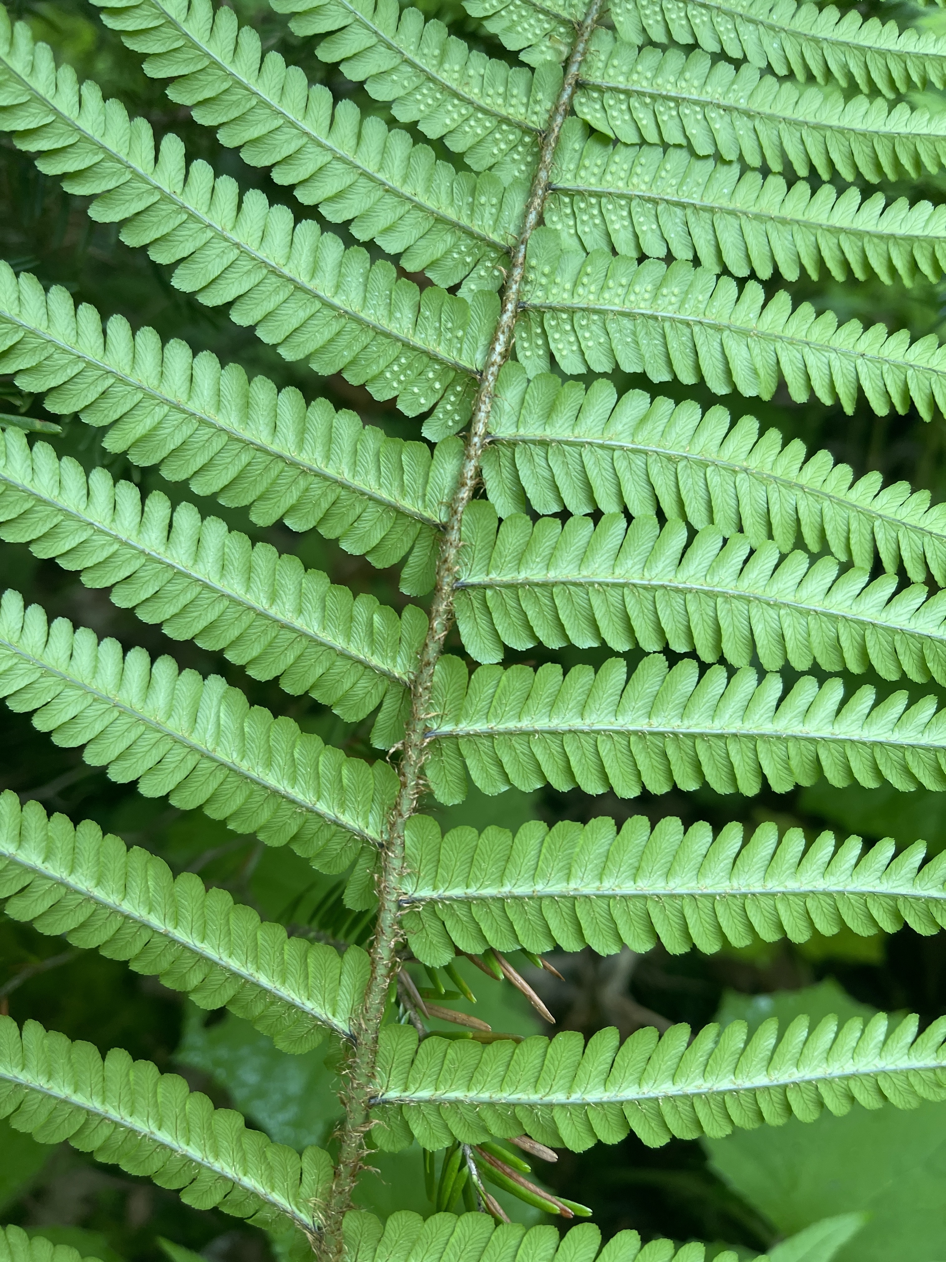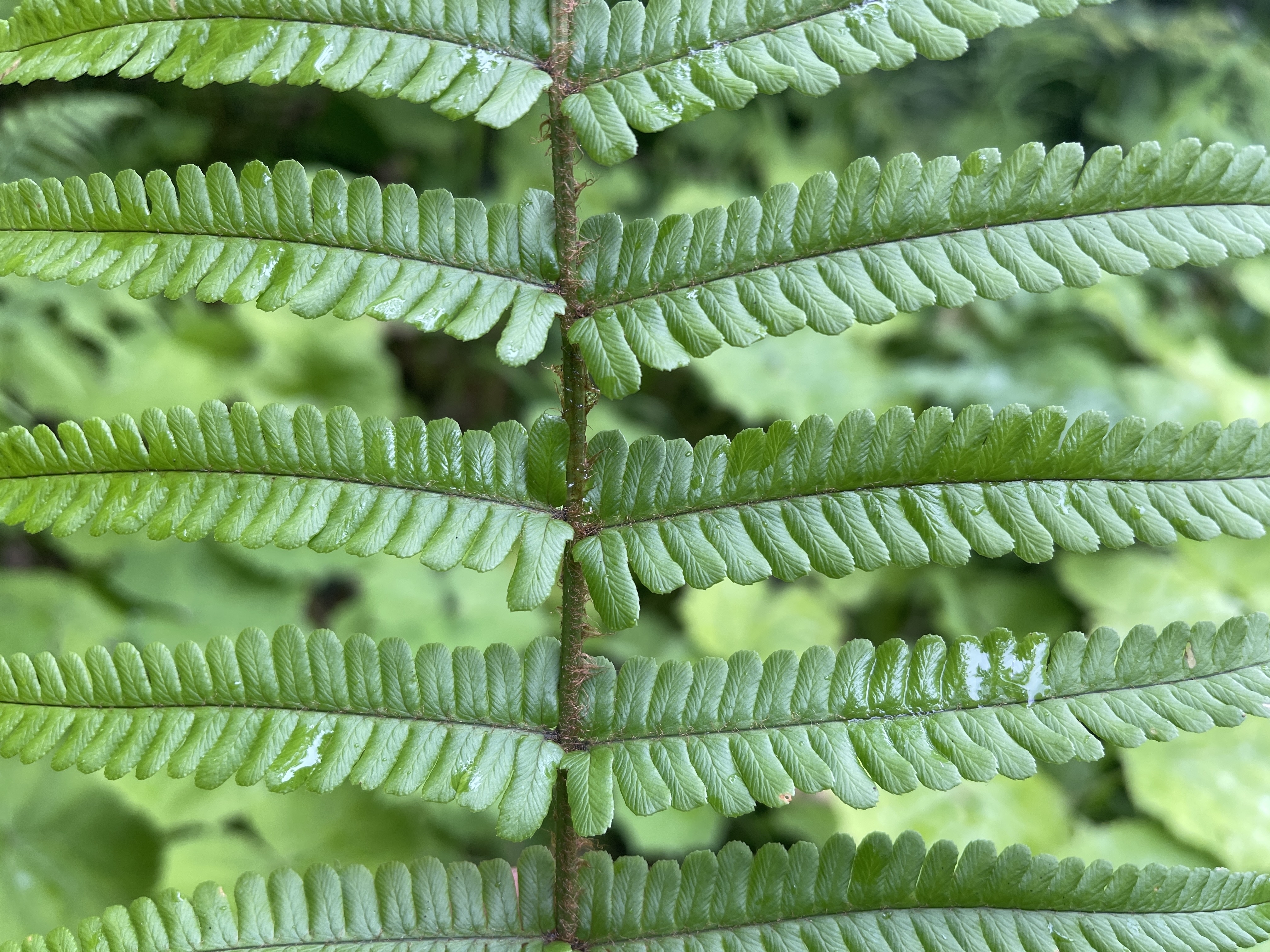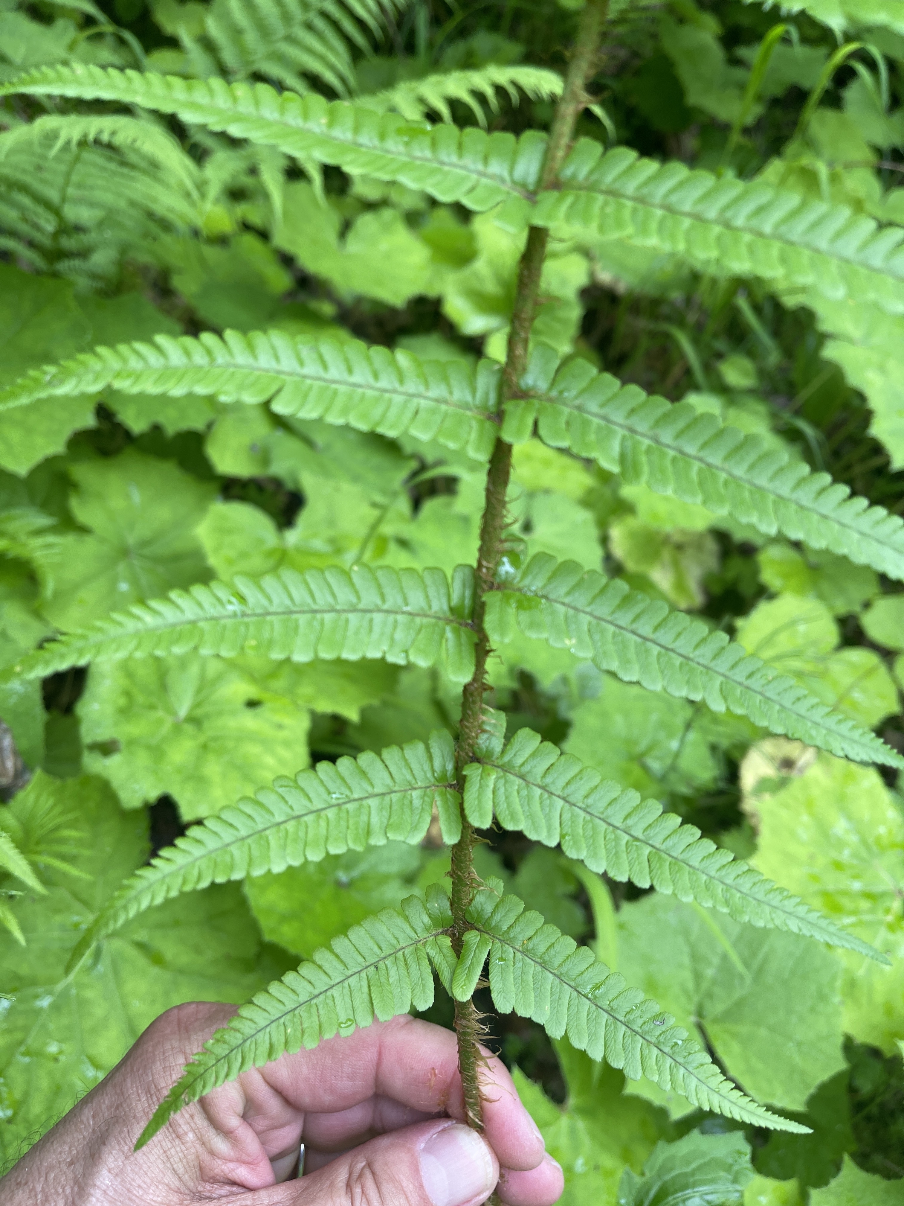 das sieht mir sehr nach D. affinis subsp. affinis var. affinis aus, allerdings eine Jungpflanze bzw. recht schattig stehend: Was spricht für Varietät affinis: Spreite glänzend, sehr regelmäßig (ordentlich), Blattnervatur gut erkennbar, bei den untersten Fiedern sind die basiskopen und akroskopen Fiederchen etwa gleich lang, die unterste Fieder ist schmal dreieckig. An dem schattigen Wuchsort ist der Blattstiel recht lang und schlank (die Pflanze will ans Licht), auch sind die Schuppen nicht so kräftig entwickelt, dennoch sollten im mittleren Bereich der Rhachis einzelne Schuppen länger als 8mm sein, voraussichtlich auch bei dieser jungen Pflanze.