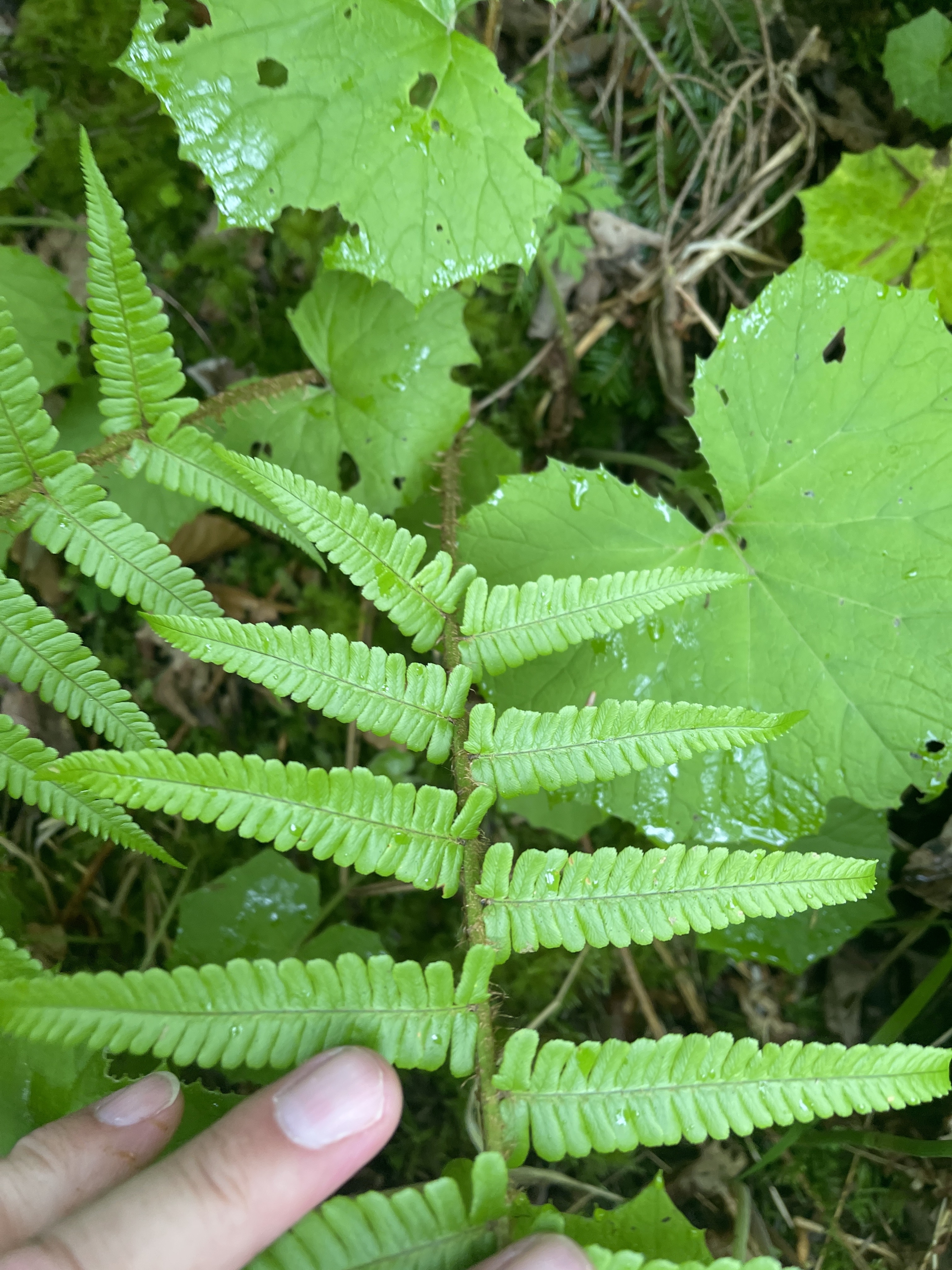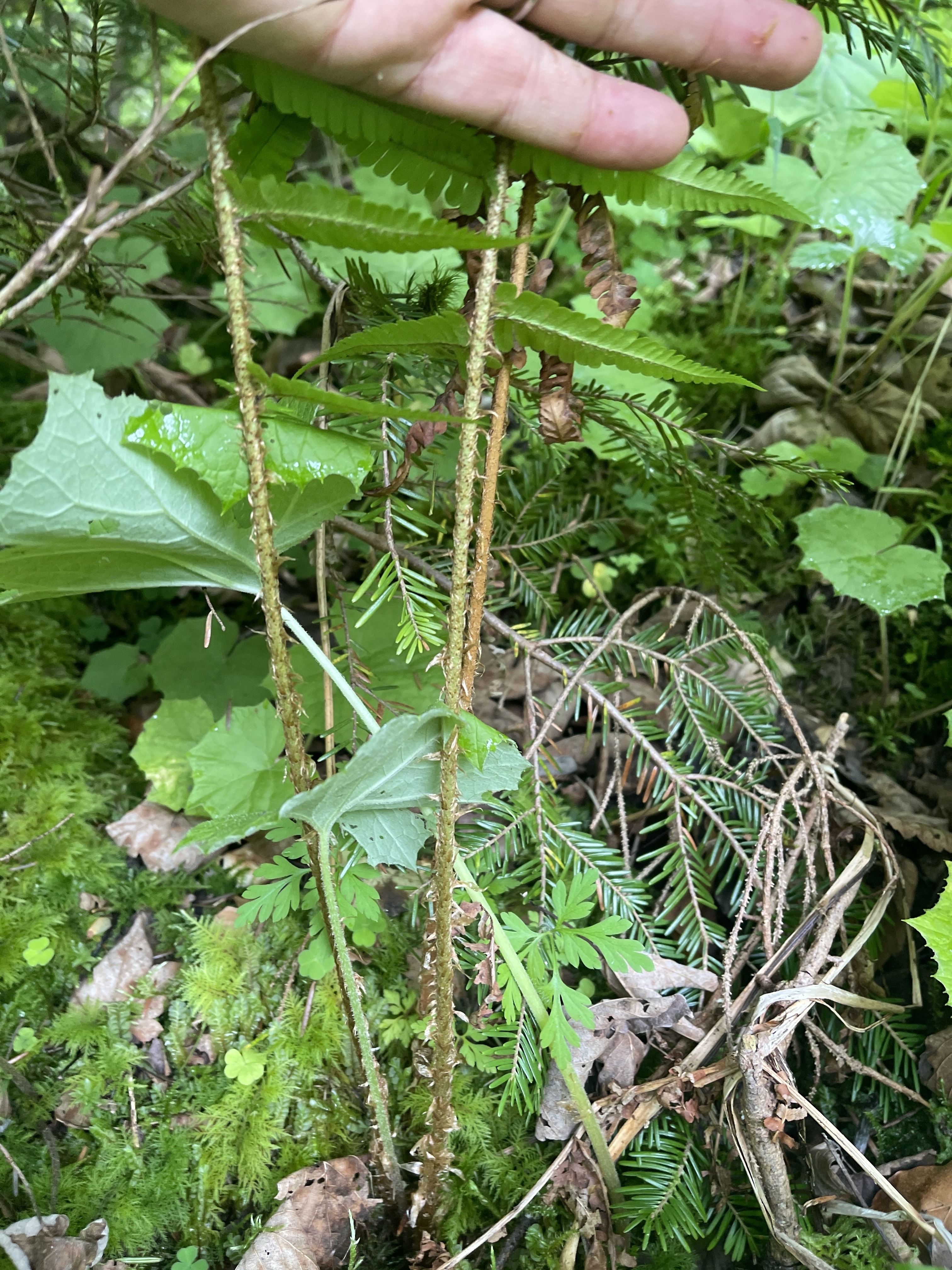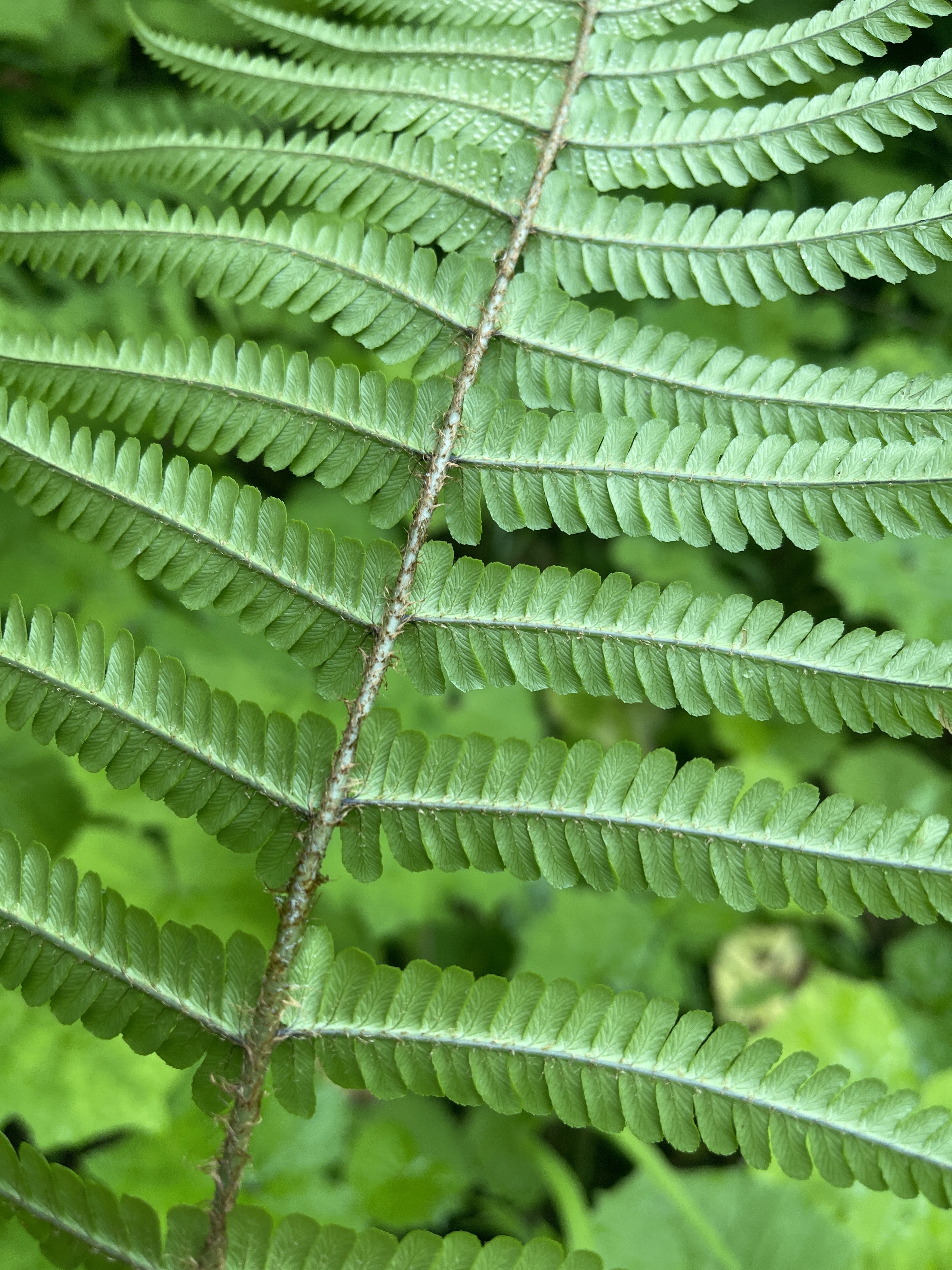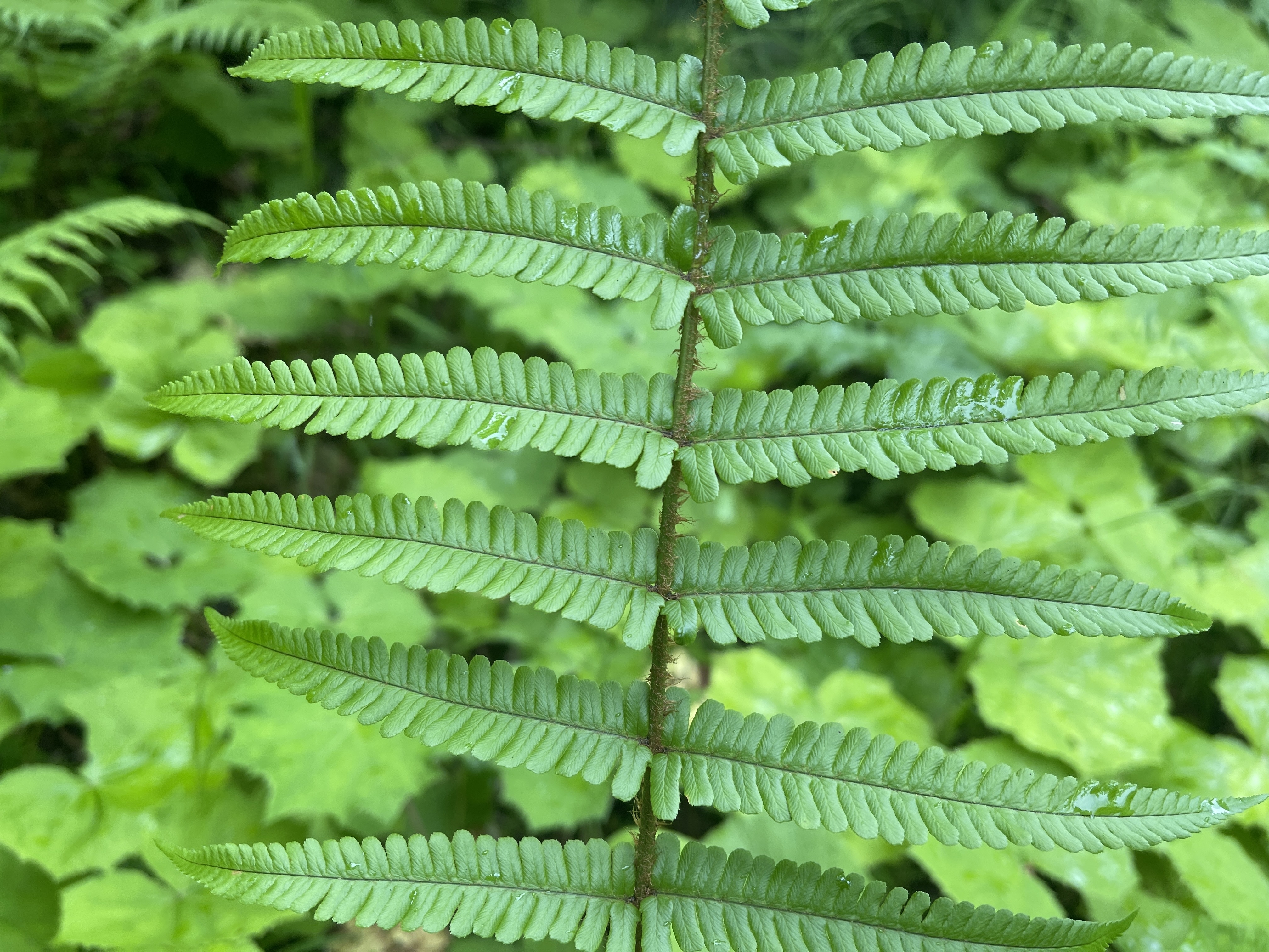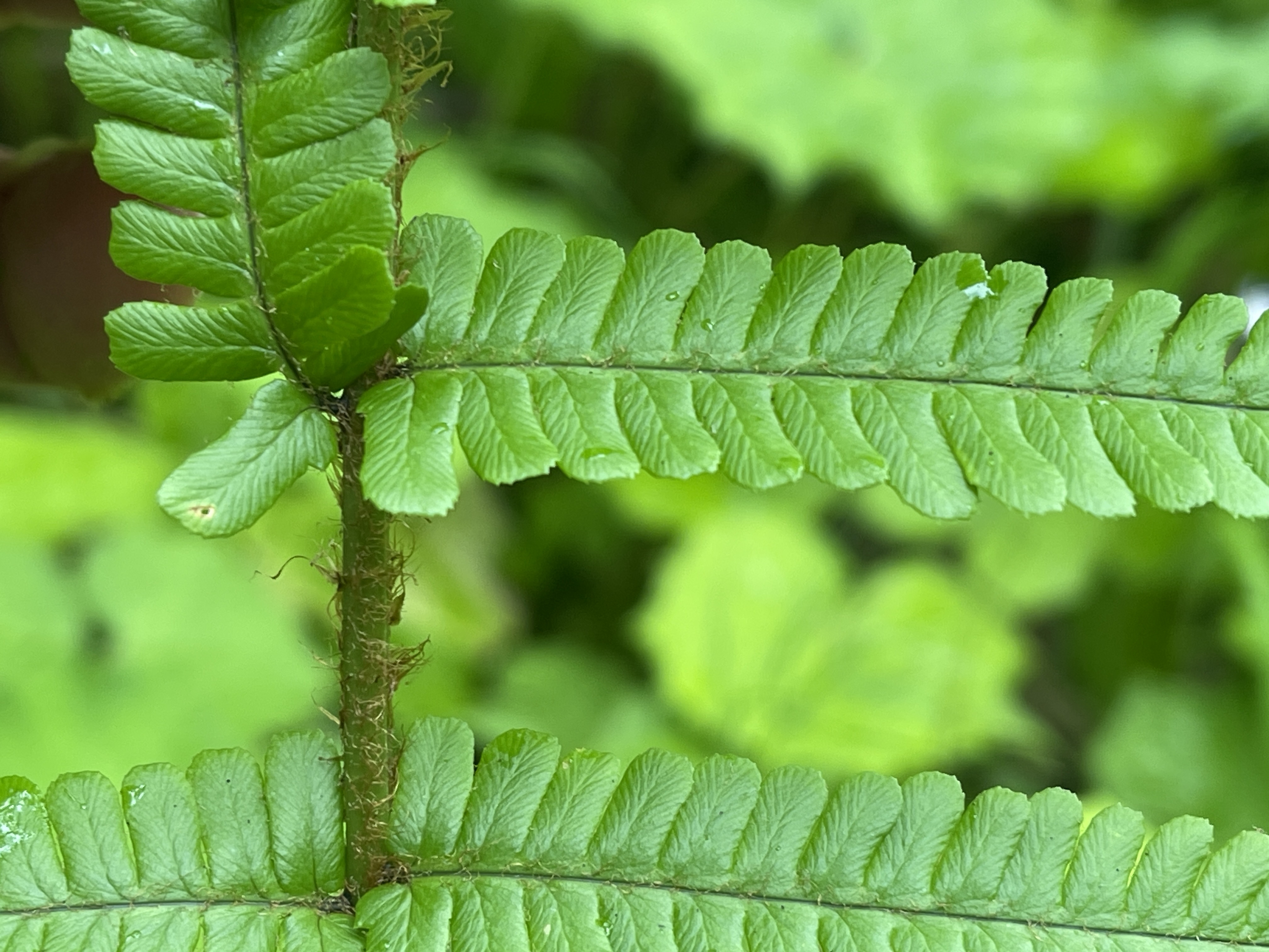 das sieht mir sehr nach D. affinis subsp. affinis var. affinis aus, allerdings eine Jungpflanze bzw. recht schattig stehend: Was spricht für Varietät affinis: Spreite glänzend, sehr regelmäßig (ordentlich), Blattnervatur gut erkennbar, bei den untersten Fiedern sind die basiskopen und akroskopen Fiederchen etwa gleich lang, die unterste Fieder ist schmal dreieckig. An dem schattigen Wuchsort ist der Blattstiel recht lang und schlank (die Pflanze will ans Licht), auch sind die Schuppen nicht so kräftig entwickelt, dennoch sollten im mittleren Bereich der Rhachis einzelne Schuppen länger als 8mm sein, voraussichtlich auch bei dieser jungen Pflanze.