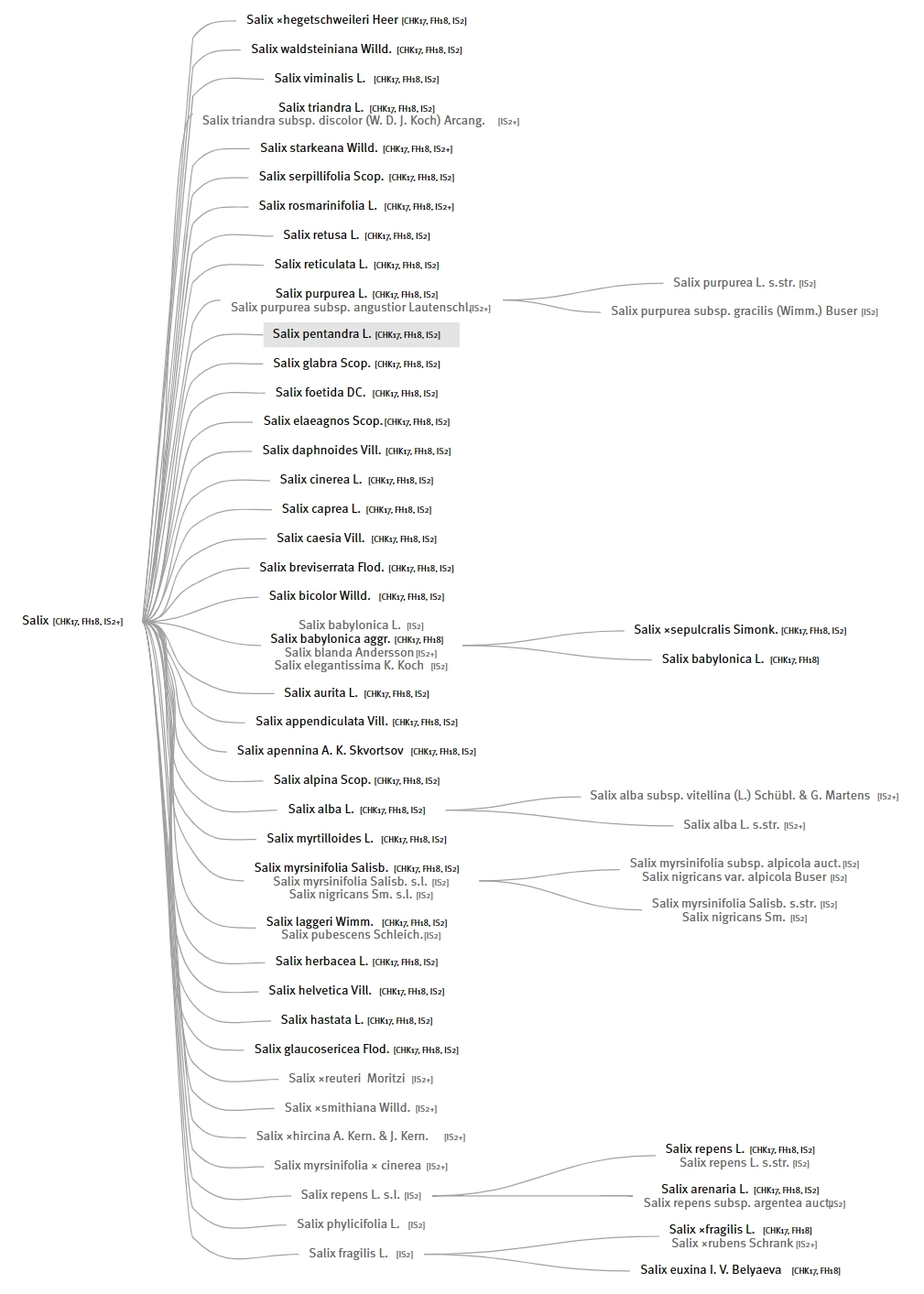 und weiter unten " We have confirmed that crack willow (S. fragilis) as a ‘pure’ species is common in Europe and is an important part of alluvial habitats in the hilly and submontane regions of Central Europe. " In den supplementary materials finden sich die Angaben zu den beprobten Weiden; die meisten Salix fragilis und Salix ×rubens Proben stammen aus der Tschechischen Republik (aus der CH hats 1 Probe dabei, leider nur von C. caprea).