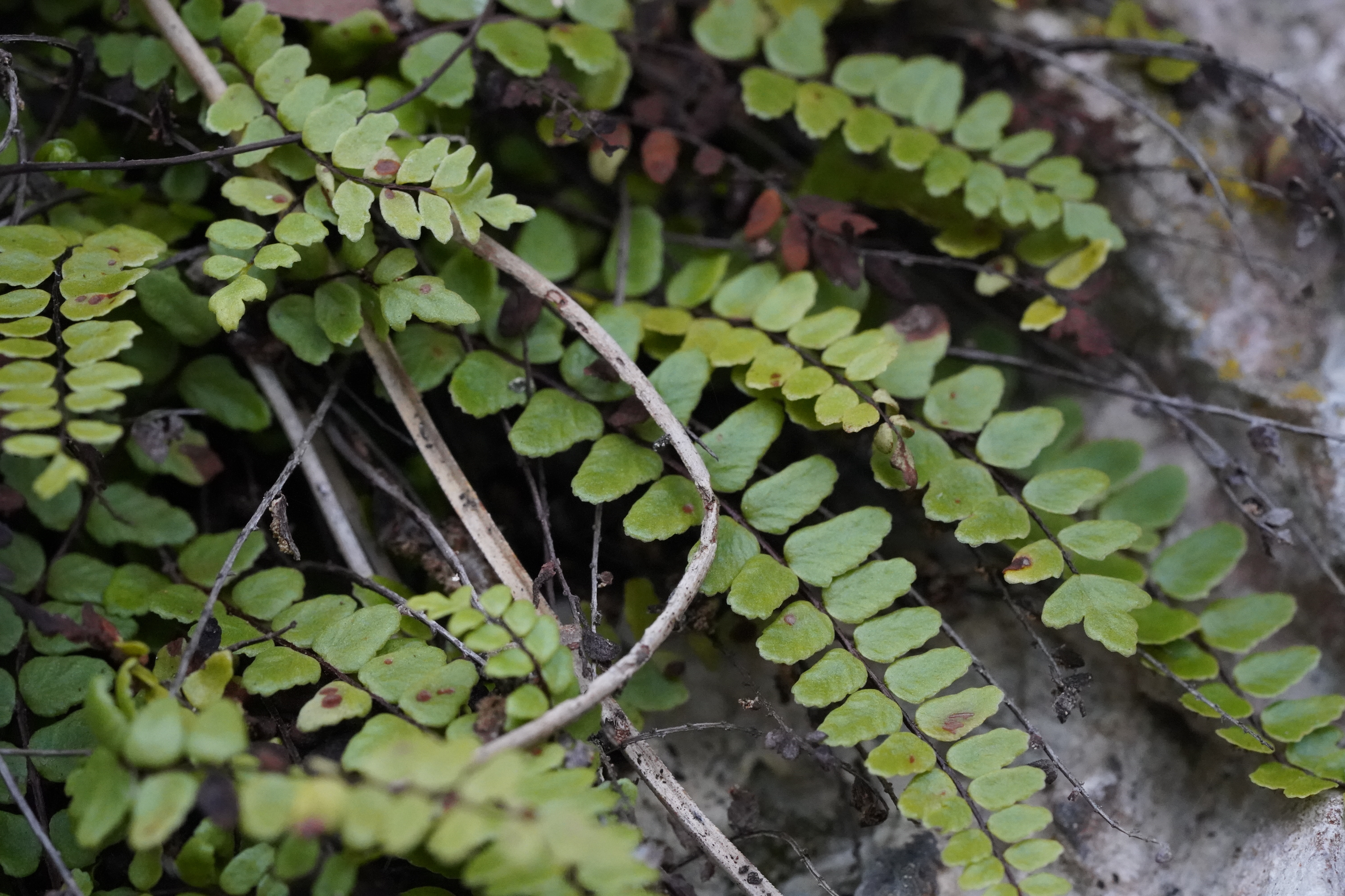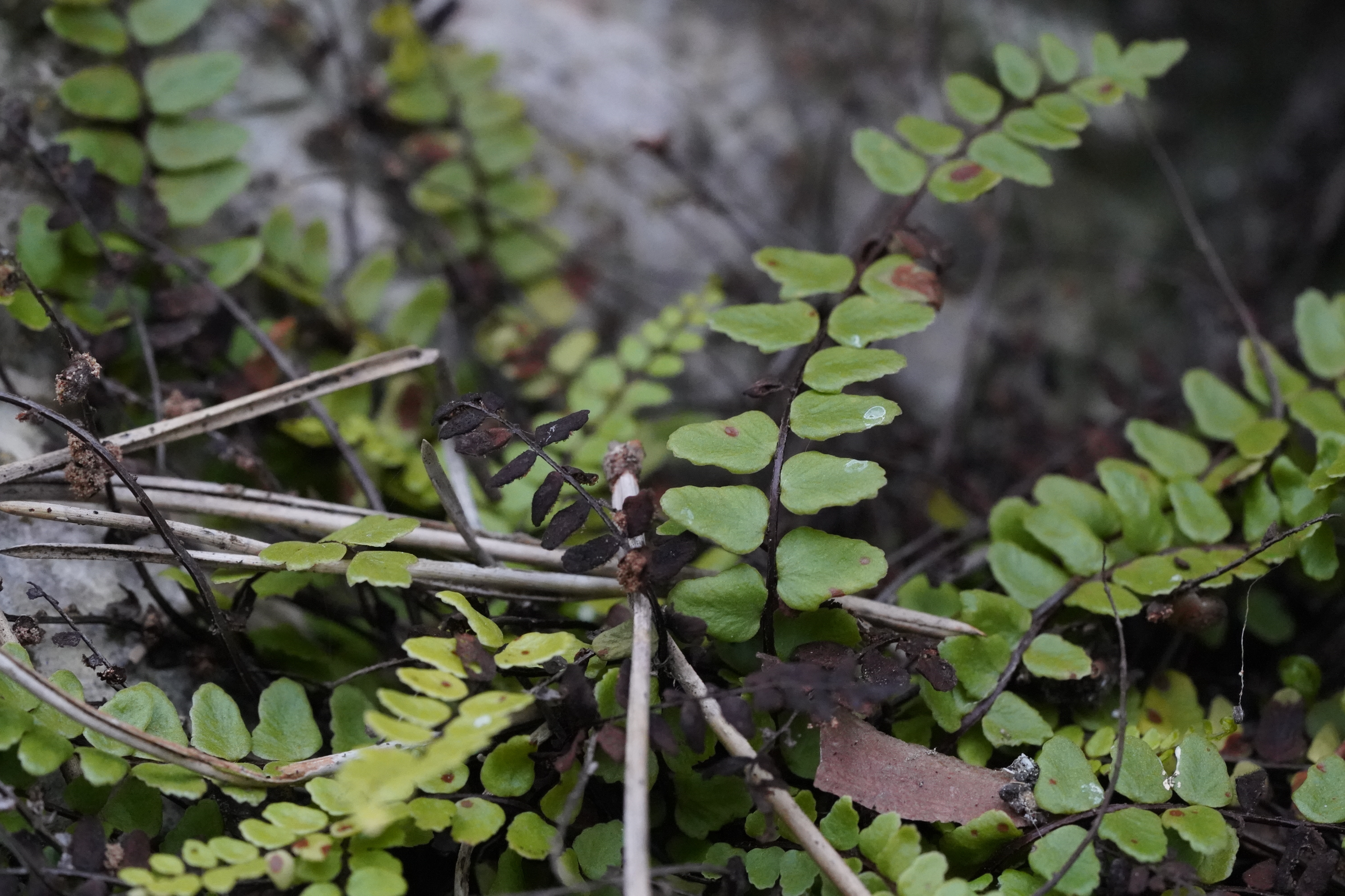 Also, das ist NICHT quadrivalens, da die Fiedern geöhrt sind; die Rachis ist ungelemässig gebogen; die Fiedern bis kanpp vor der Spitze etwa gleich gross bleiben. Leider fehlen die Merkmale der Fiederunterseiten, aber auch das Habitat (moosarmer Dolomit- oder Kalkfels) spricht für A. t. subsp. hastatum (= A. csikii) oder subsp. pachyrachis (= A. jessenii). Die beiden sind nicht immer leicht zu unterscheiden und erneut kann man die Merkmale der Sori nicht sehen. Aber ich bin mir ziemlich sicher, dass es pachyrachis ist. Was dafür spricht: feste Struktur, dunkle Farbe (hastatum ist oft dünner und heller); die untersten Fiedern sind nicht nach unten verlängert; relativ wenige, grobe Zähne; Fiedern mit deutlichen durchschienenden Zellrand.