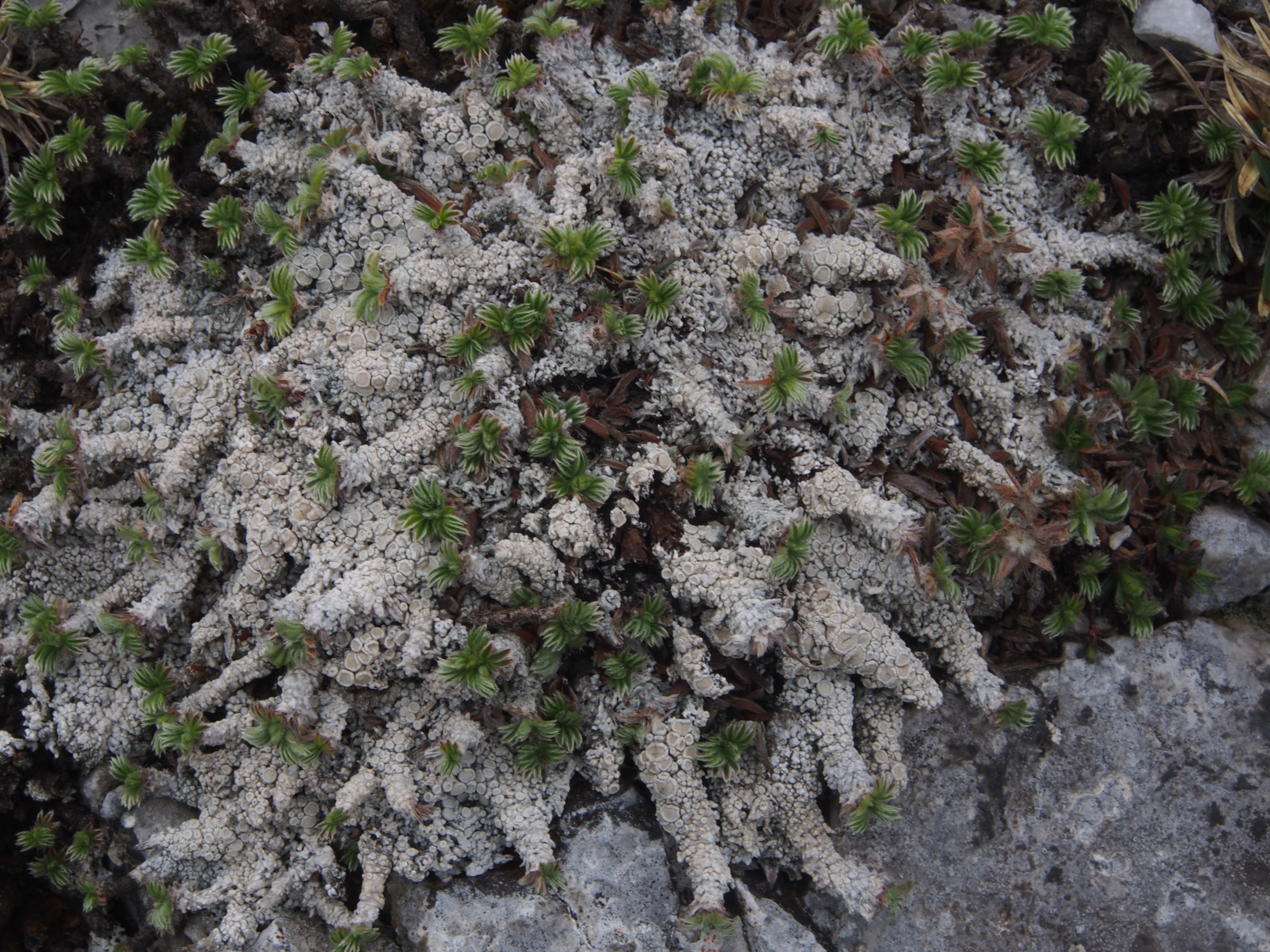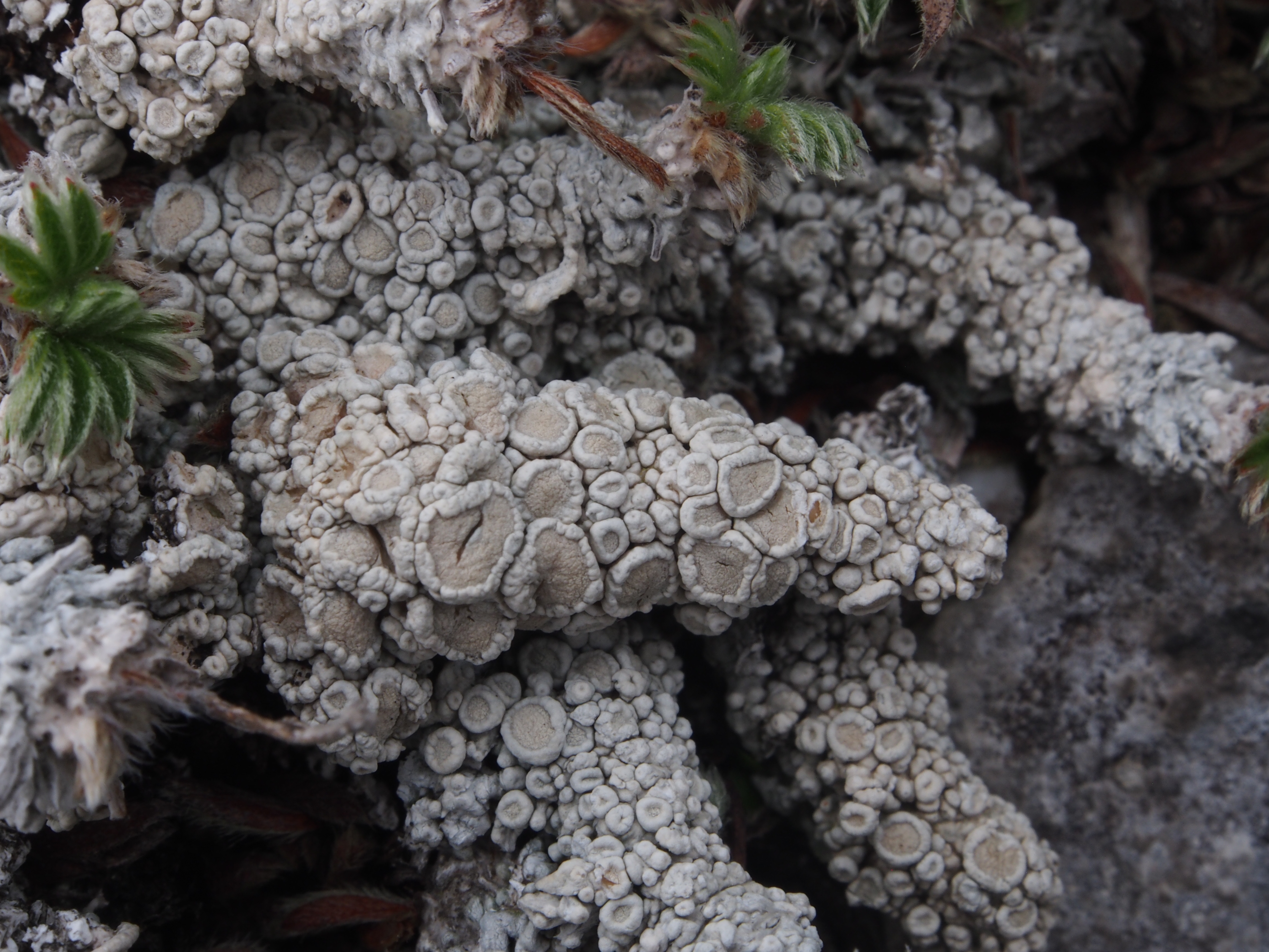 Auf einer Tour durch die Ostalpen (Rax, ca 2000m) habe ich diese Flechte gefunden, welche ein kleines Sträuchlein (Potentilla clusiana?) ganz schön in die Zange nimmt. Ob die Pflanze darunter gelitten hat ist schwierig zu sagen, der Flechte aber scheint es prächtig zu gehen. Mein bester Vorschlag für die Art ist Ochrolechia parella, bin mir da aber überhaupt nicht sicher.