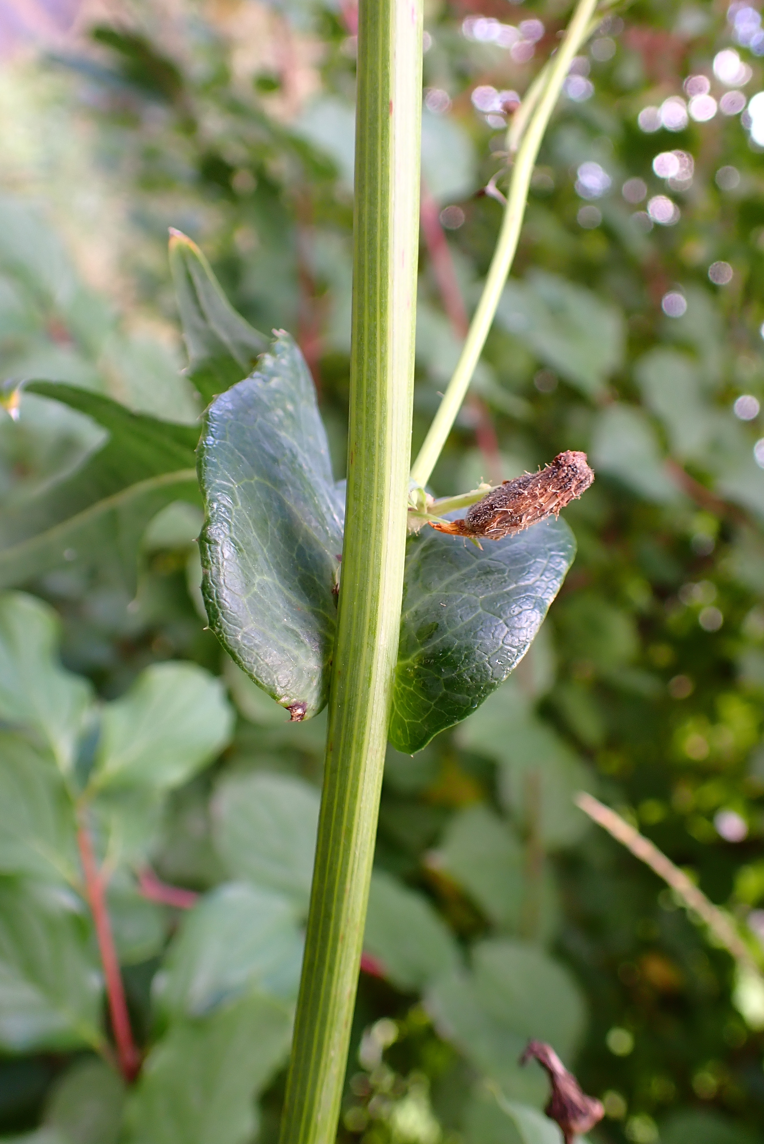 Die einjährige Raue Gänsedistel (Sonchus asper) zeichnet sich durch runde, nach oben gebogene und dem Stängel anliegende Blattöhrchen und glatte Früchte mit schmalen Längsrippen aus.