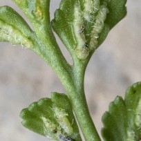 - Nach der Sporenreife ist oft die gesamte Unterseite der Fiederchen mit leeren, braunen Sporangien bedeckt; die Form der Sori lässt sich dann nicht mehr erkennen.