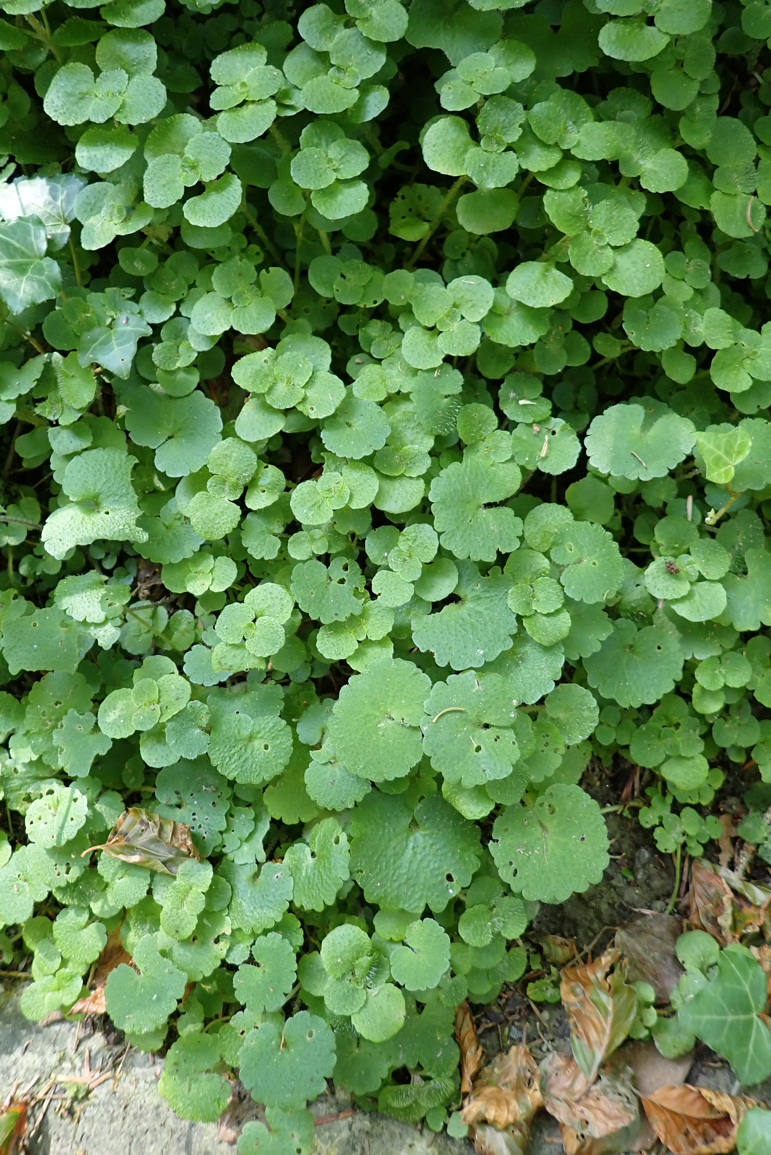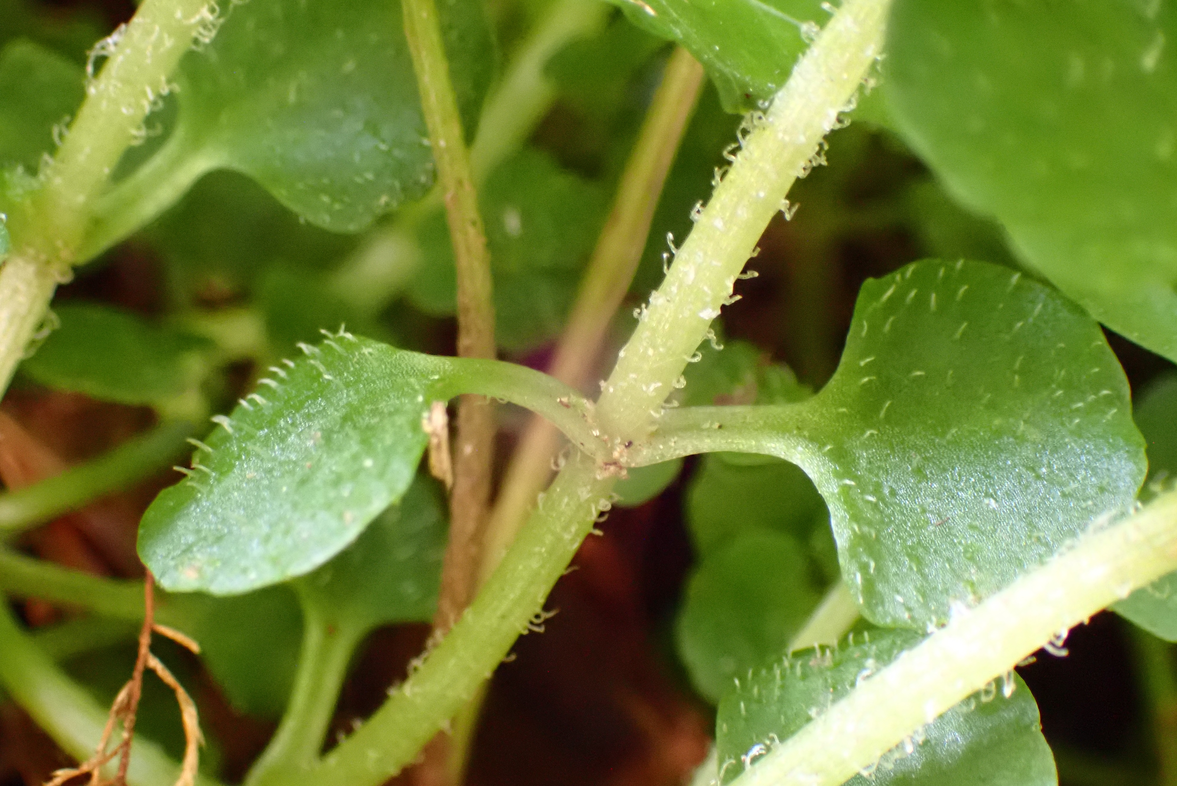 - Blattspreite der grundständigen Blätter rundlich, an der Basis gestutzt, in den Blattstiel verschmälert; Rand gekerbt, Oberseite zerstreut und abstehend behaart oder ± kahl, Unterseite ± kahl.