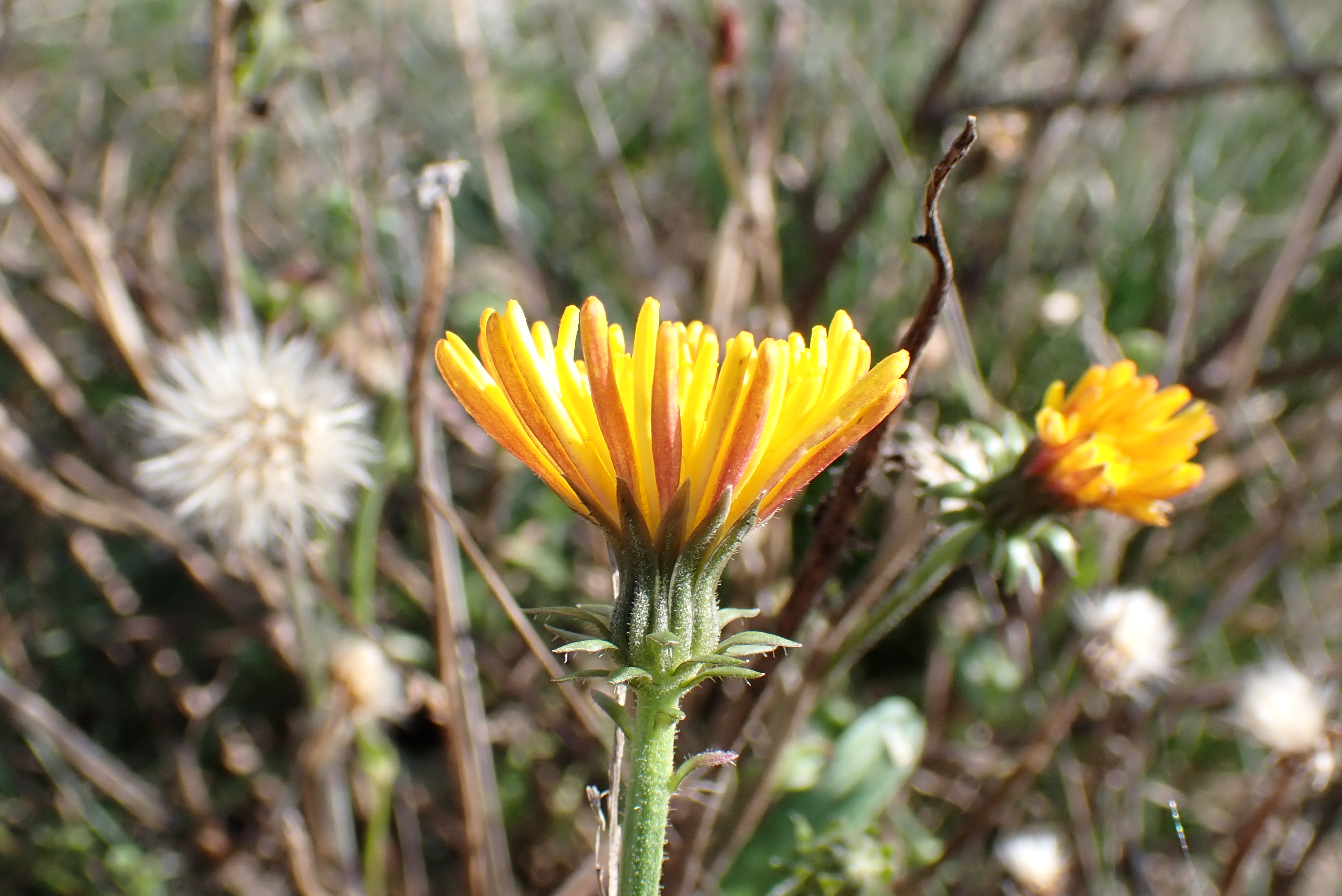 Ganz selten gerate ich an eine sog. Verbänderung. Gestern wieder geschehen bei Picris hieracioides: Der Stängel dieses Exemplars war aussergewöhnlich breit, aber völlig plattgedrückt als wäre ein Auto drübergefahren. Ich musste zuerst eine Weile überlegen, was das überhaupt ist. Das hält die Pflanze indes nicht vom Wachsen und Blühen ab. Diese Picris hatte mehrere Blütenstände normaler Form an der Spitze einer verbänderten Sprossachse. Mögliche Auslöser einer Verbänderung sind Schädigungen durch Viren und phytopathogene Bakterien. Das Phänomen ist hier beschrieben: