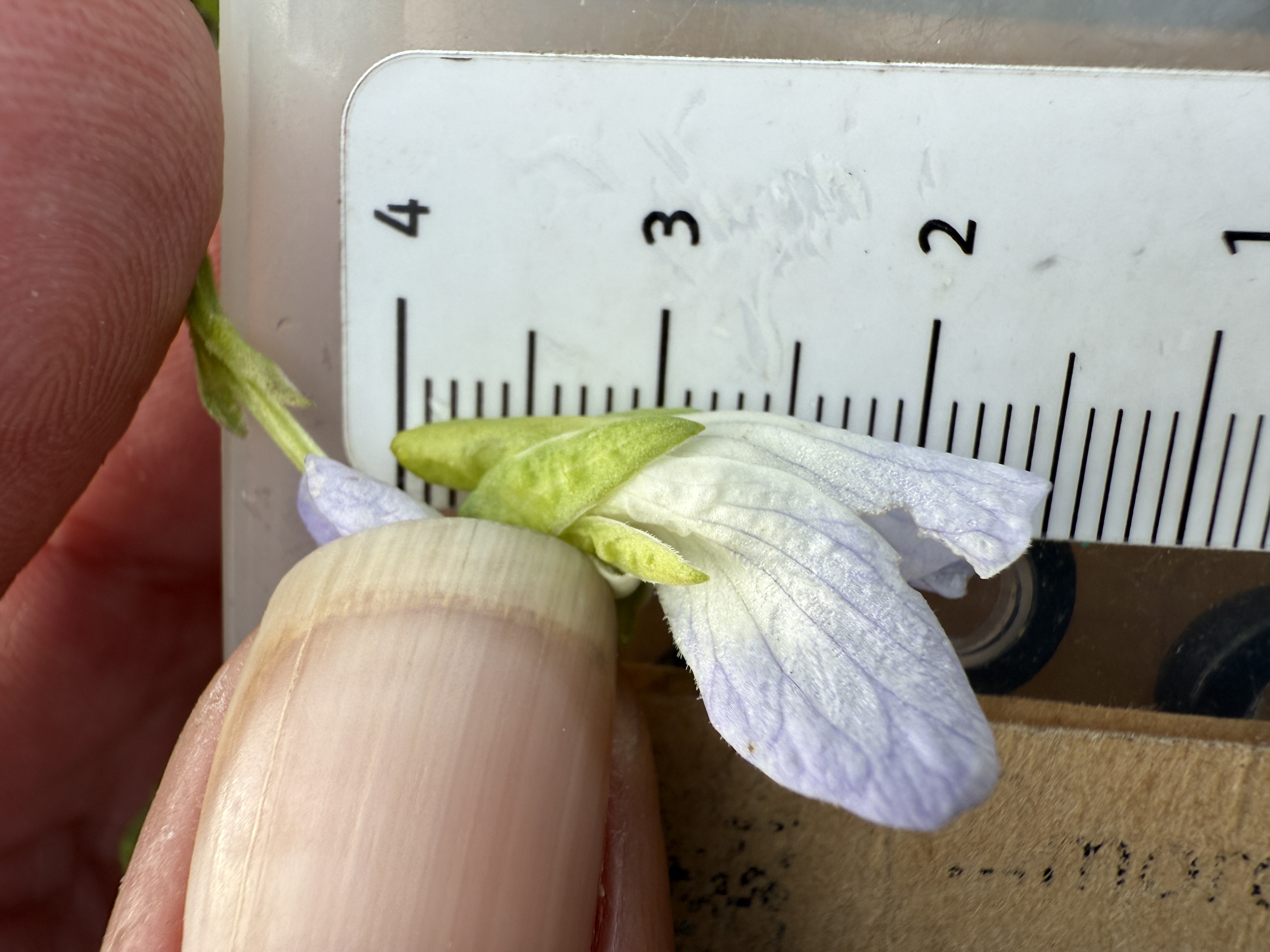 • Kronblätter am Rand kurz behaart, das gespornte Kronblatt 18–25 mm lang, Blüte blass hellblau mit weissem Schlund, Sporn grünlich