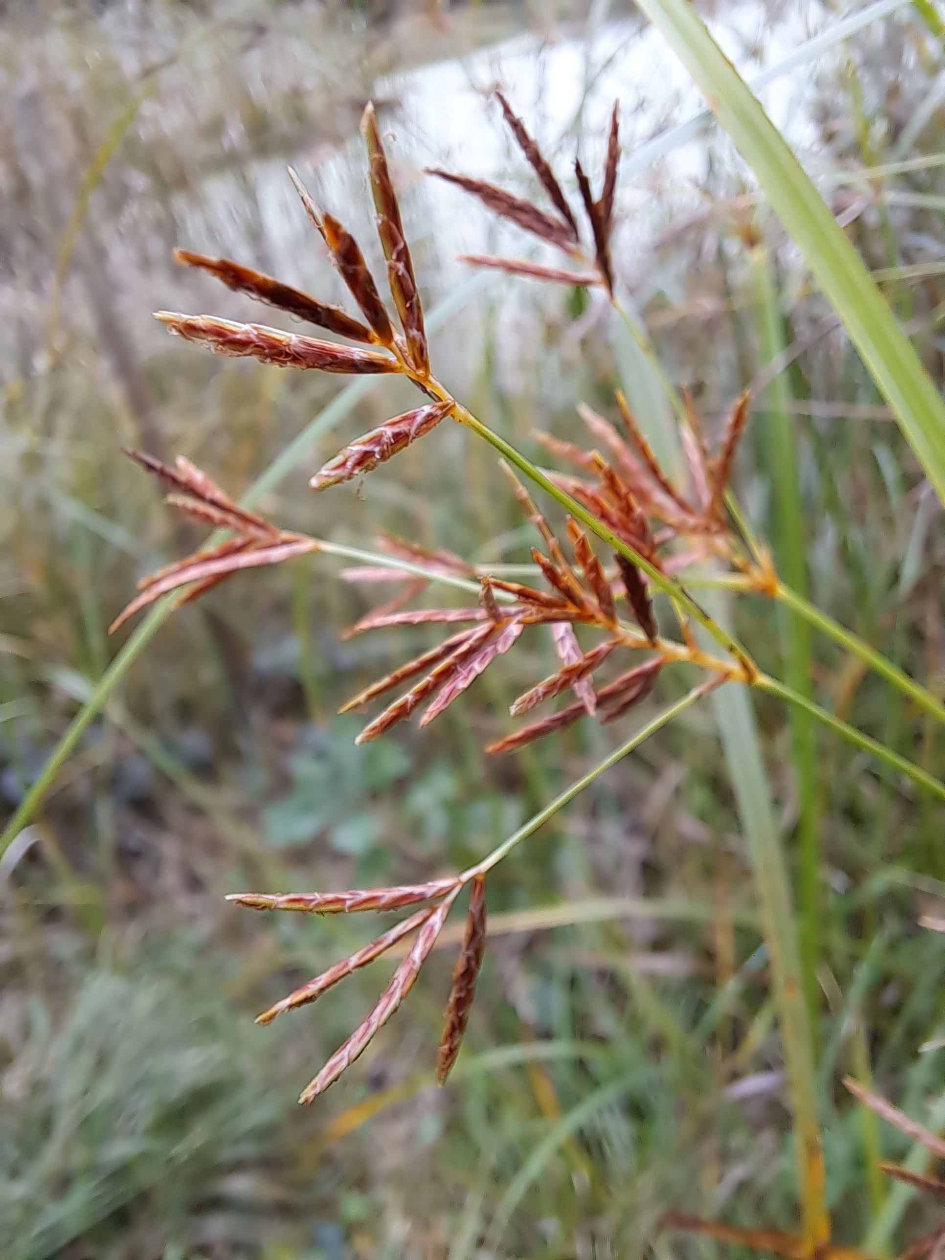 - Ährchen locker am Ende der Äste, schmal lanzettlich, bis über 20 mm lang, beidseits zugespitzt. Durch Tragblätter rotbraun. Gesamtblütenstand von den Hochblättern weit überragt.
