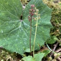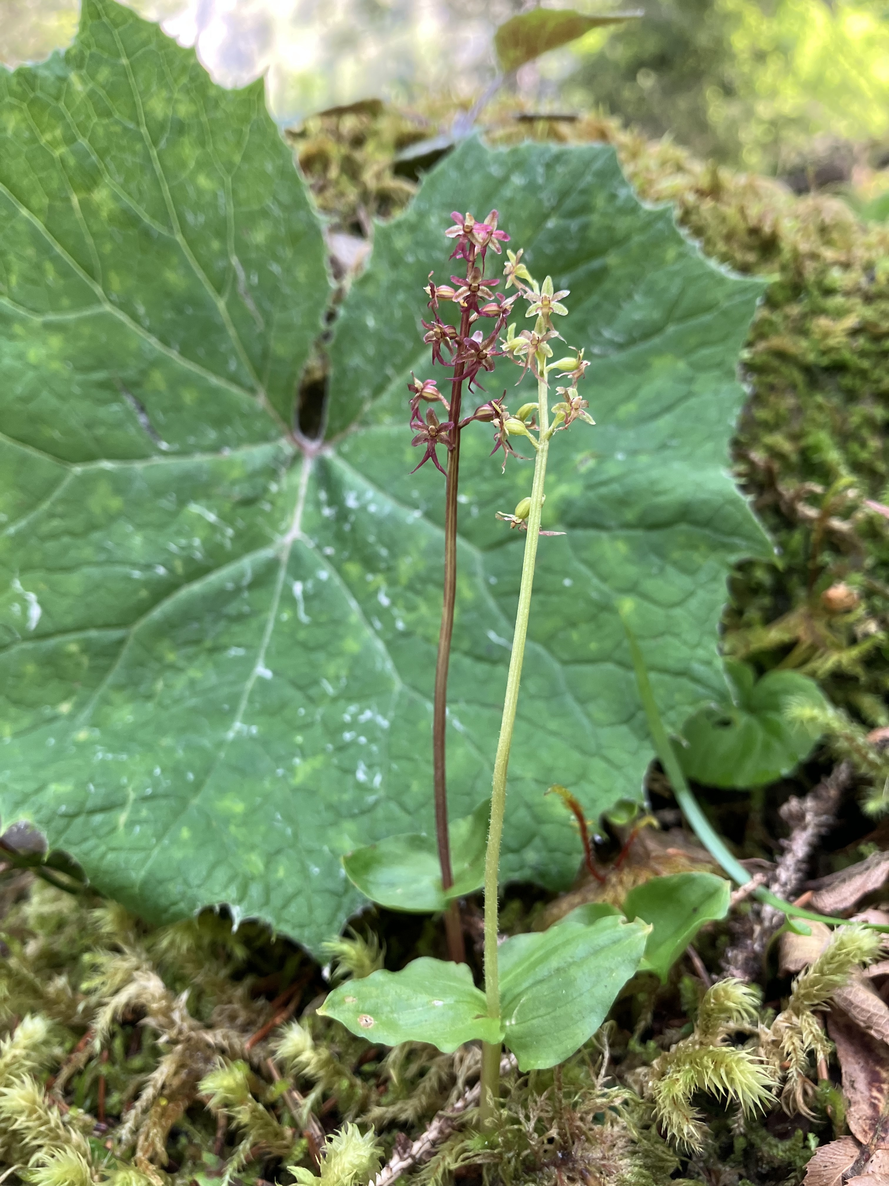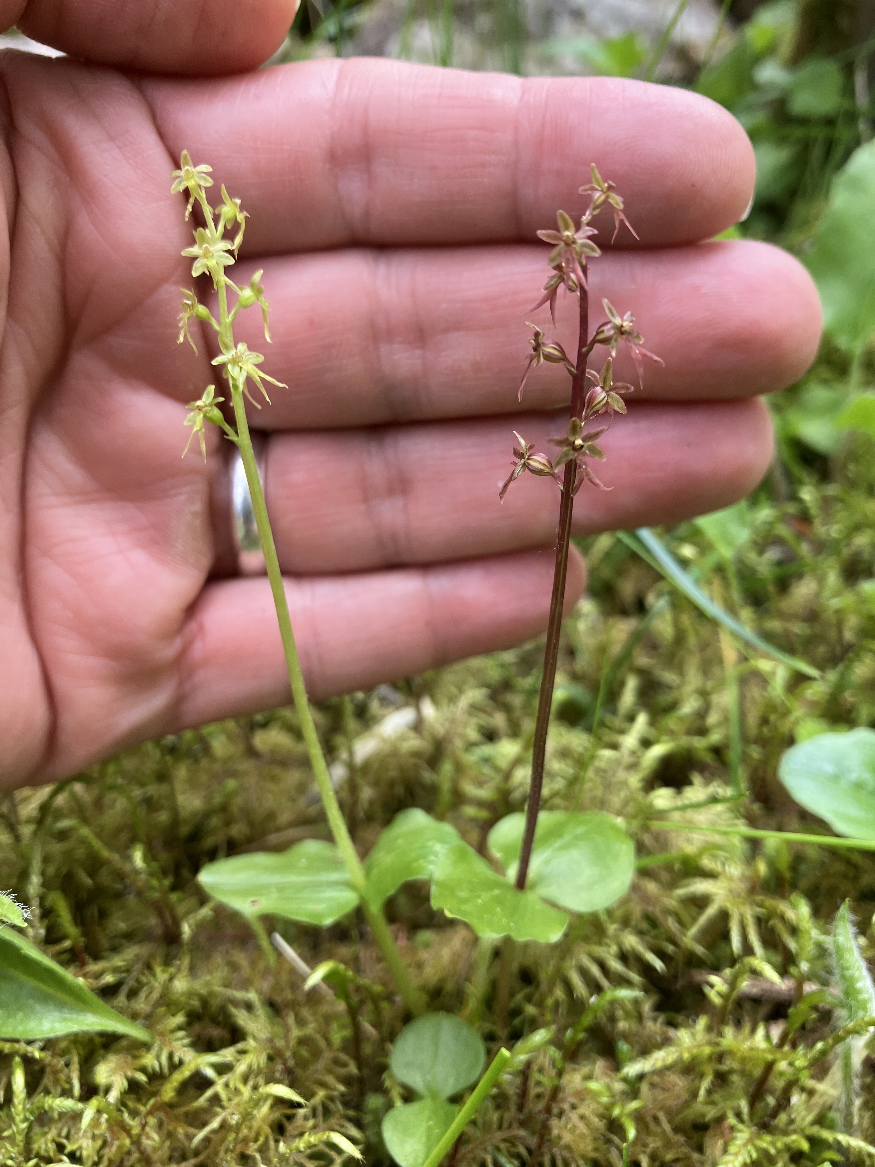Aufgrund ihrer Grösse unverwechselbar: Grosses Zweiblatt (Listera ovata; vegetativ) und Kleines Zweiblatt (Listera cordata; blühend). Sefinental, Lauterbrunnen (BE), 12.6.2014 (H.P. Schlatter)