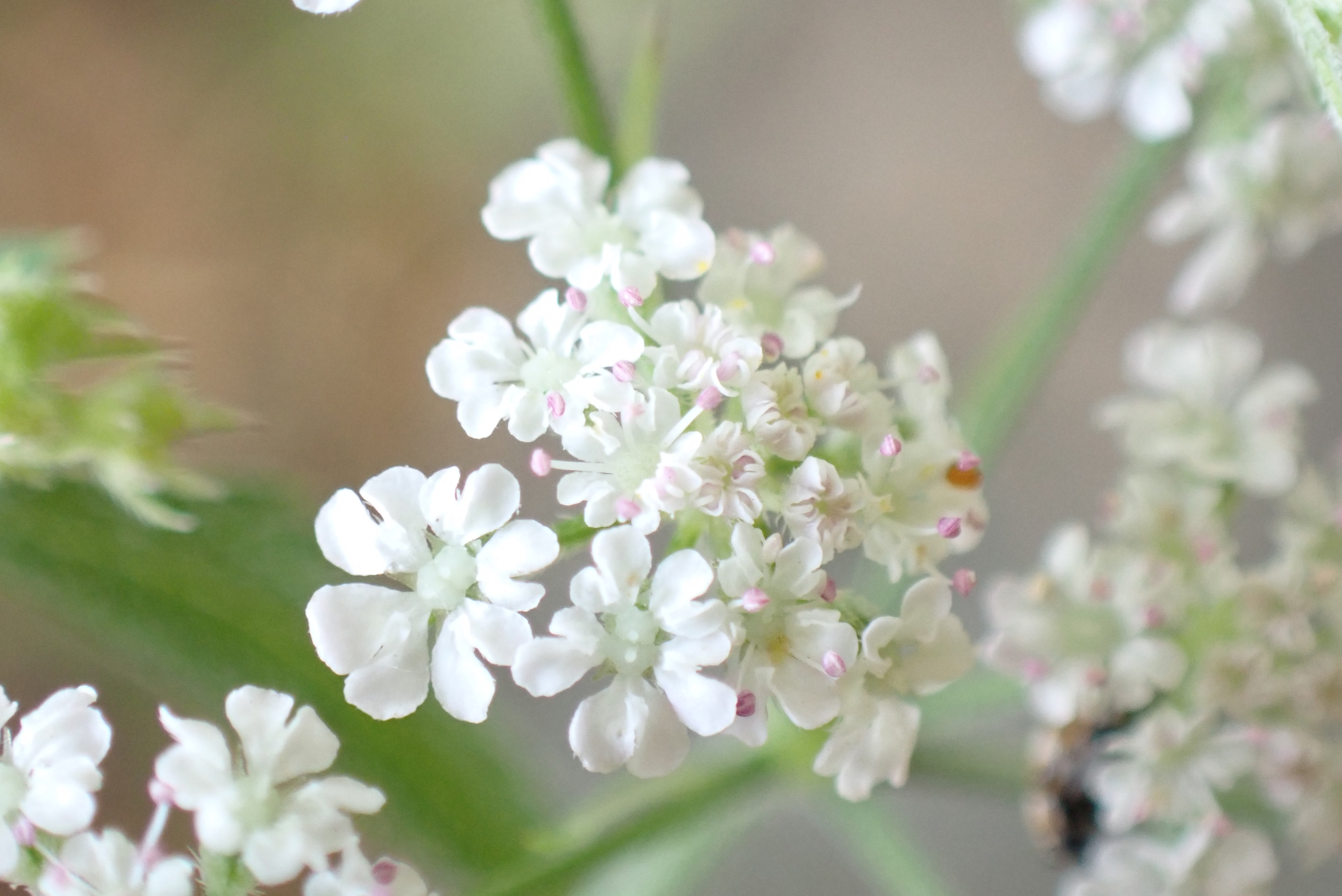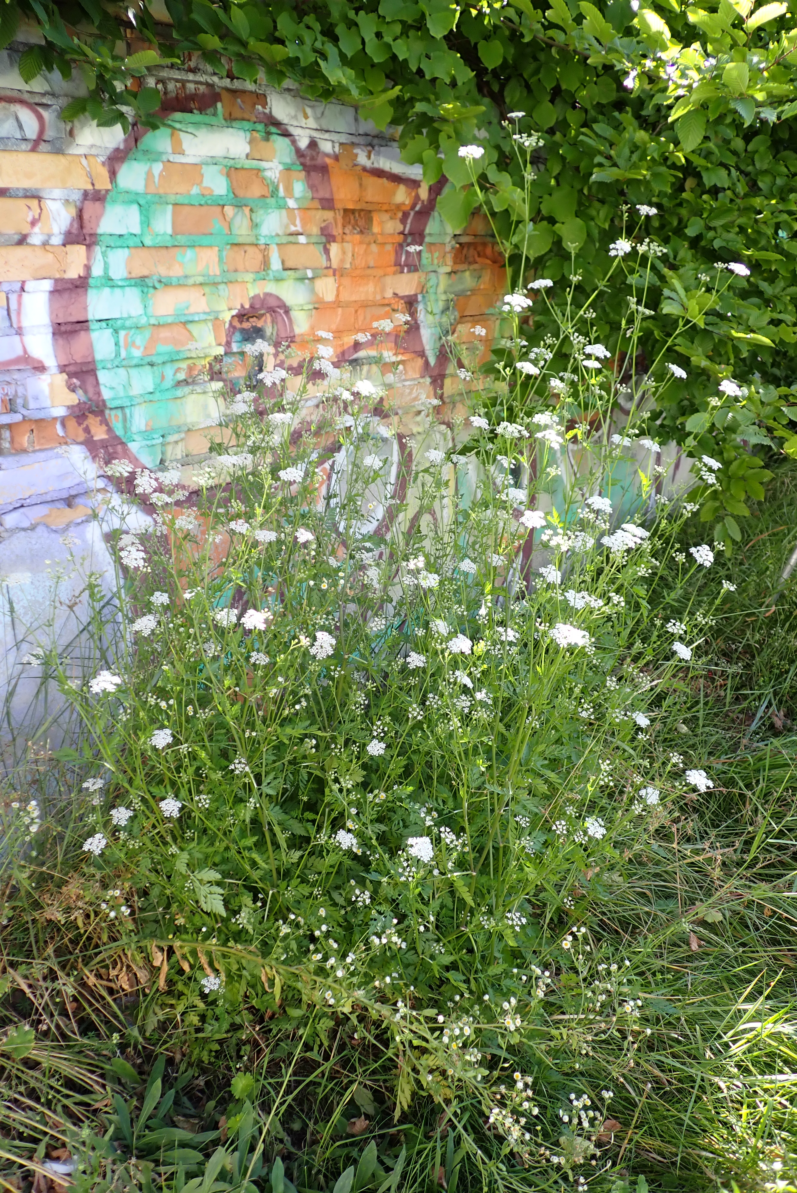 Reifende Fruchtstände der Wald-Borstendolde (Torilis japonica) links und der Feld-Borstendolde (Torilis arvensis) rechts. Bern (BE), 22.6.2025 (Muriel Bendel)