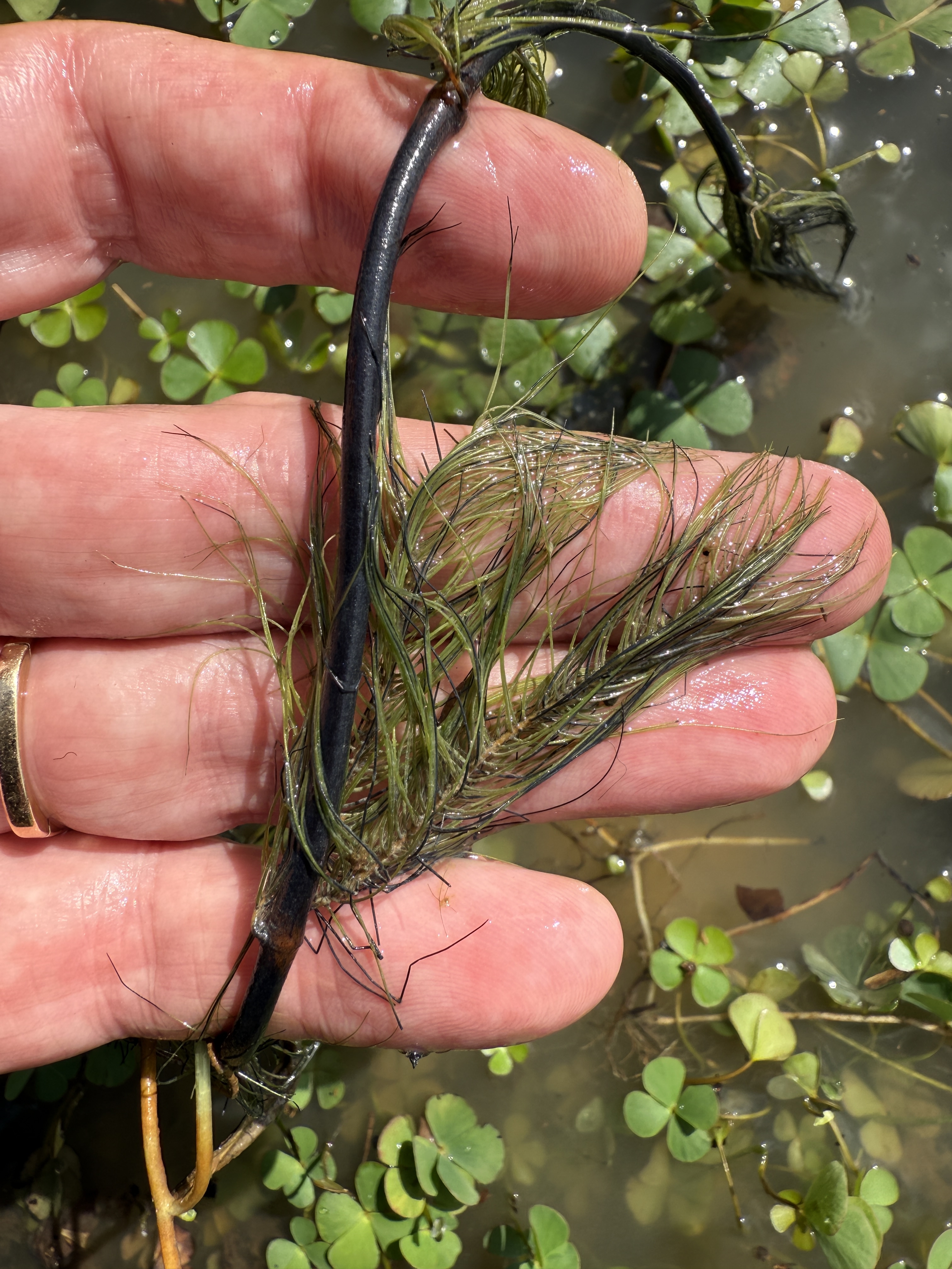 Gegen oben wird der Stängel dicker und werden die Internodien kürzer (zuoberst gestaucht) - An den untergetauchten Internodien quirlständige, fein vierzeilig gefiederte und assimilierende Nebenwurzeln