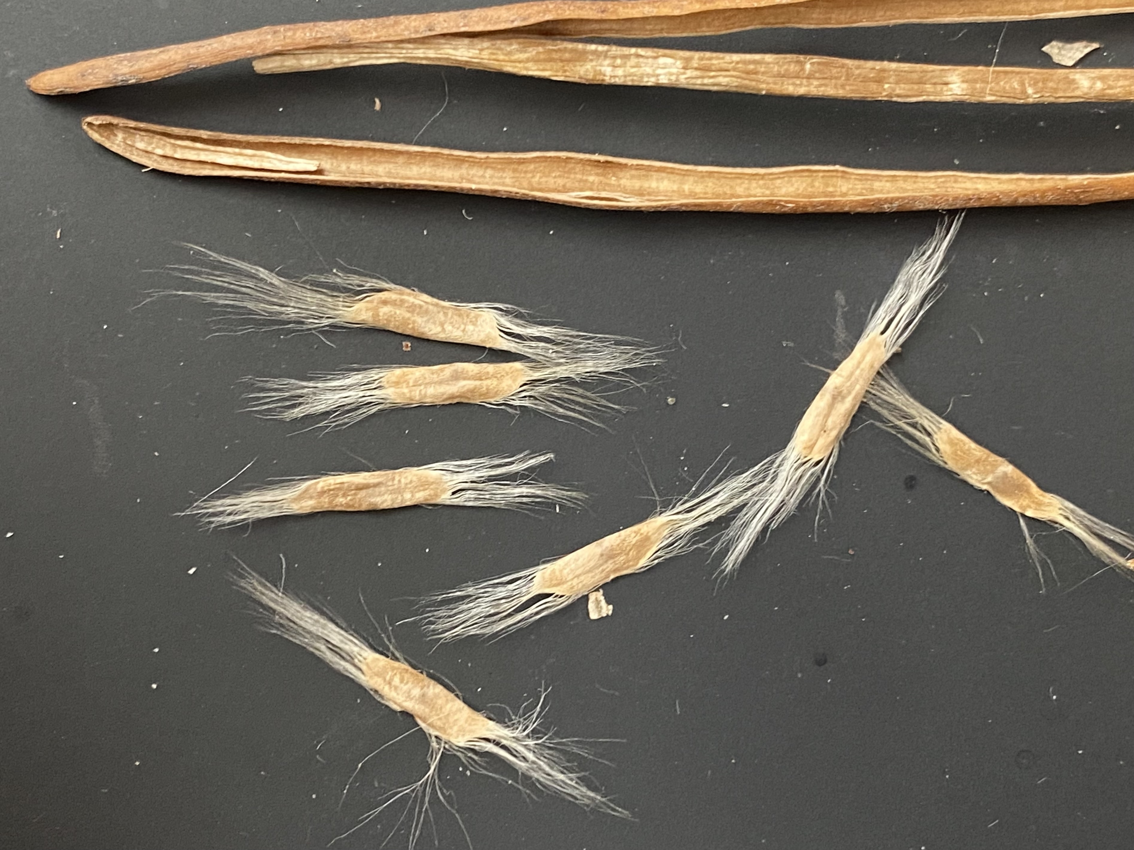 Die Früchte sind 25 bis knapp 40 cm lang und knapp 1 cm dick (und hartwandig); die Samen (mit den abstehenden Schnauz-Haaren) 4 bis gut 5 cm lang.