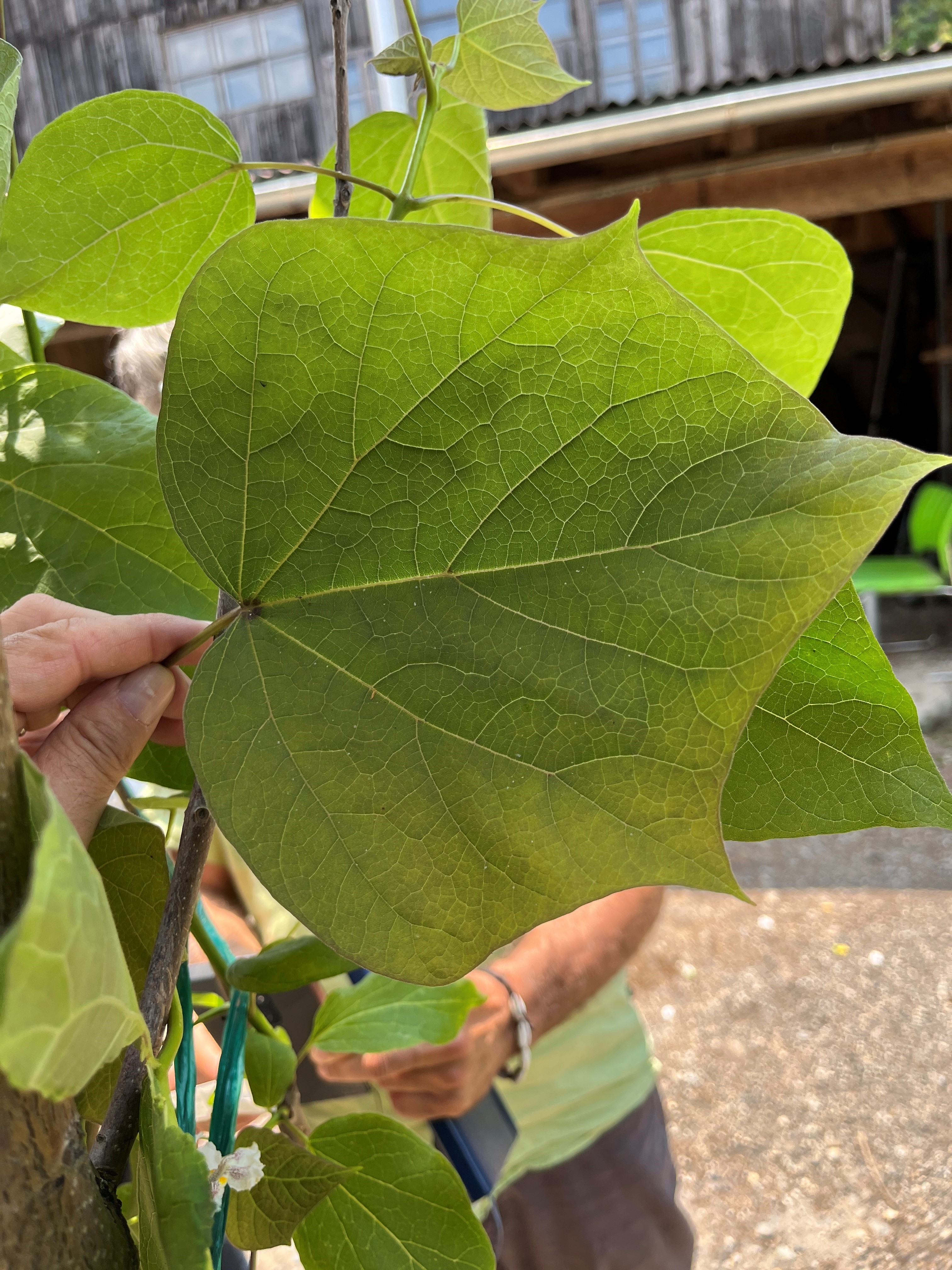 Achtung, der in einem Beitrag zu Catalpa erwähnte Losbaum, Clerodendrum trichotomum ist was den Blattgeruch anbelangt ganz schlimm (unter Dendrologen: stinkt nach toten Affen) – dafür ist der Duft der Blüten im Spätsommer fantastisch! Wer nur ein Foto vor sich hat = die Blätter von Clerodendrum sind kleiner und haben eine andere Nervatur. An der Basis entspringen drei kräftige Nerven, die Seitennerven verlaufen bogig. Aber zurück zu Catalpa.