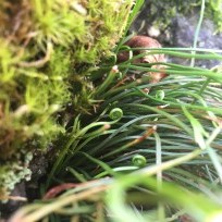 - Dorniger Moosfarn (Selaginella selaginoides): Pflanzen unverzweigt, nur wenige cm hoch; Sporangien in den Blattwinkeln der oberen Sprossabschnitten: oben Mikrosporangien, unten Megasporangien (heterospor).