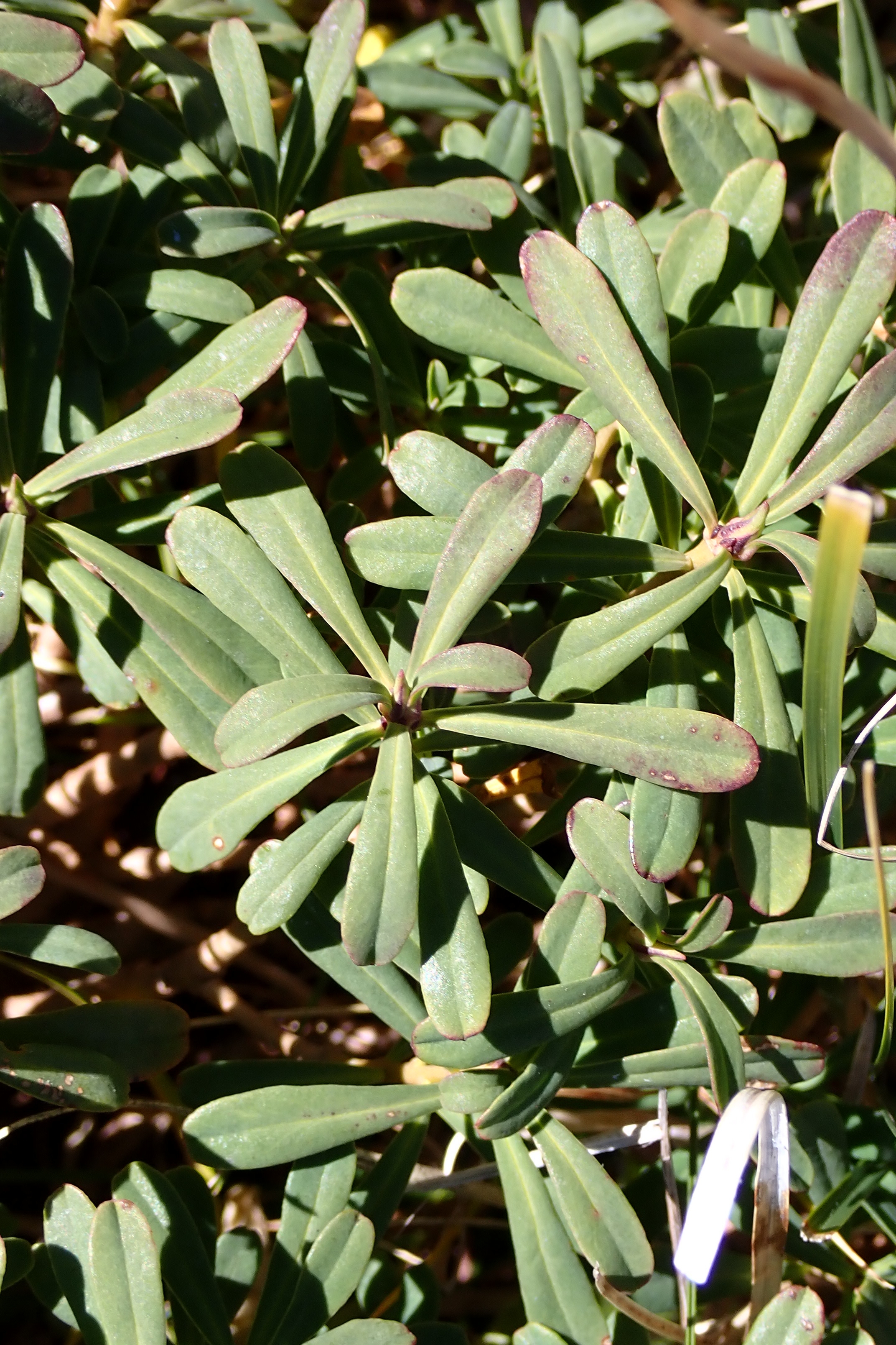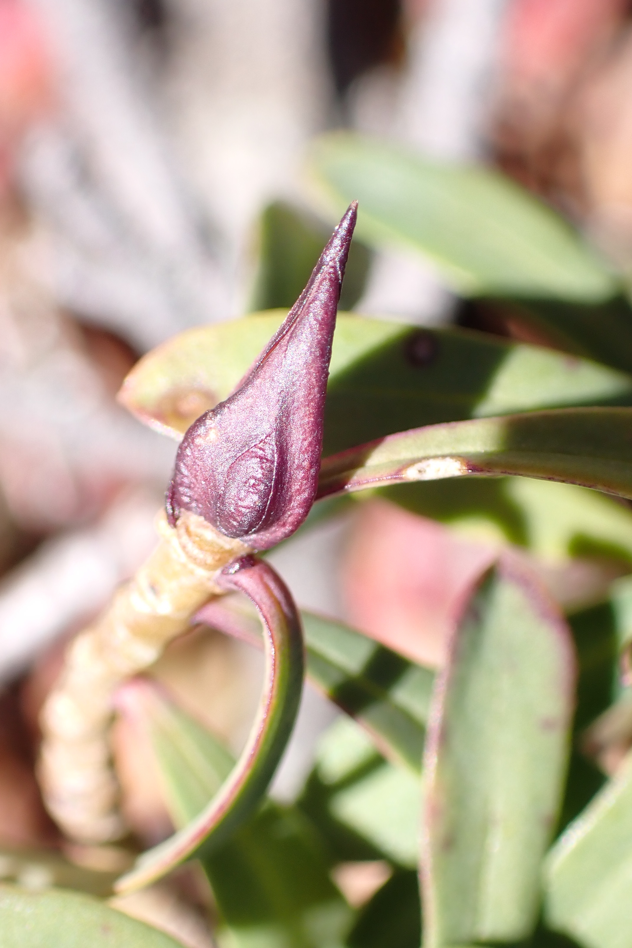 - Blätter wechselständig, ohne Nebenblätter, sitzend, immergrün, ledrig, bis ca. 2 cm lang, kahl.