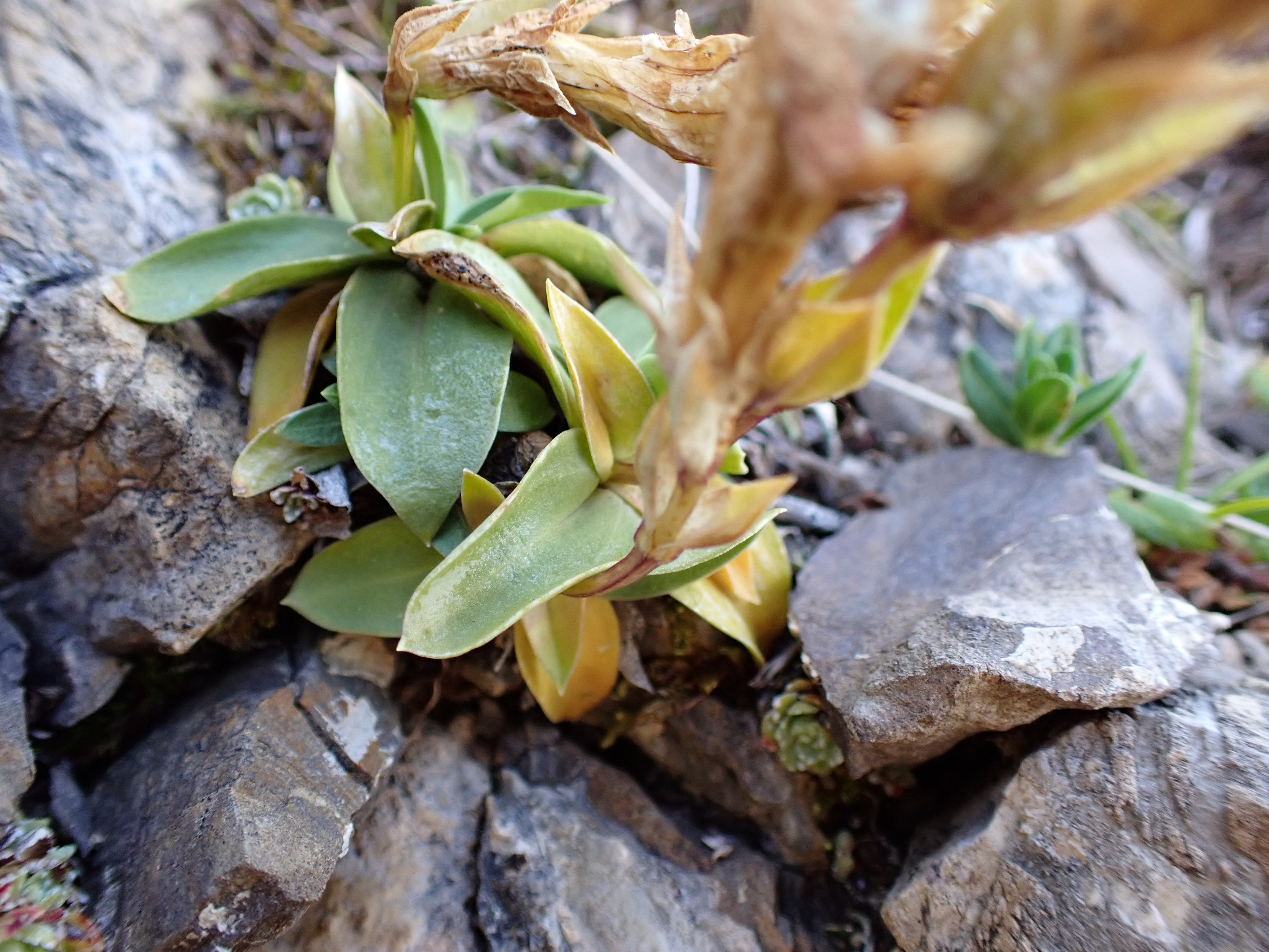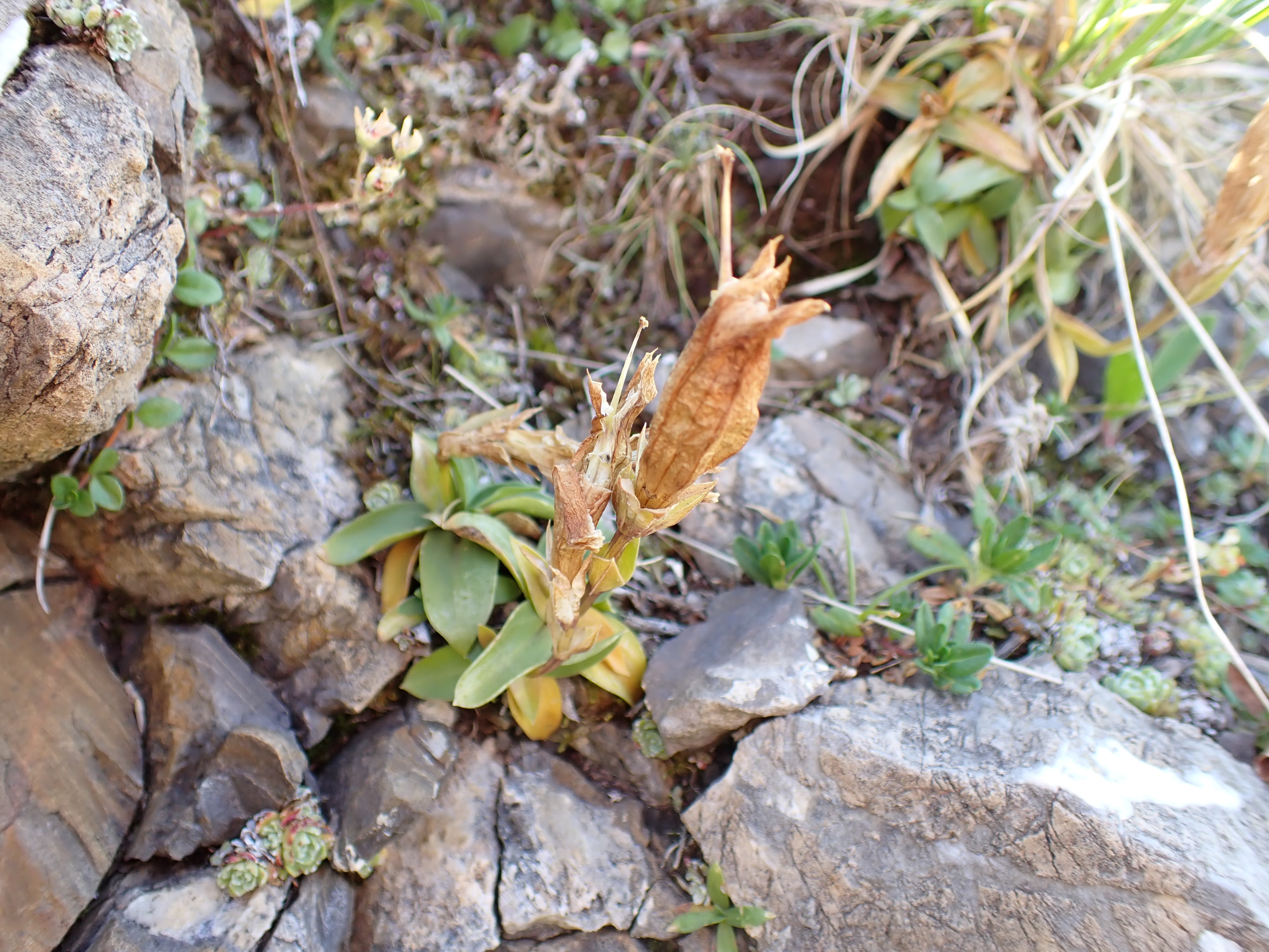 Beim seltenen Alpen-Glocken-Enzian (Gentiana alpina) ist die Innenseite der Kronröhre im oberen Bereich hellgrün, die Rosettenblätter sind auffallend klein und nur wenig länger als breit.
