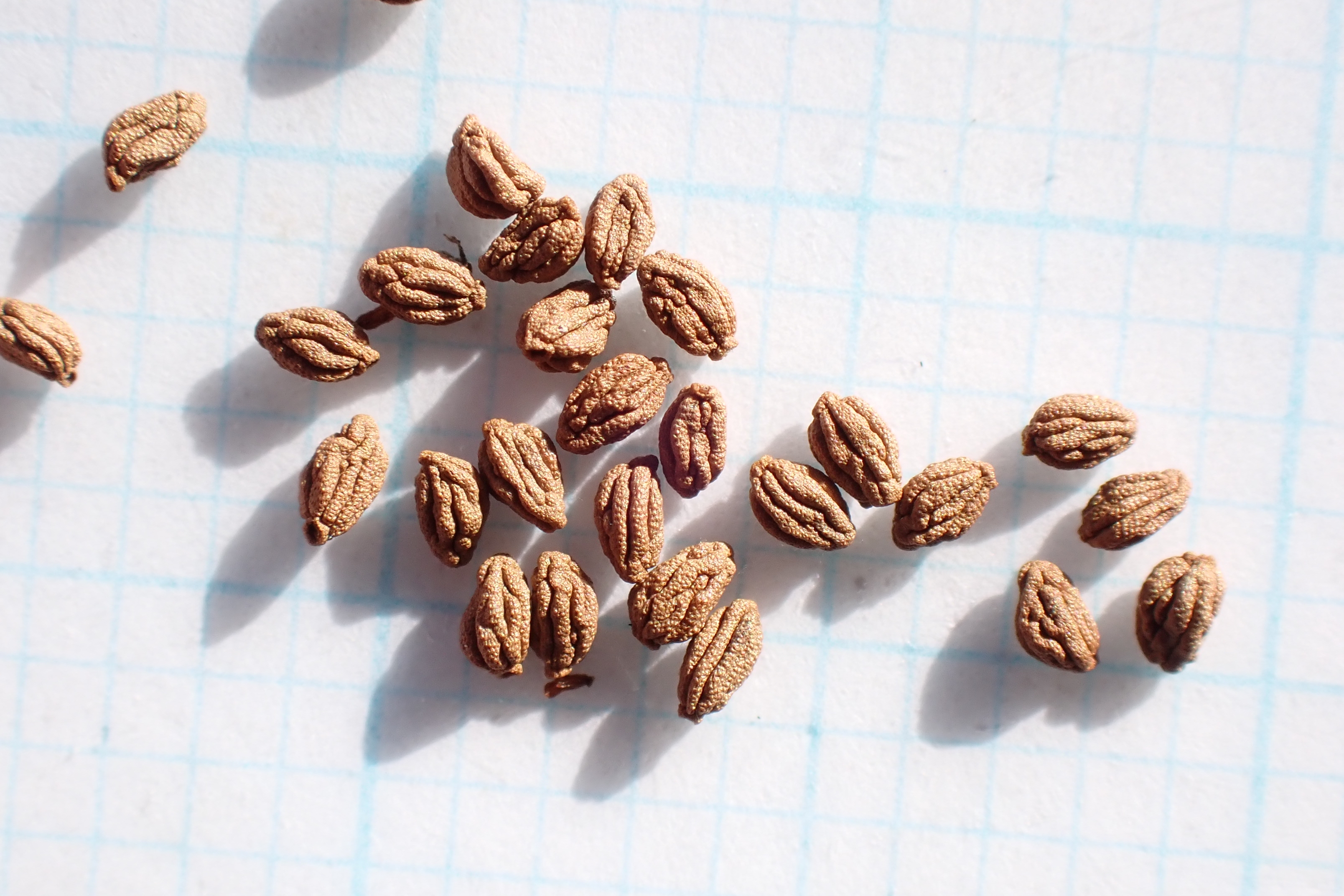 - Samen braun, oval, ca. 1,5 mm lang, Oberfläche breit wulstig.