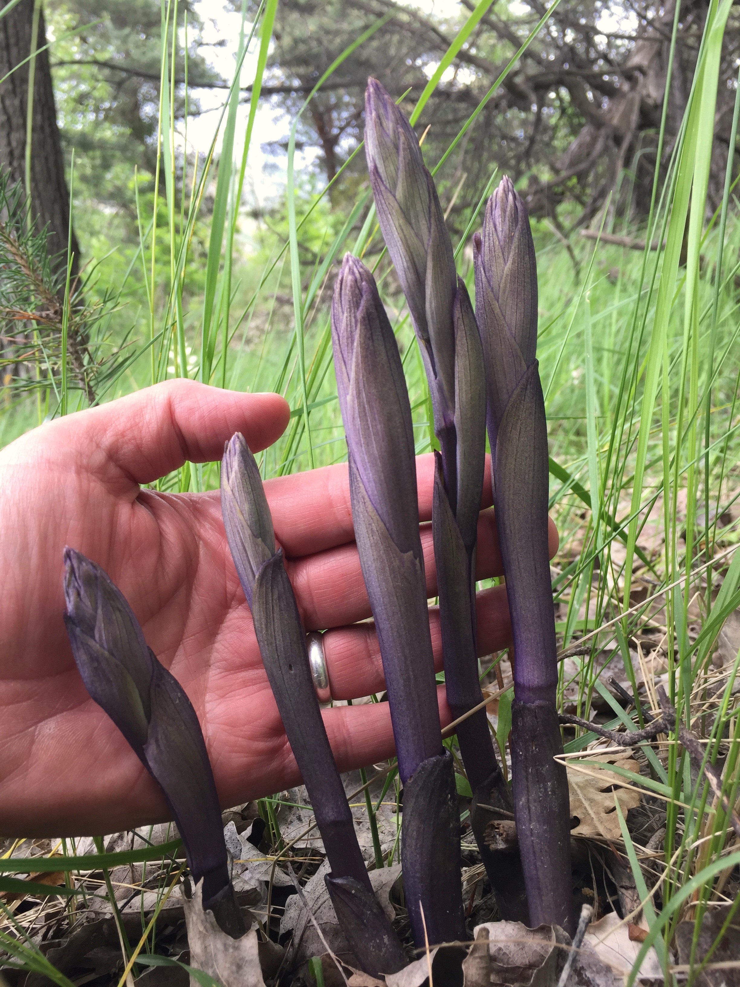 - Stängel kräftig, feingestreift, besonders im unteren Teil stahlblau bis schmutzig-violett, mit scheidenförmigen, blassroten bis braunen Blattschuppen.