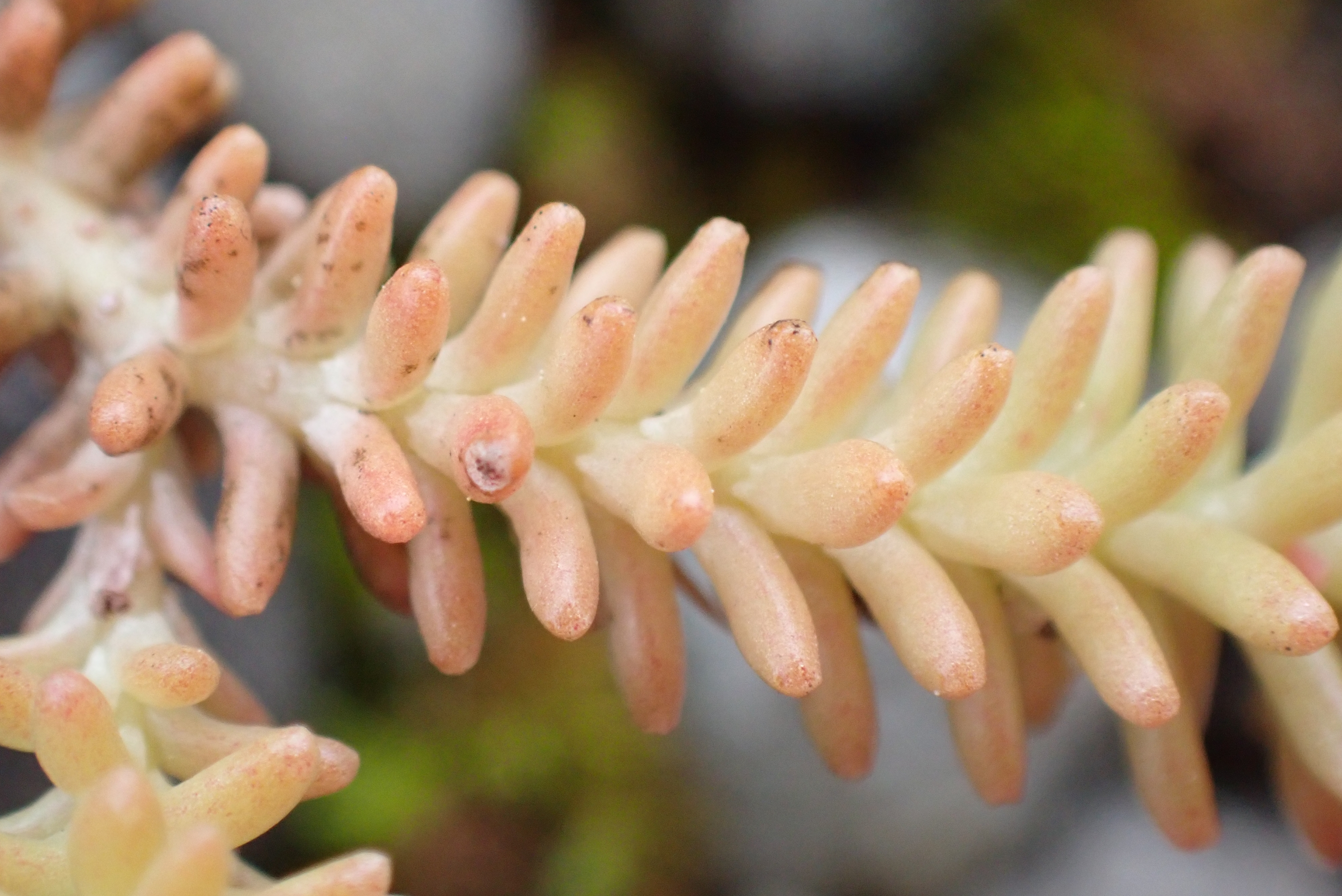 - Blätter an den nichtblühenden Trieben sehr dicht stehend, an den blühenden locker; wechselständig; sitzend; fleischig; sukkulent