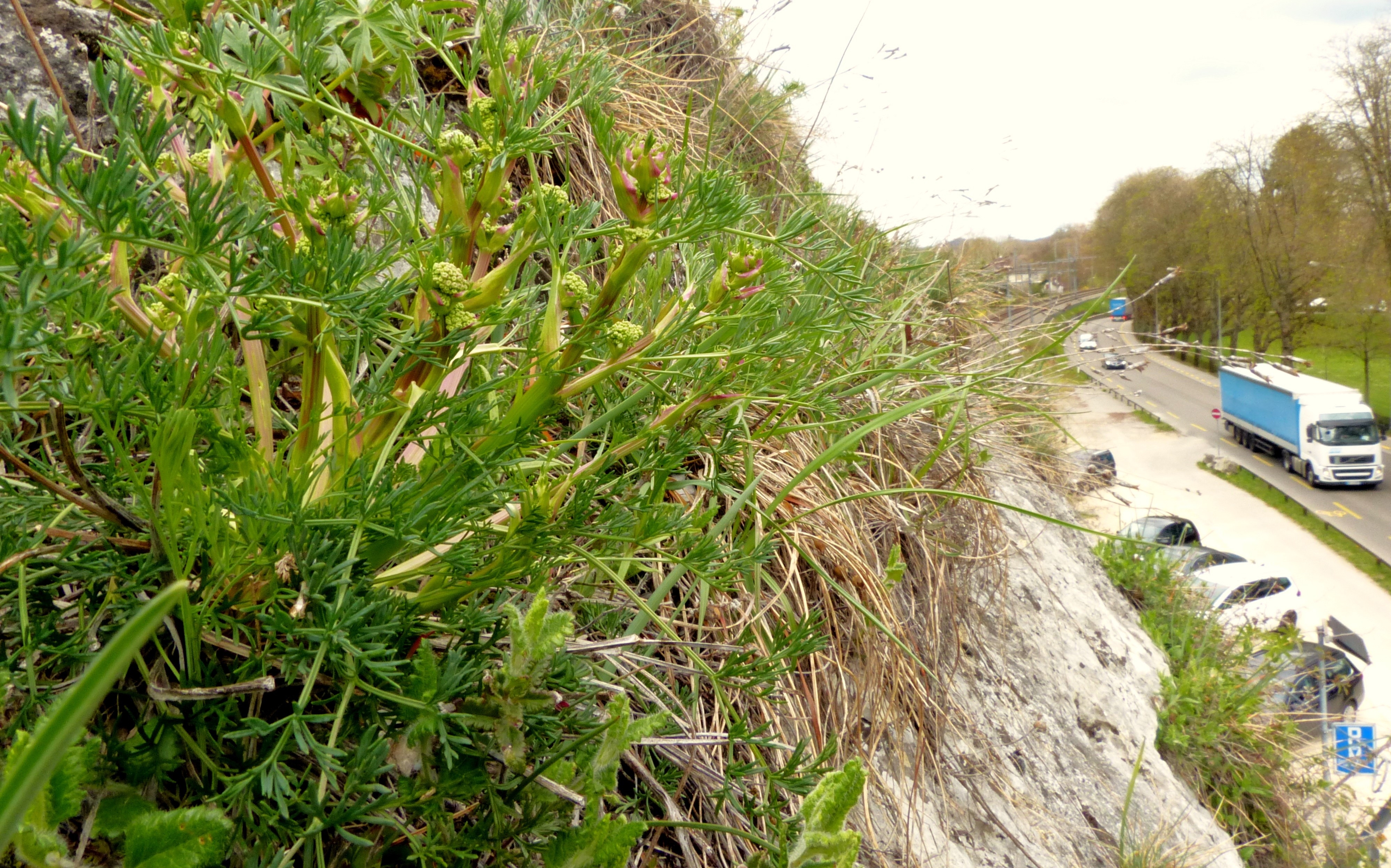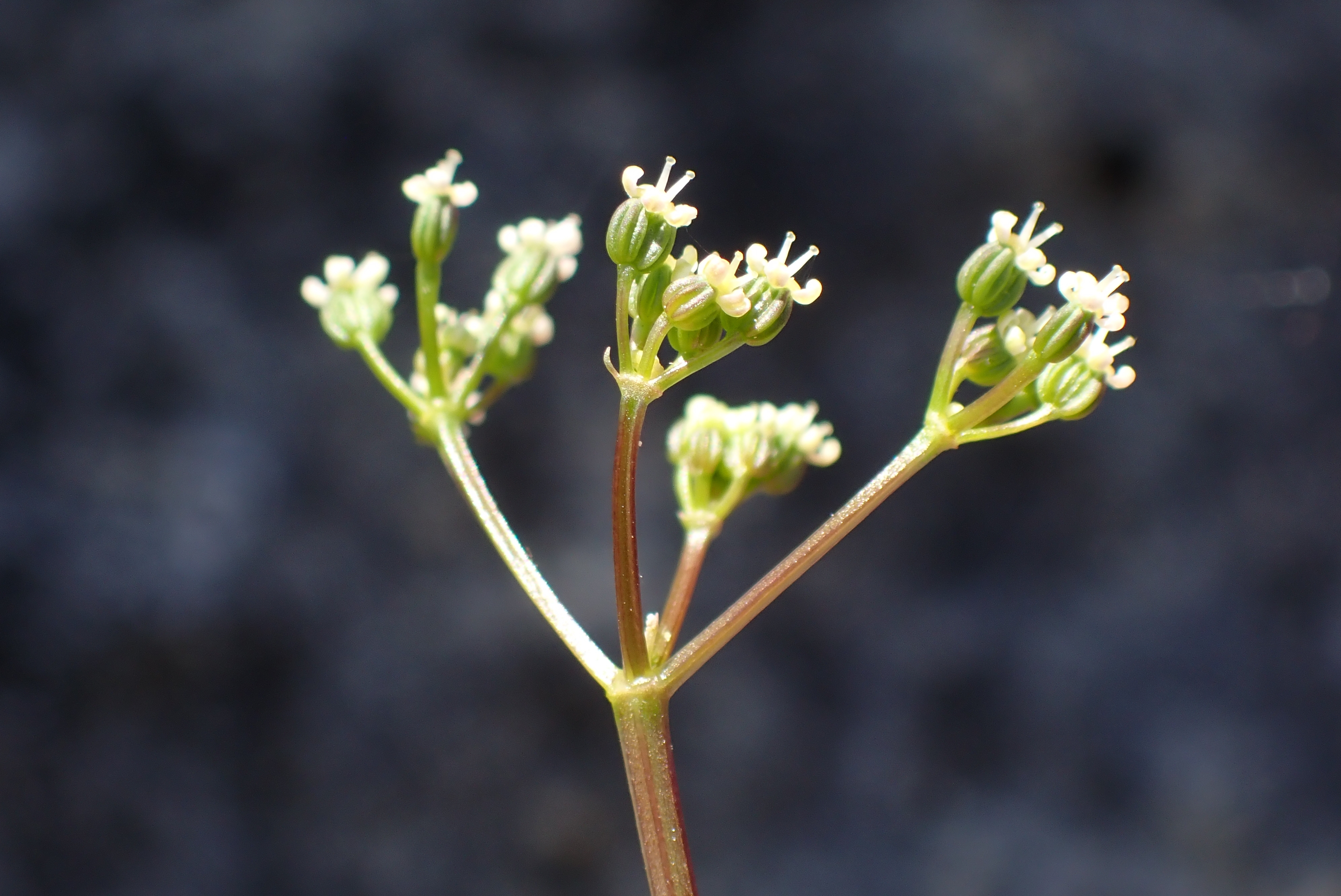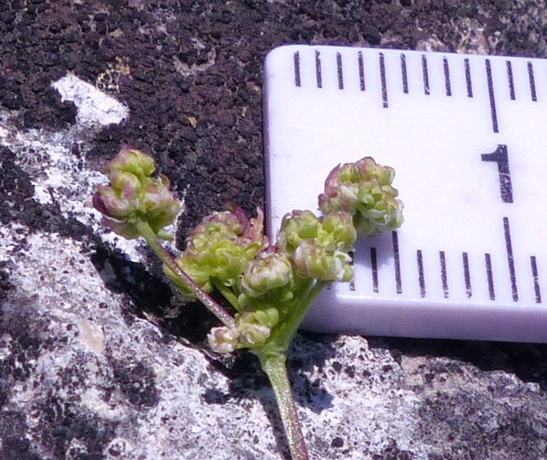 Die weiblichen Döldchen sind beim Aufblühen nur rund 5 mm gross wie die männlichen, werden danach aber viel grösser, hier links fruchtend mit ungleich langen Doldenstrahlen. Biel (BE), 31.5.2021 (Paul Hürlimann)