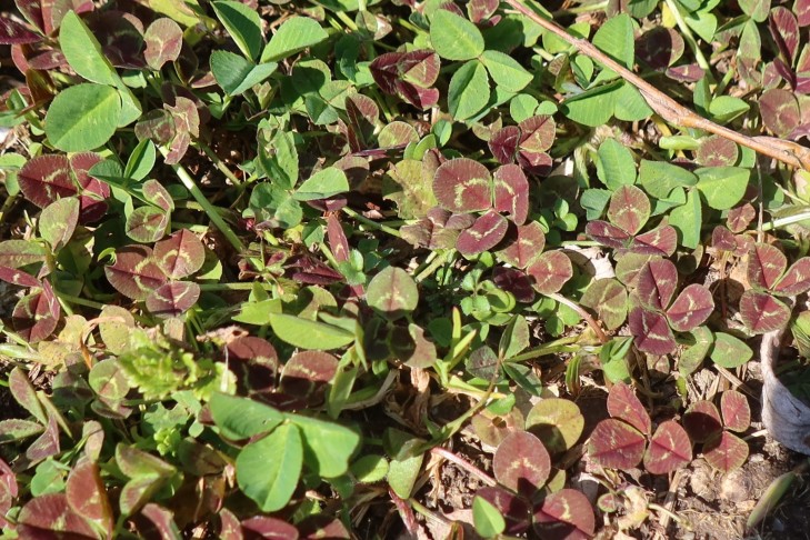 Auch das sind schön gezeichnete Blätter, wahrscheinlich von Trifolium repens. Was ist der Grund für die Rotfärbung? Die Kälte?