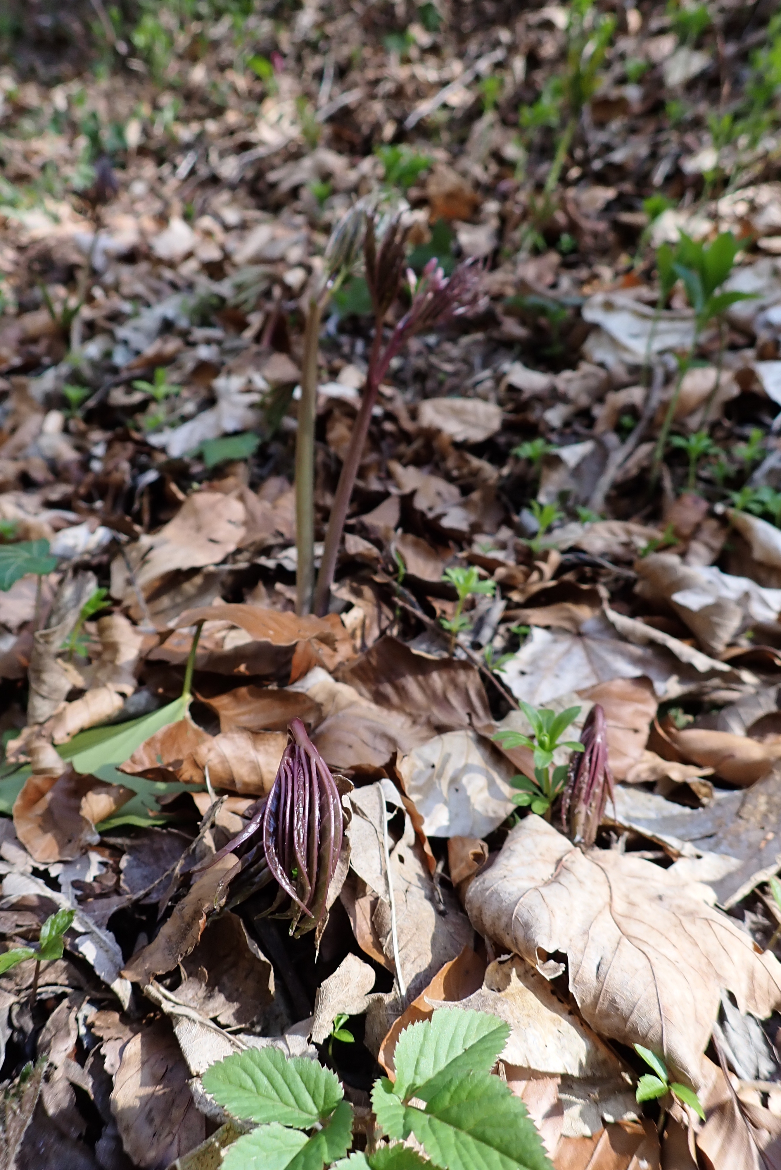 Das Wald-Bingelkraut ist nicht die einzige ausdauernde Art, welche die jungen Triebe im Frühling umgeklappt durch den Boden ans Licht schickt. Auch die Zahnwurz-Arten (Untergattung Dentaria) zeigen nickende junge Triebe (Fotos von Cardamine heptaphylla unten). Und gemäss Literatur sollten auch die jungen Triebe des Waldmeisters (Galium odoratum / Asperula odorata) umgeklappt in die neue Saison starten.