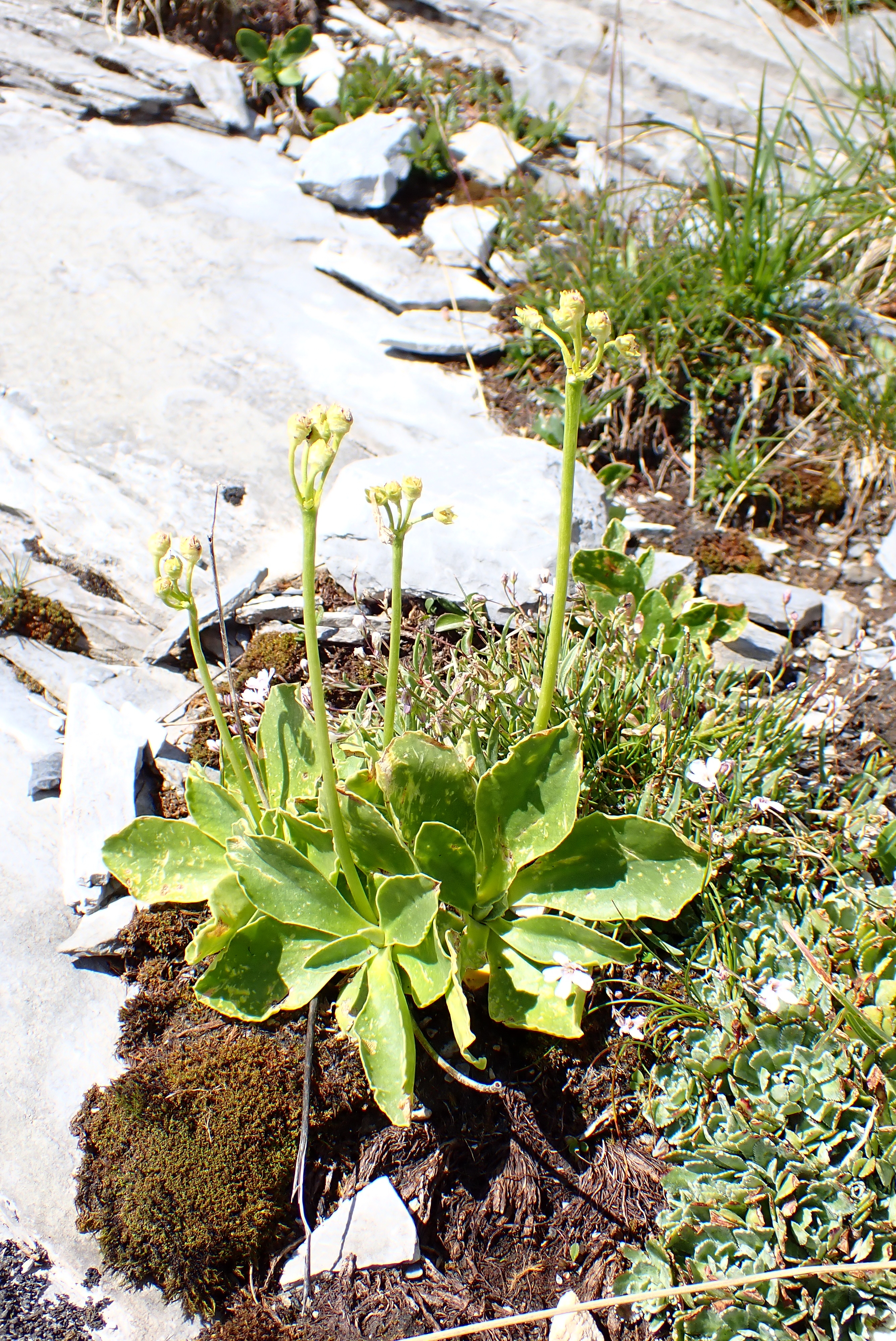 An Standorten, wo die Aurikel (Primula auricula) und die Rote Felsen-Primel (Primula hirsuta) nahe beieinander wachsen, bildet sich leicht die fertile Hybride Primula (×) pubescens: