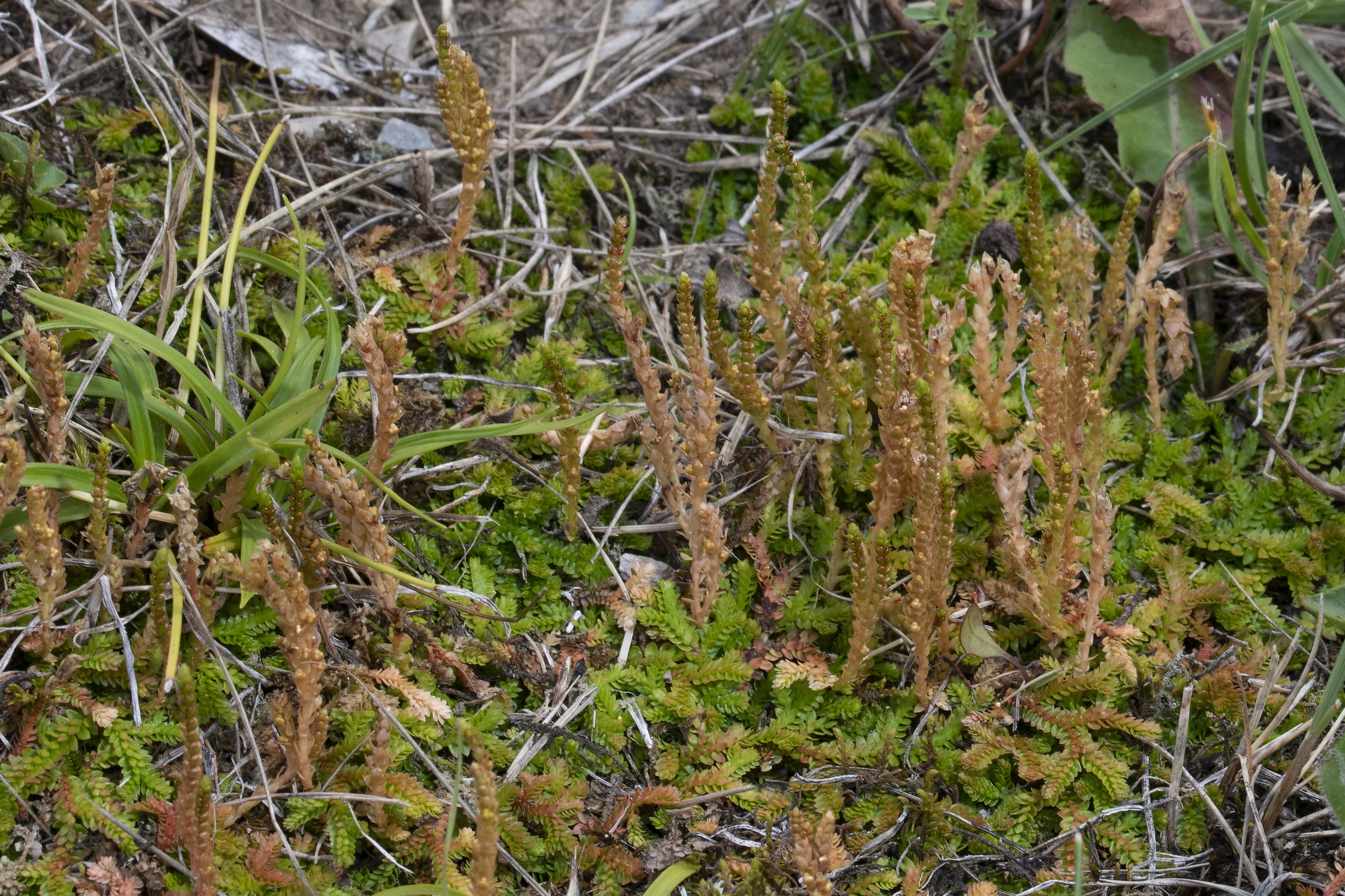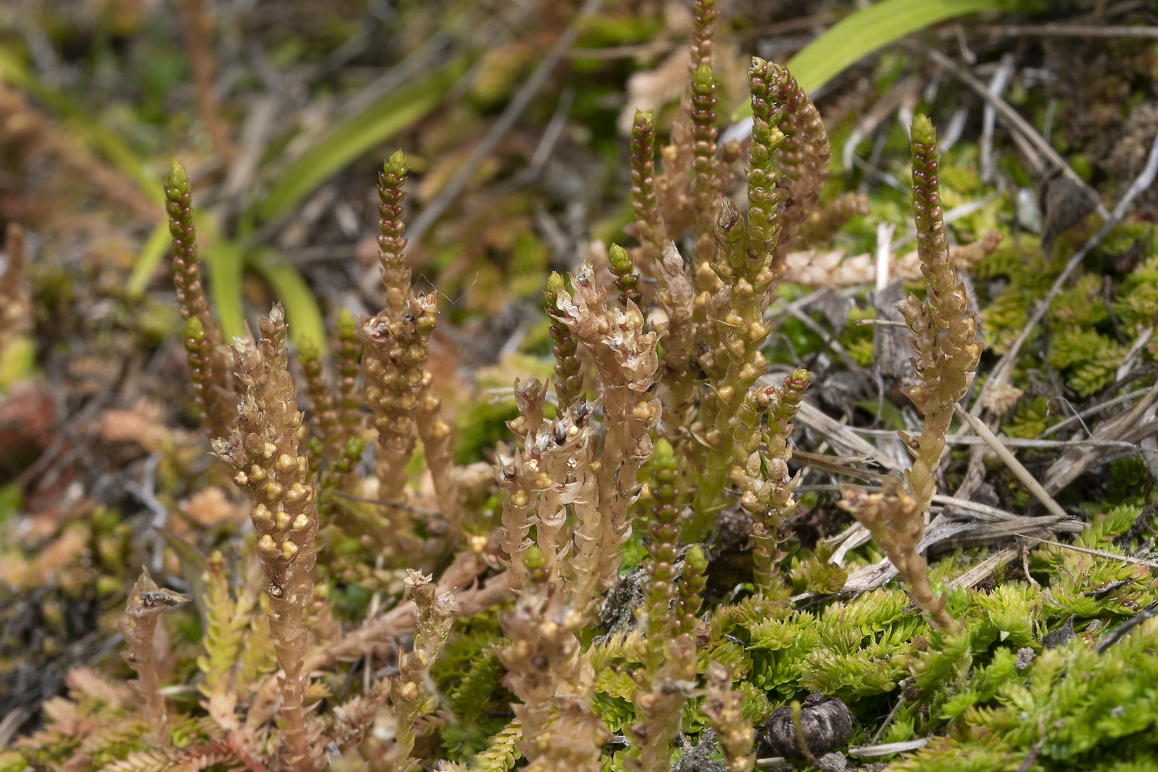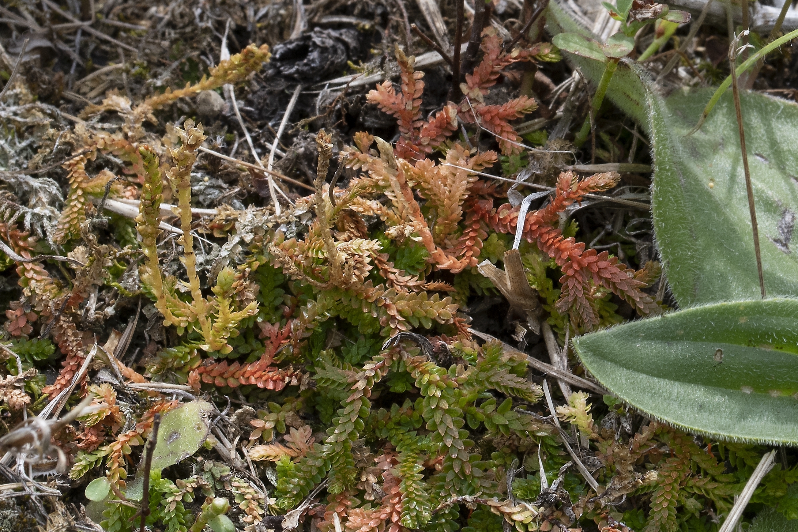 Der Dornige Moosfarn (Selaginella selaginoides) besitzt runde (nicht abgeflachte), nur kurz kriechende Sprosse, die Blätter sind alle gleich gestaltet und spiralig (nicht gegenständig) angeordnet.